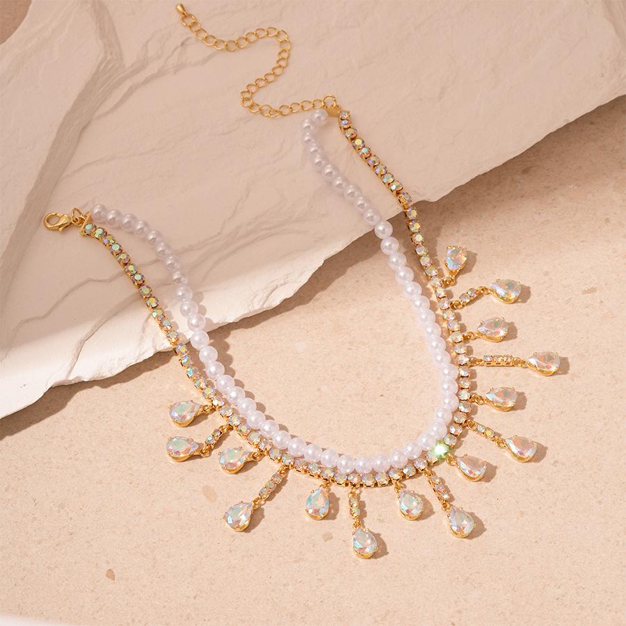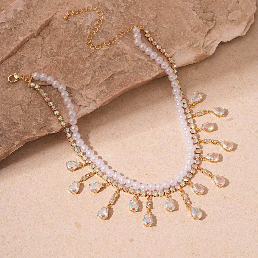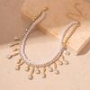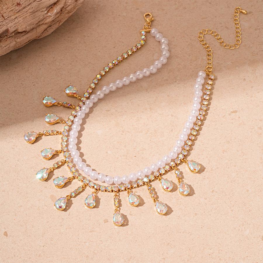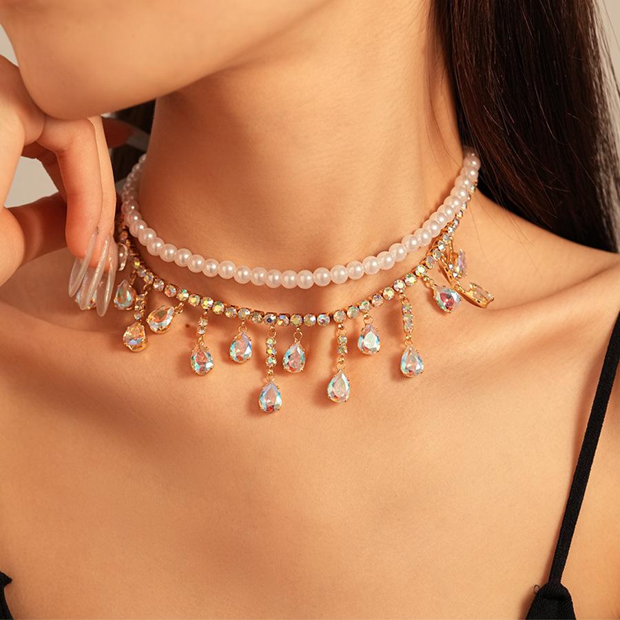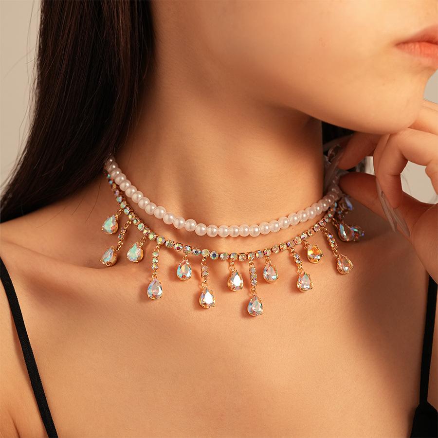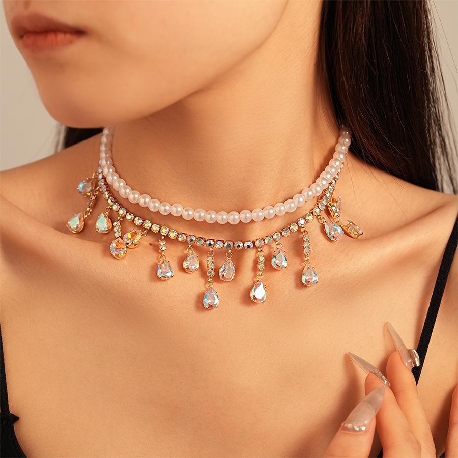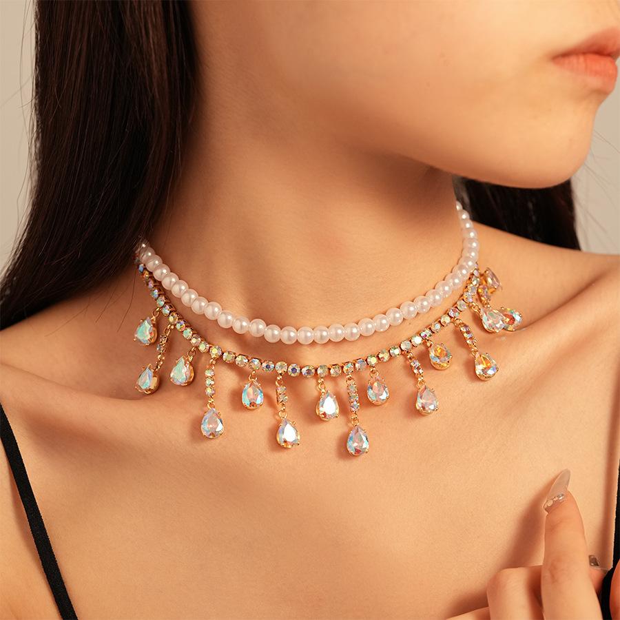 Collar de clavícula de doble capa con perlas de imitación de diamante y gotas de agua de circón de lujo ligero, elegante collar de alta calidad de nicho europeo y americano para mujer