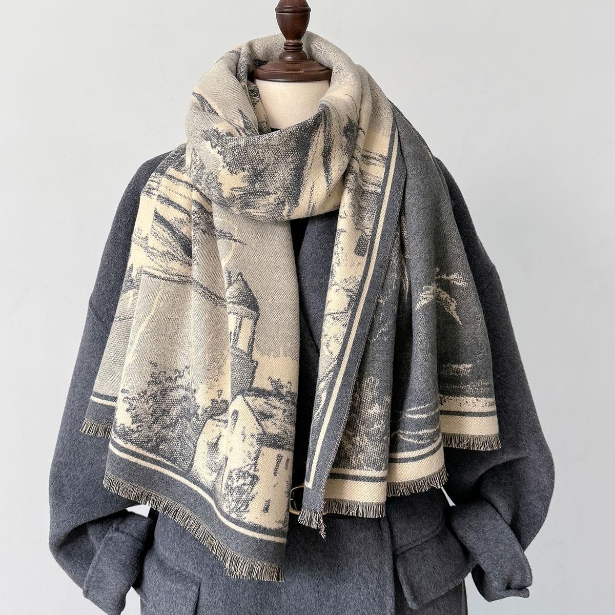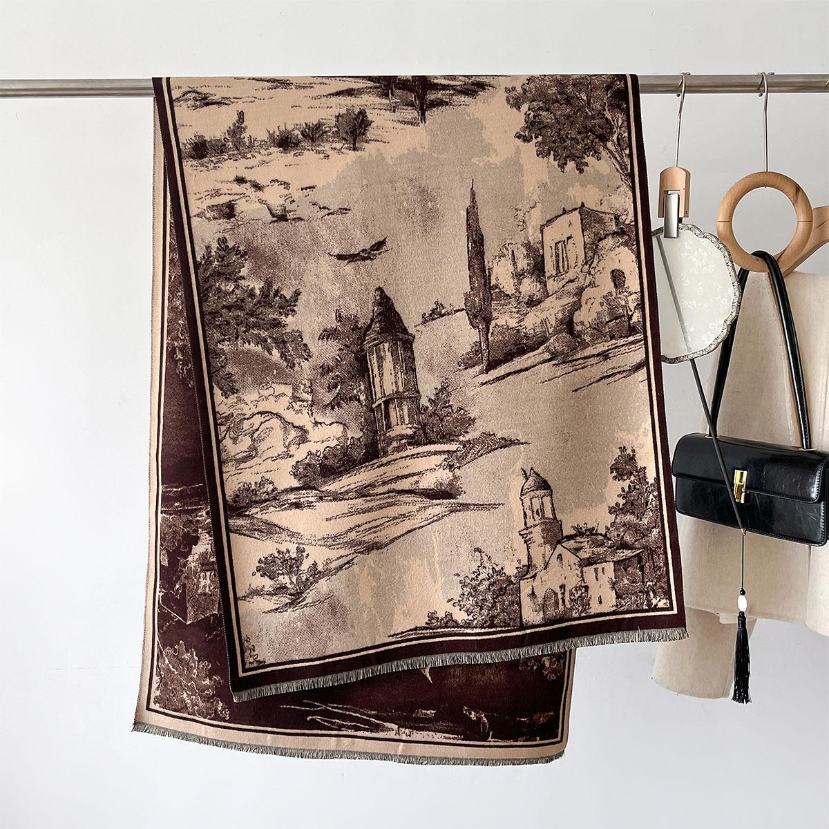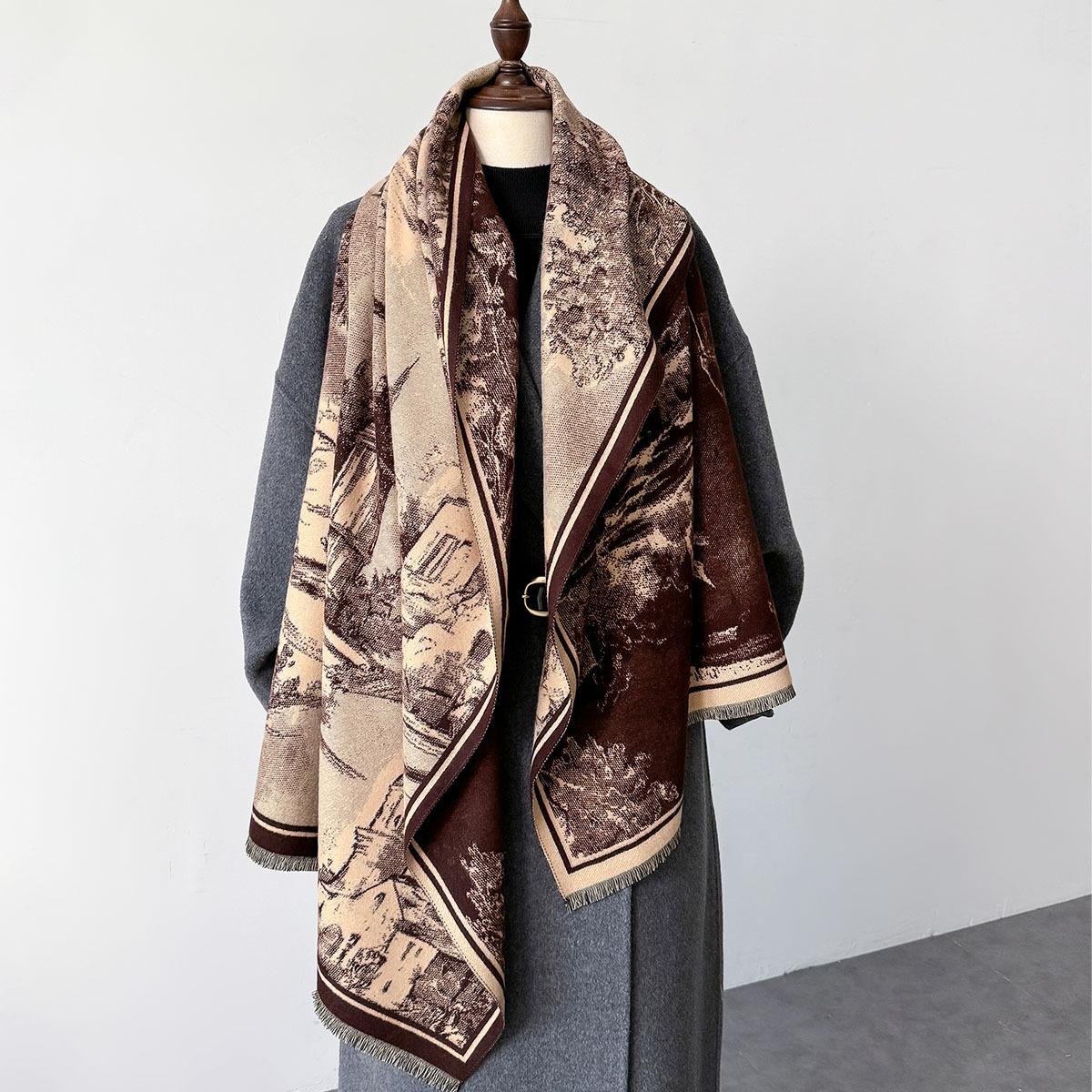 Chal de cuello cálido de invierno estilo coreano, combinable con todo, nuevo estilo 2024, bufanda de cachemira sintética de alta gama con estilo retro de pintura al óleo para mujer