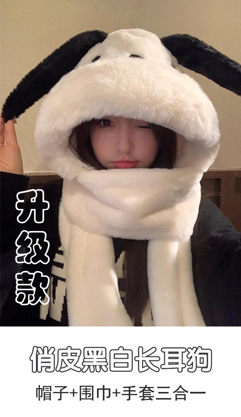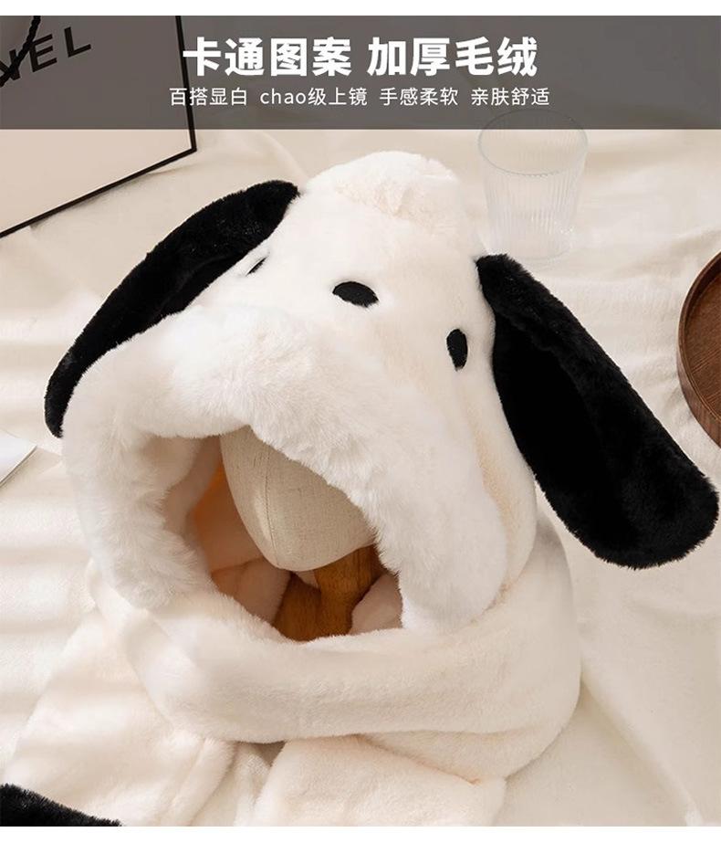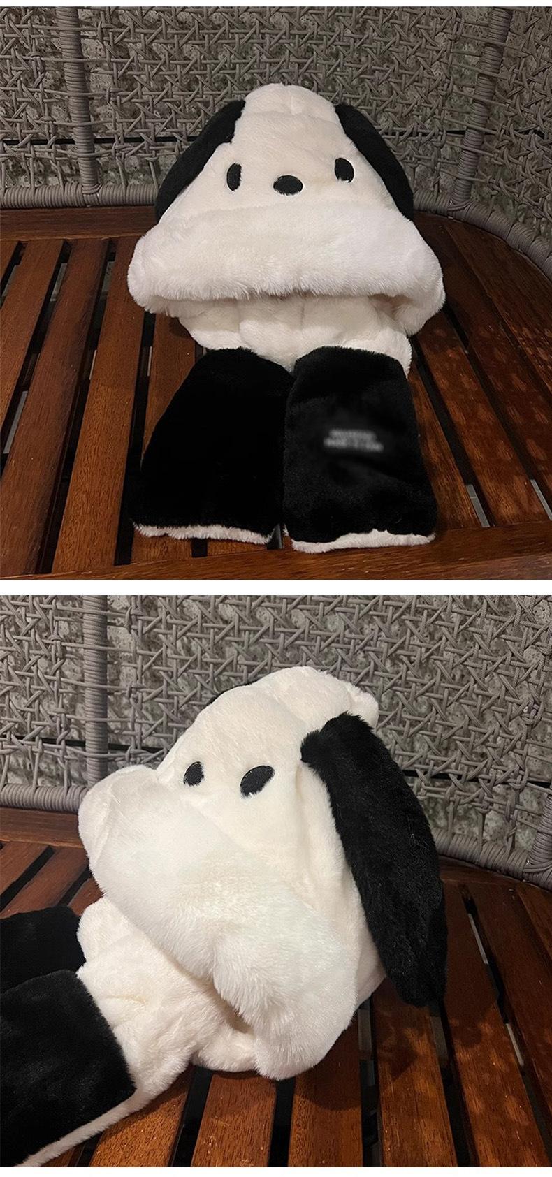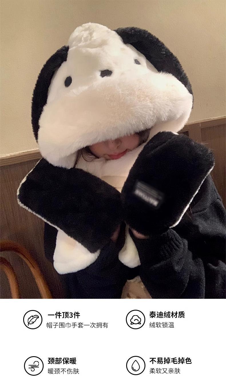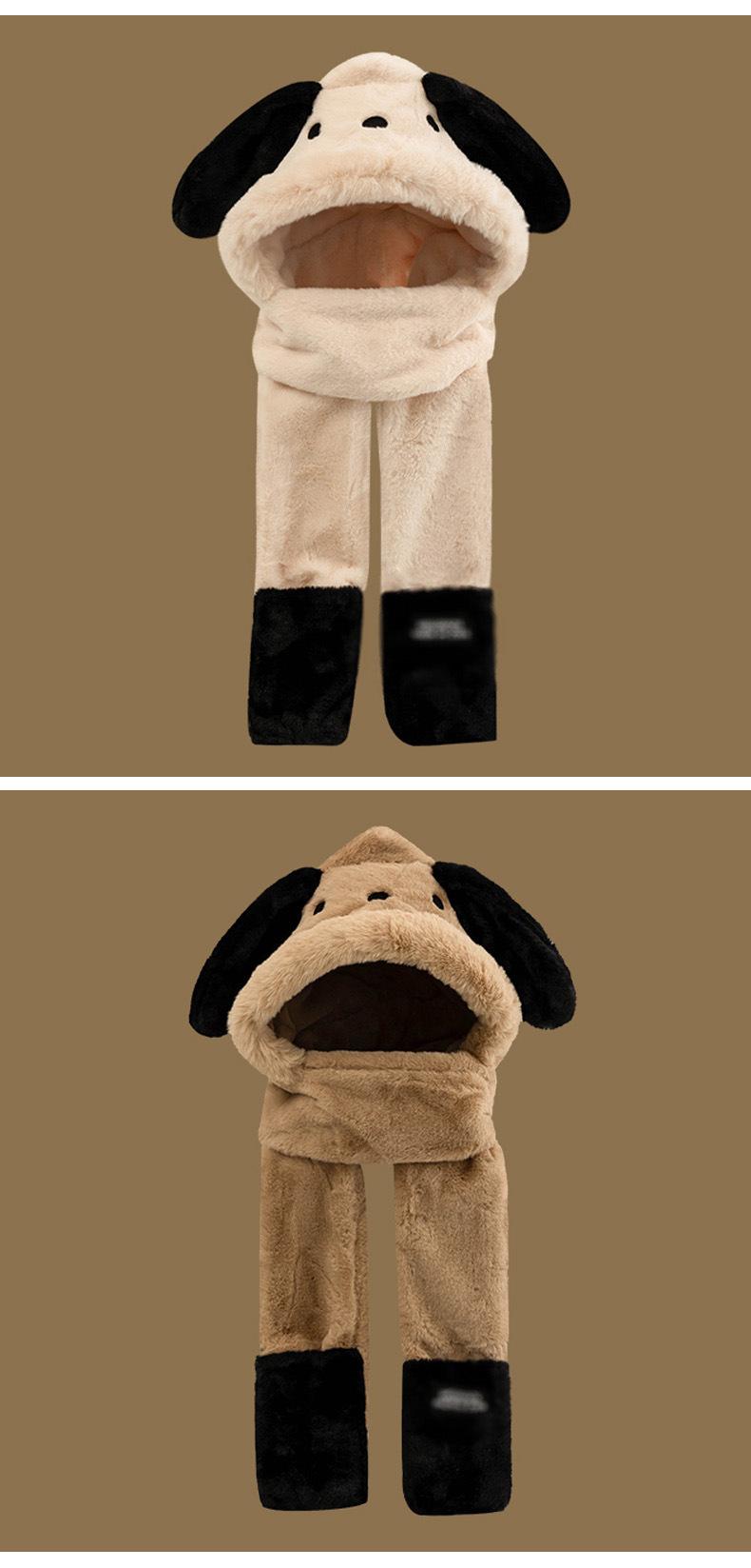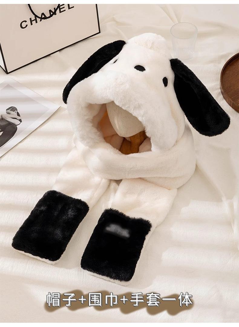 Gorro de invierno para mujer, bonito cachorro de Pacha de peluche, grueso, bufanda, guantes, capucha de una pieza, cuello cálido, conjunto de tres piezas