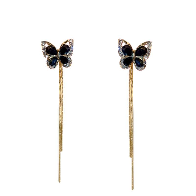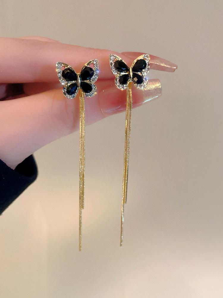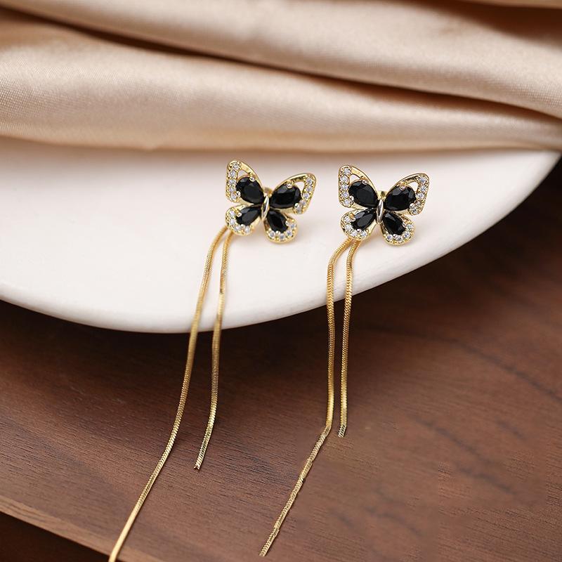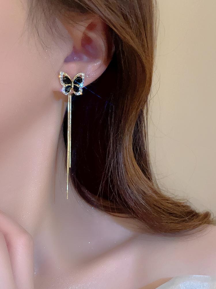 Pendientes de aguja de plata S925 con diseño de mariposa y borlas negras elegantes, 2024, nuevos pendientes de lujo ligeros de nicho para mujer.