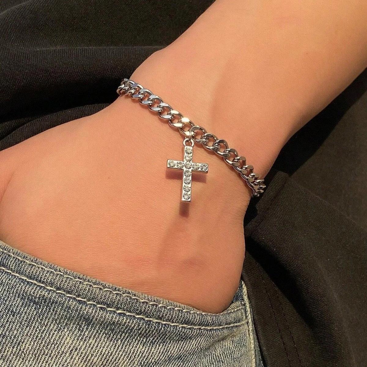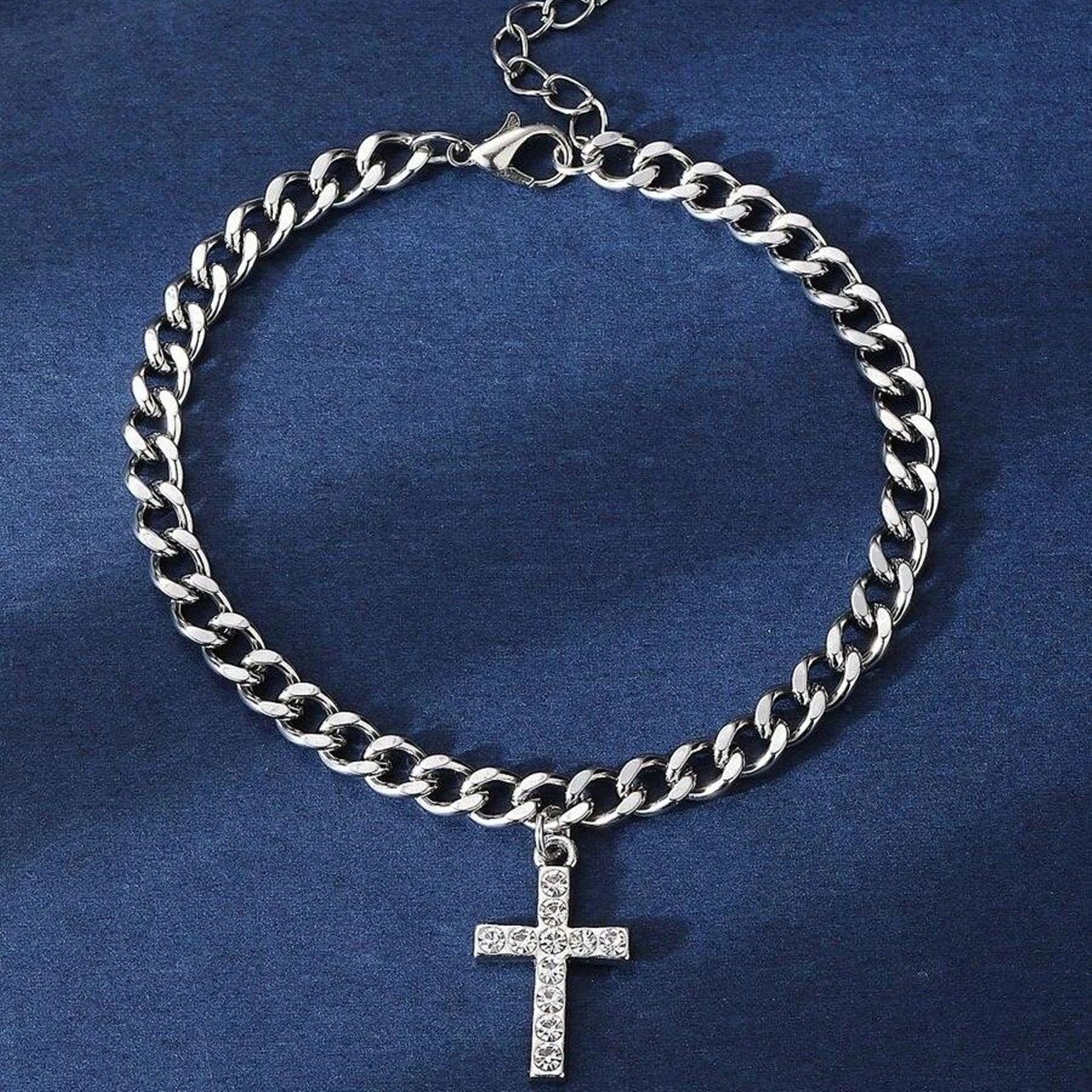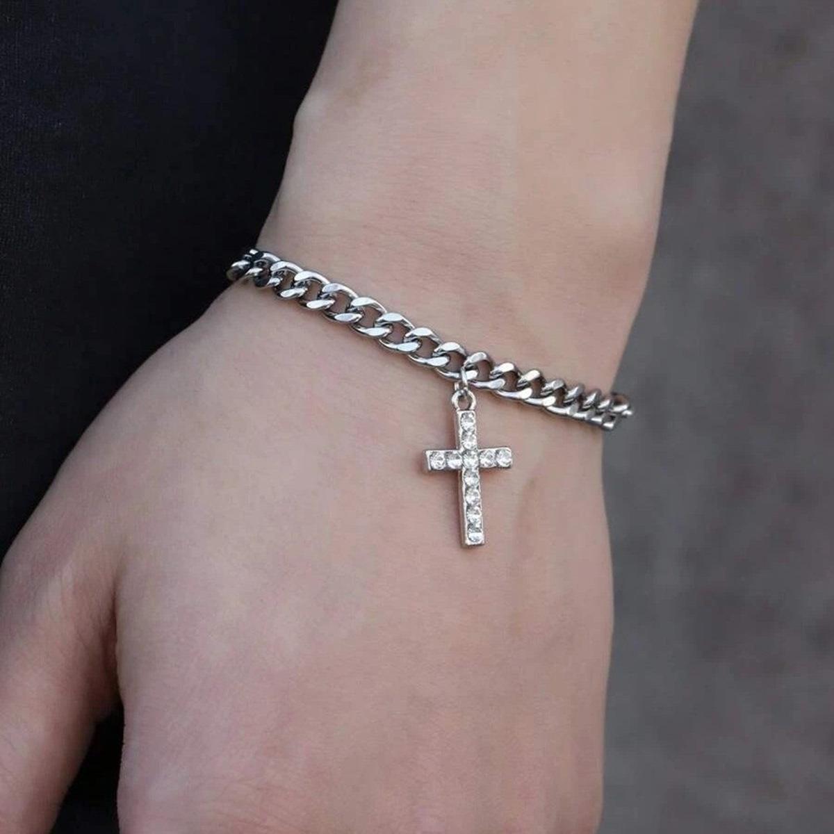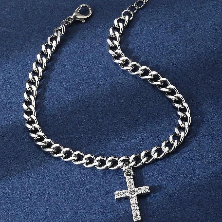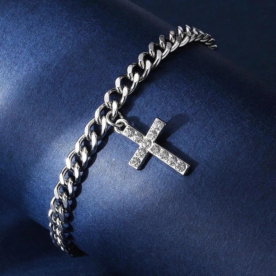 Pulsera de Cadena Gruesa Estilo Punk Moda Transfronteriza Europea y Americana para Hombre con Colgante de Cruz de Diamantes de Tendencia de Personalidad