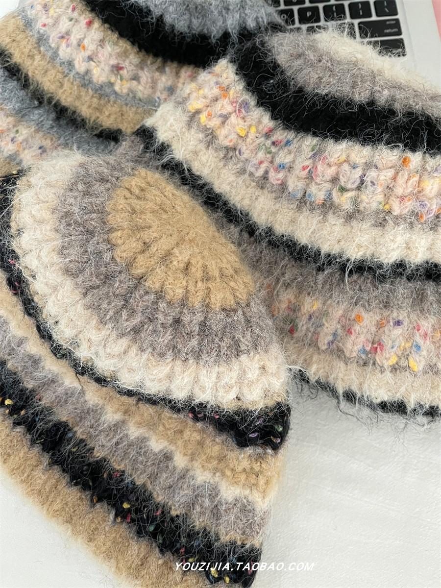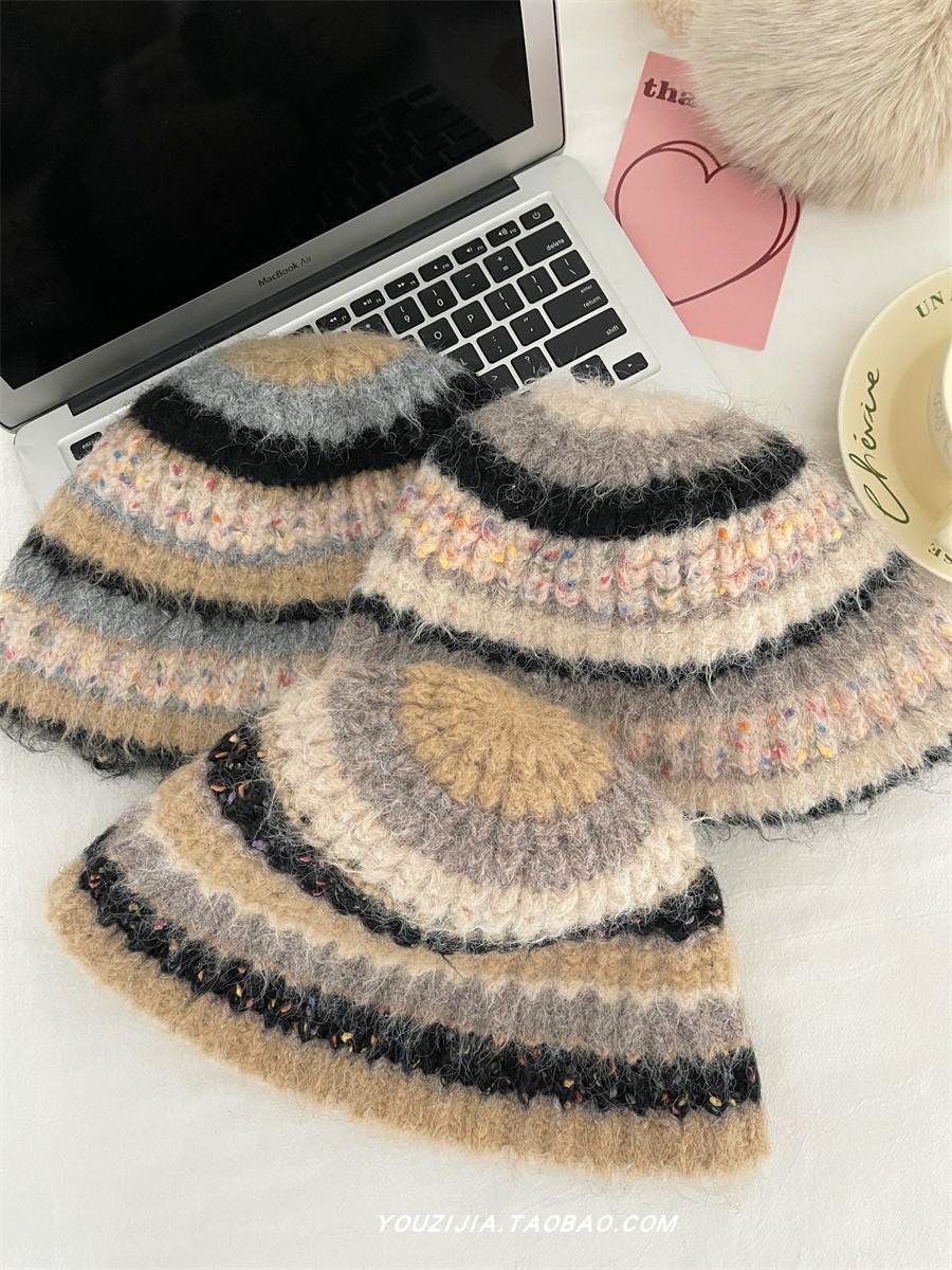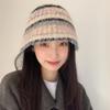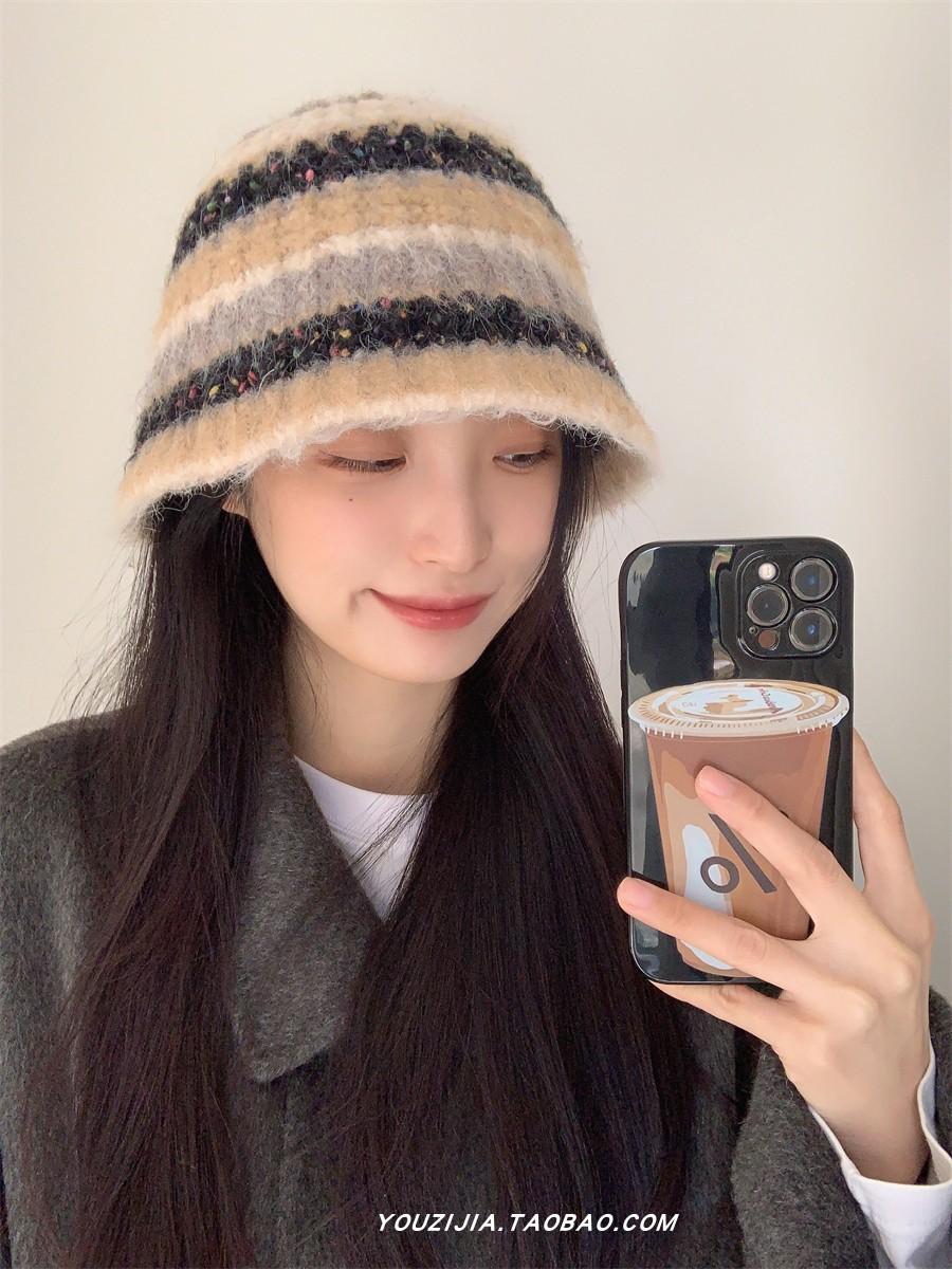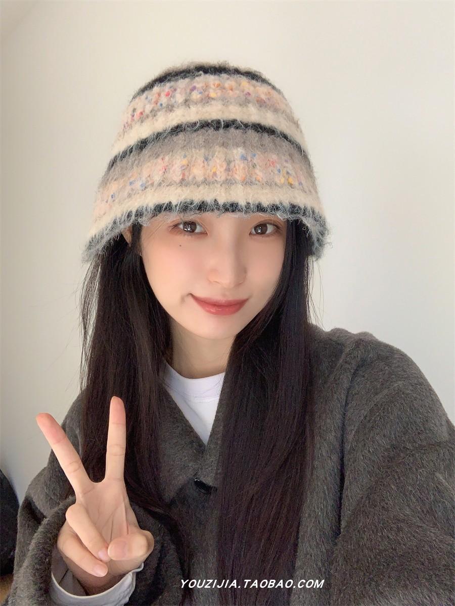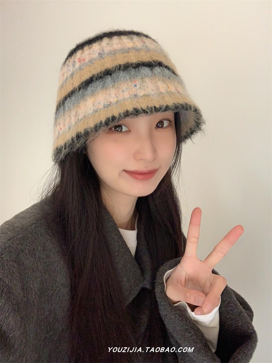 Gorro de punto de felpa con costuras de colores contrastantes para mujer, nuevo estilo coreano, moda de otoño e invierno, elegante gorro de pescador de lana con orejas