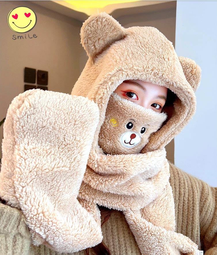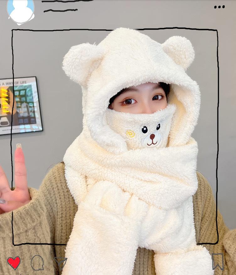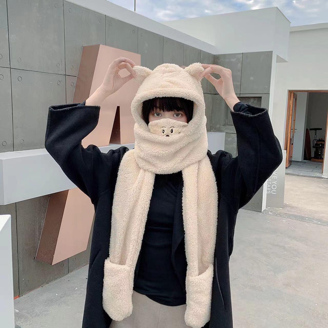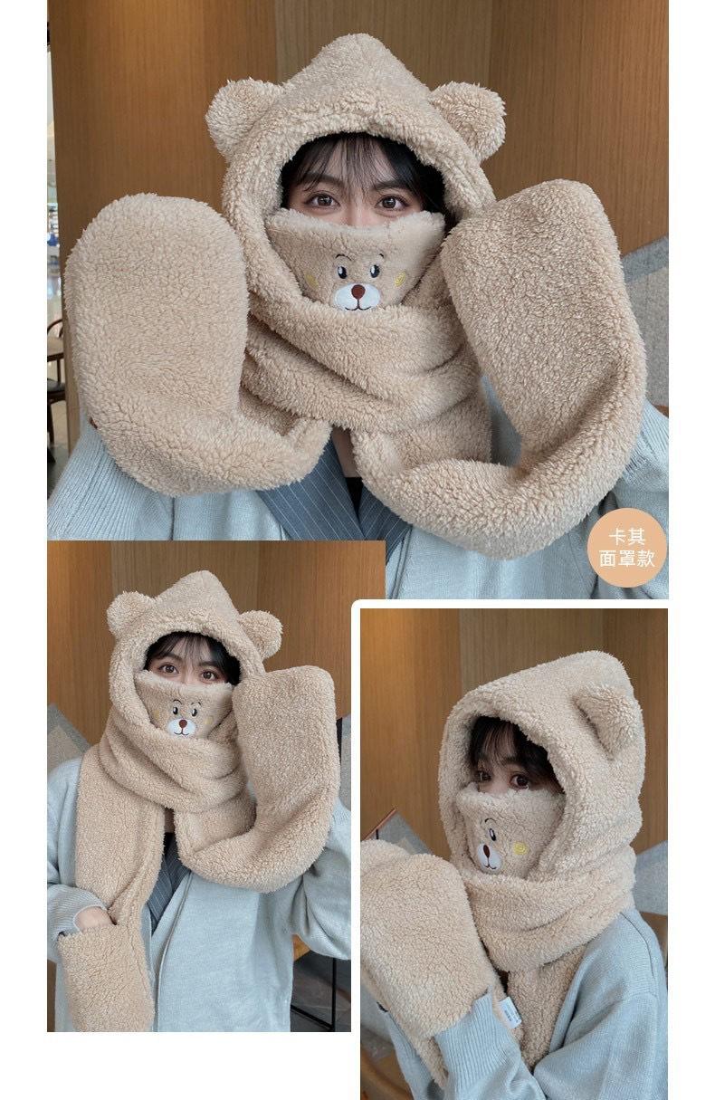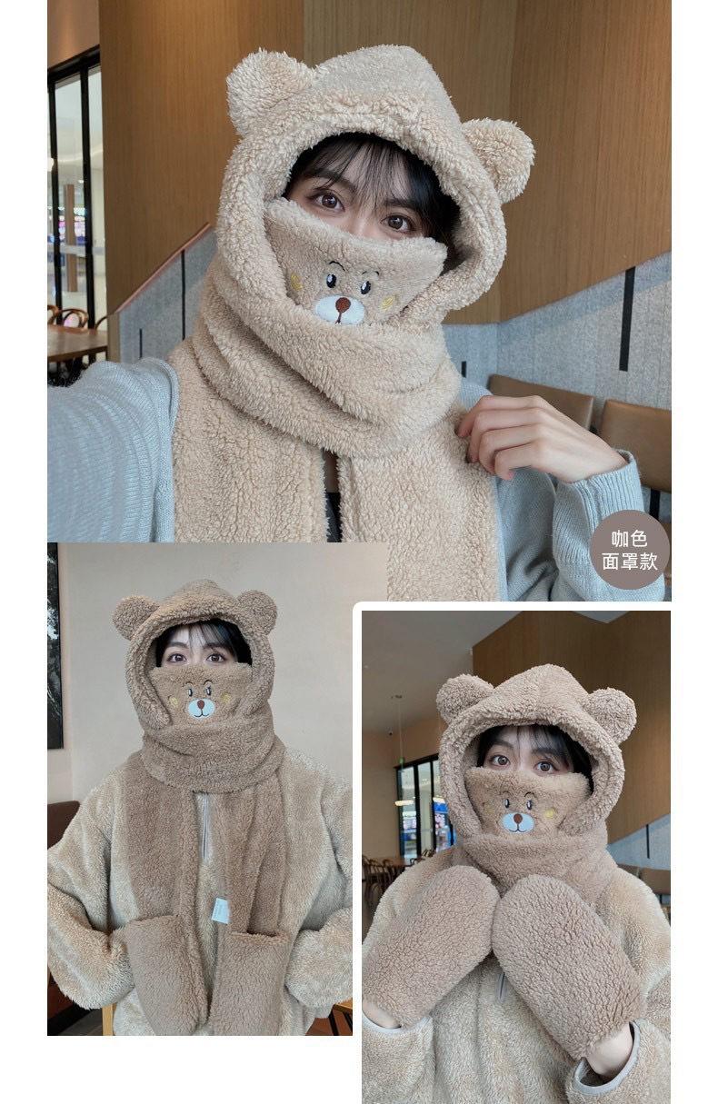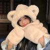Sombrero de Máscara de Oso de Otoño e Invierno Bufanda de Invierno Linda Guantes Todo en Uno Cuello con Capucha Conjunto Lindo Cálido de Cuatro Piezas para Mujer