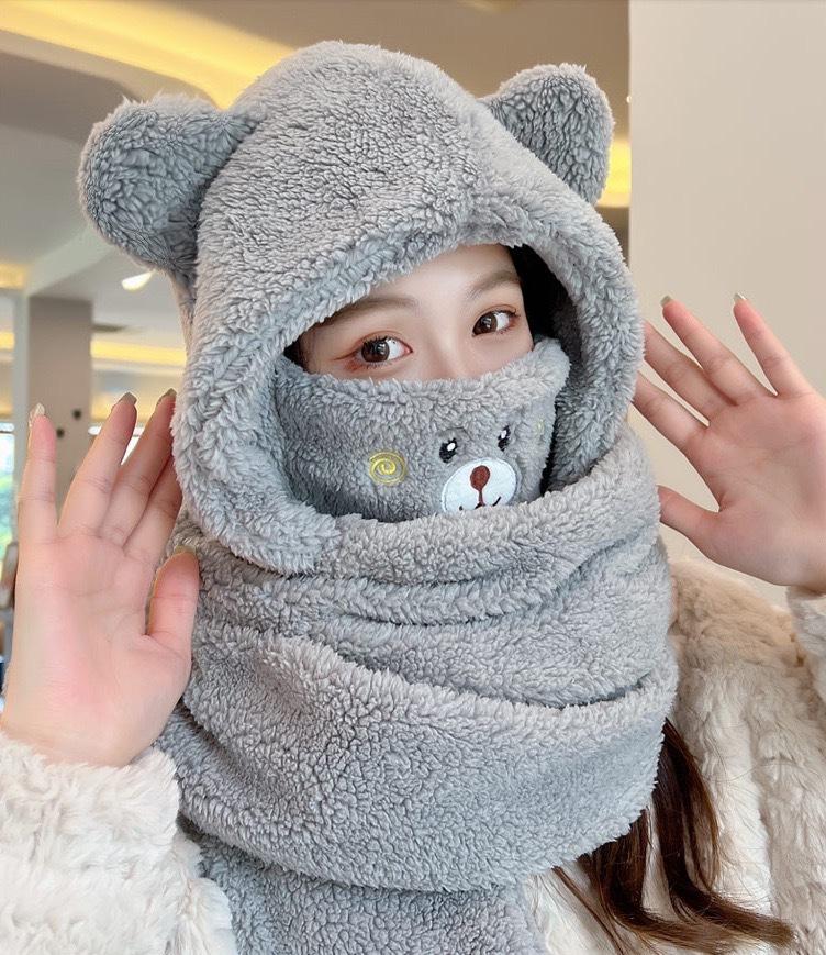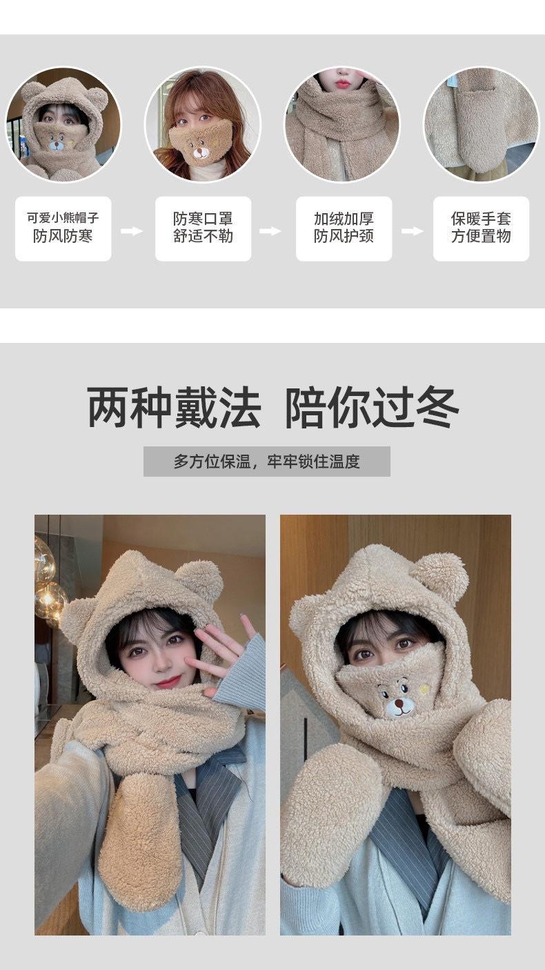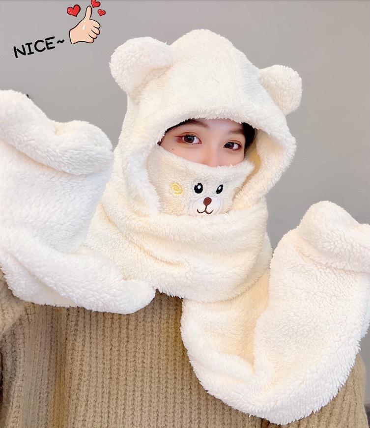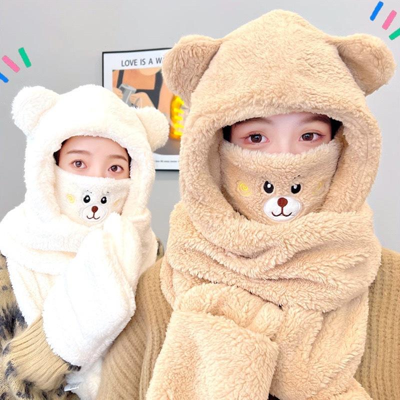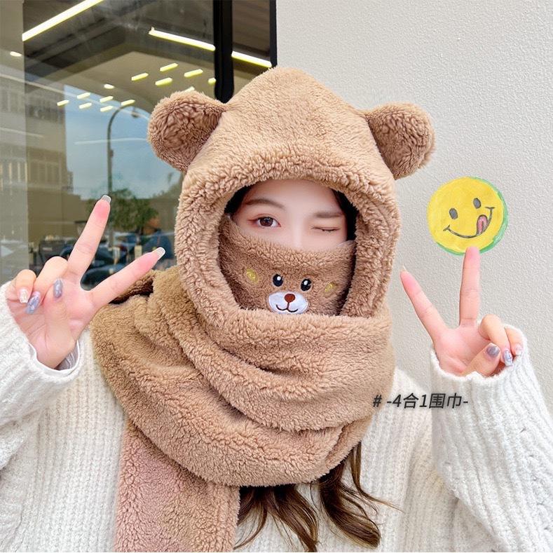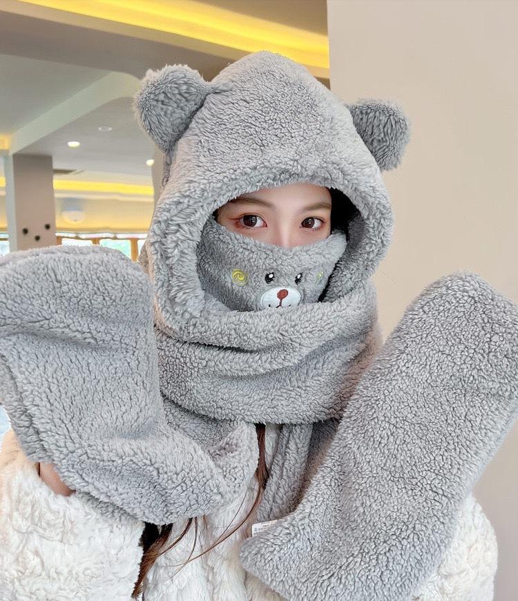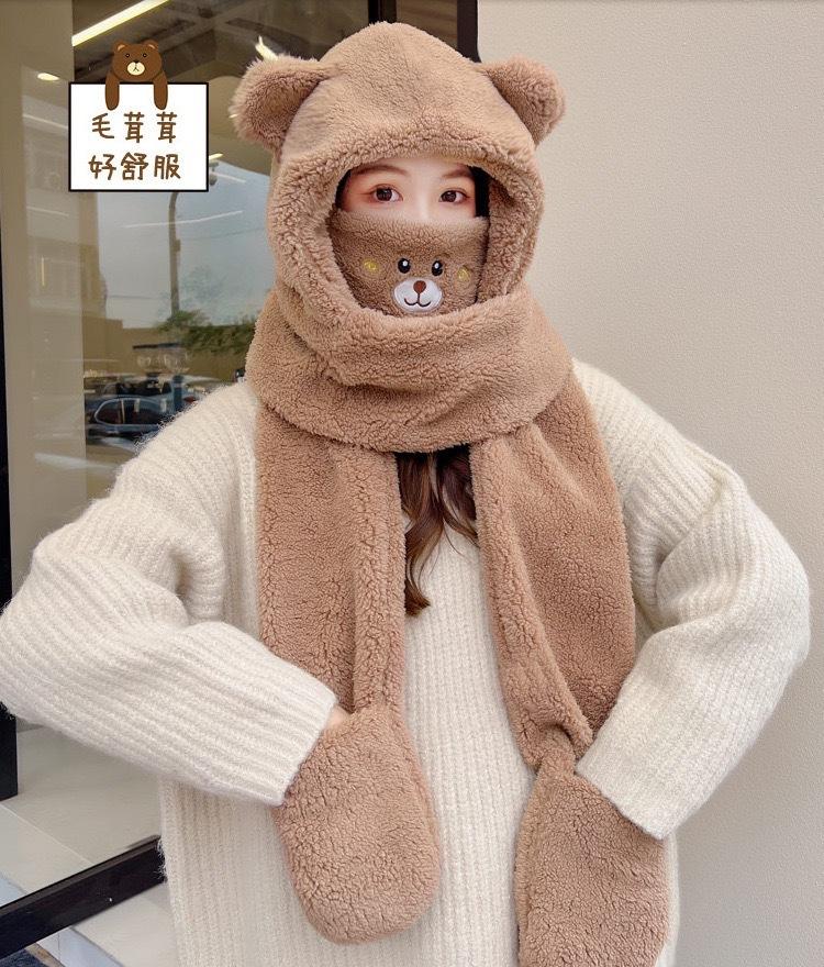 Sombrero de Máscara de Oso de Otoño e Invierno Bufanda de Invierno Linda Guantes Todo en Uno Cuello con Capucha Conjunto Lindo Cálido de Cuatro Piezas para Mujer