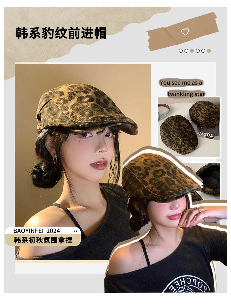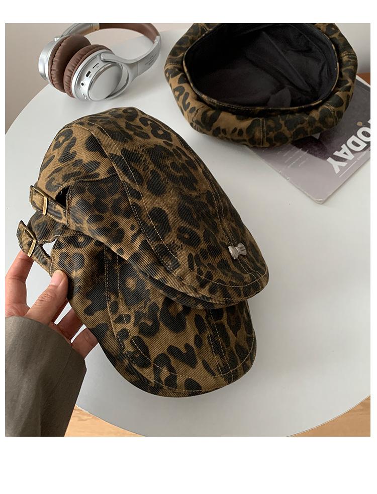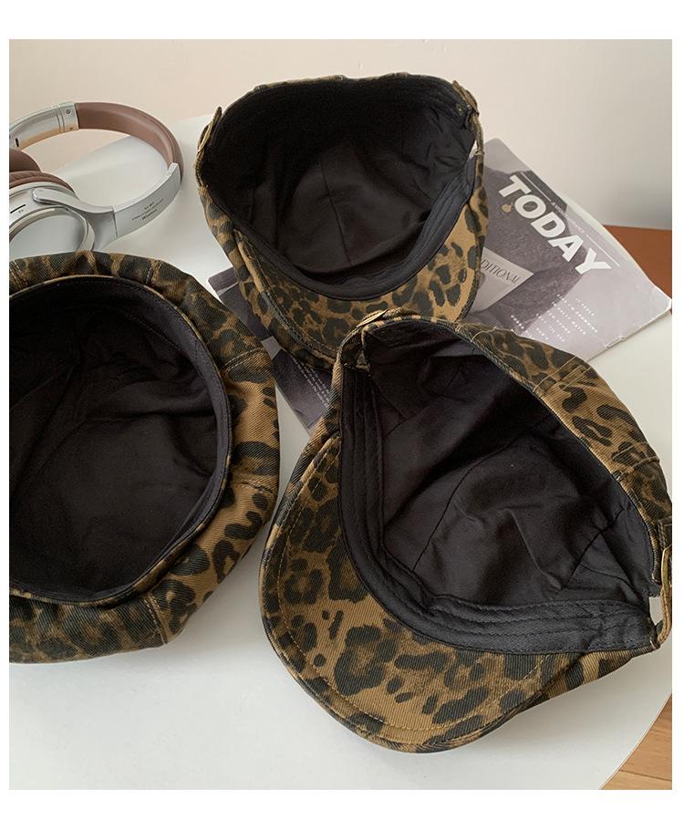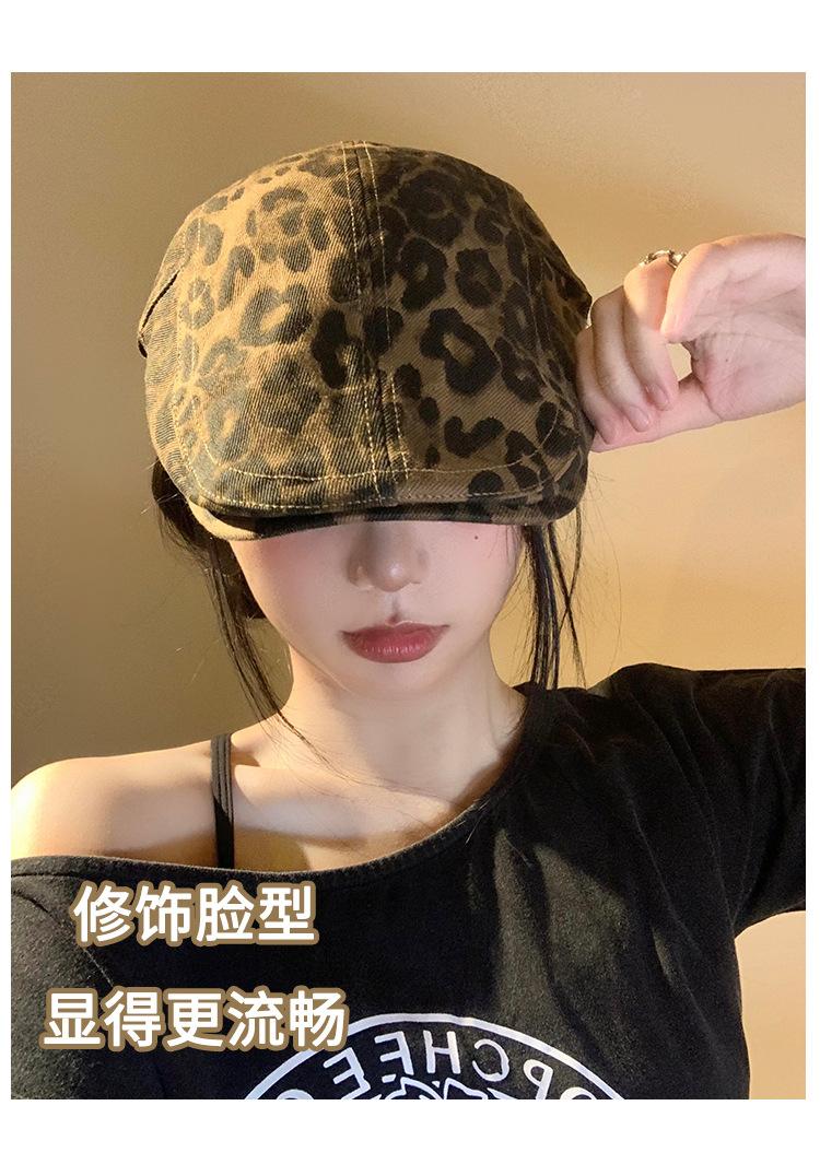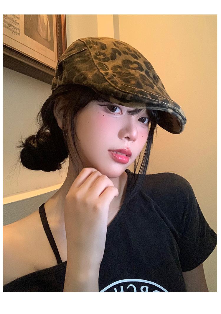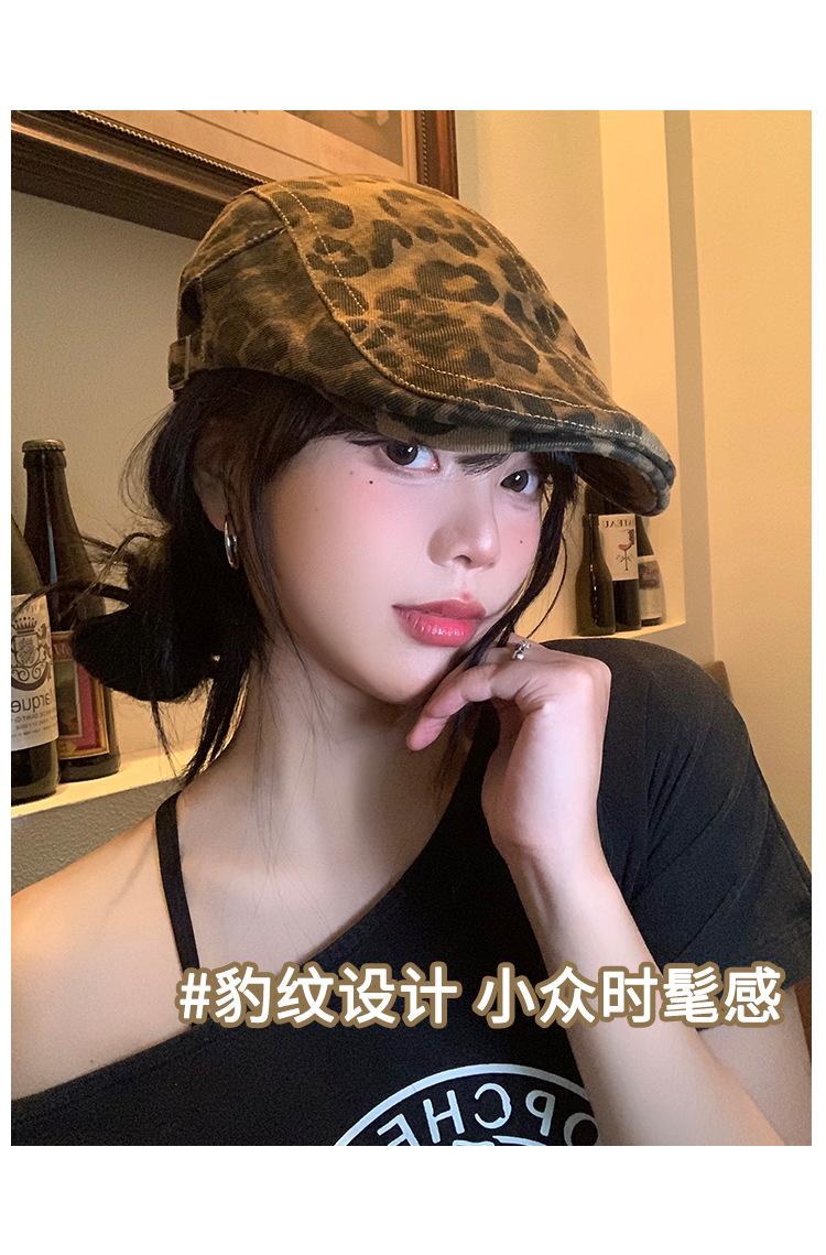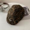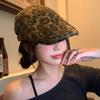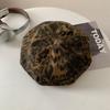 Boina con estampado de leopardo estilo Spice Girl estilo retro americano para mujer, estilo otoño, estilo Y2K, con cabeza grande, combina con todo y luce genial.
