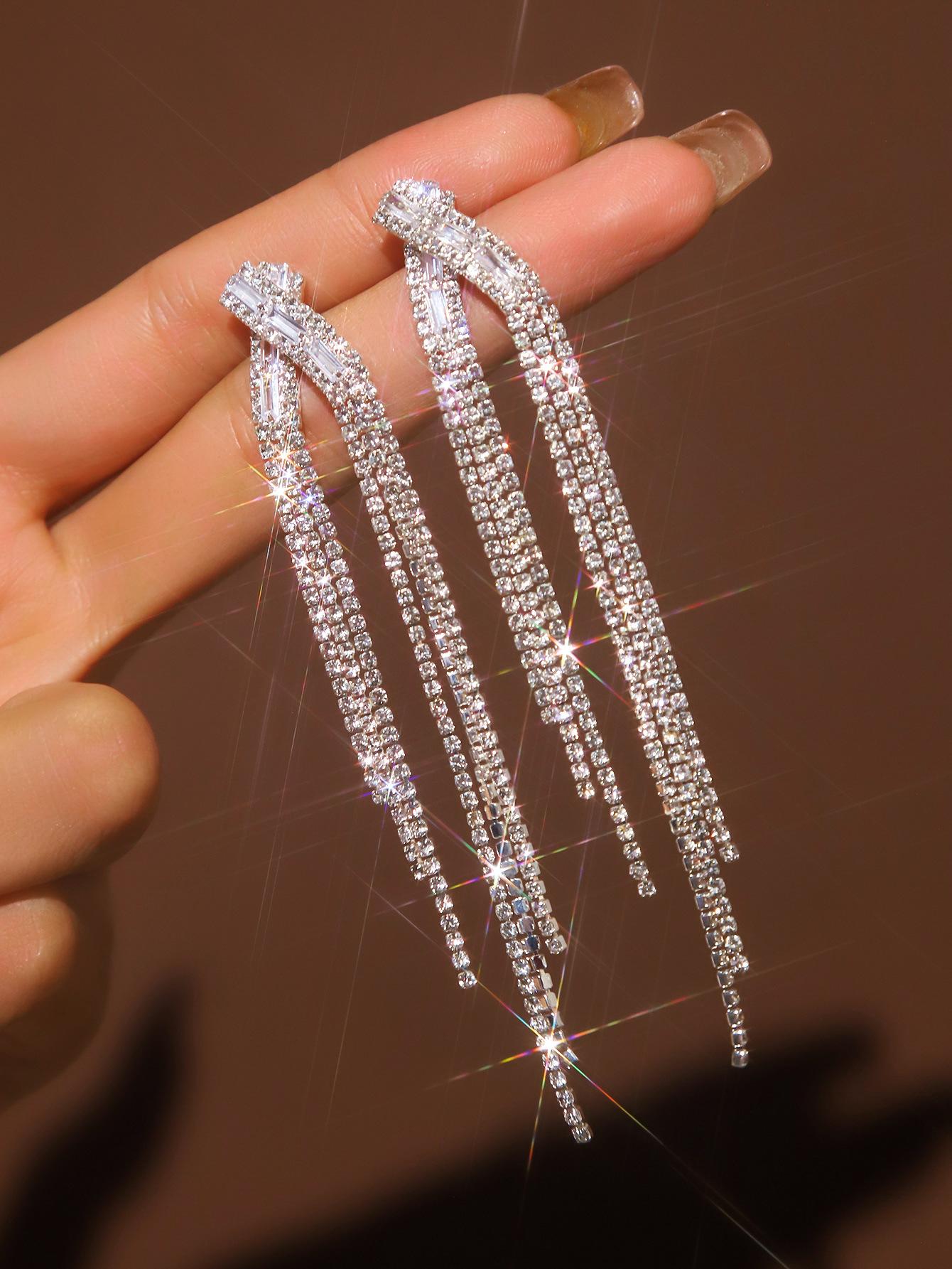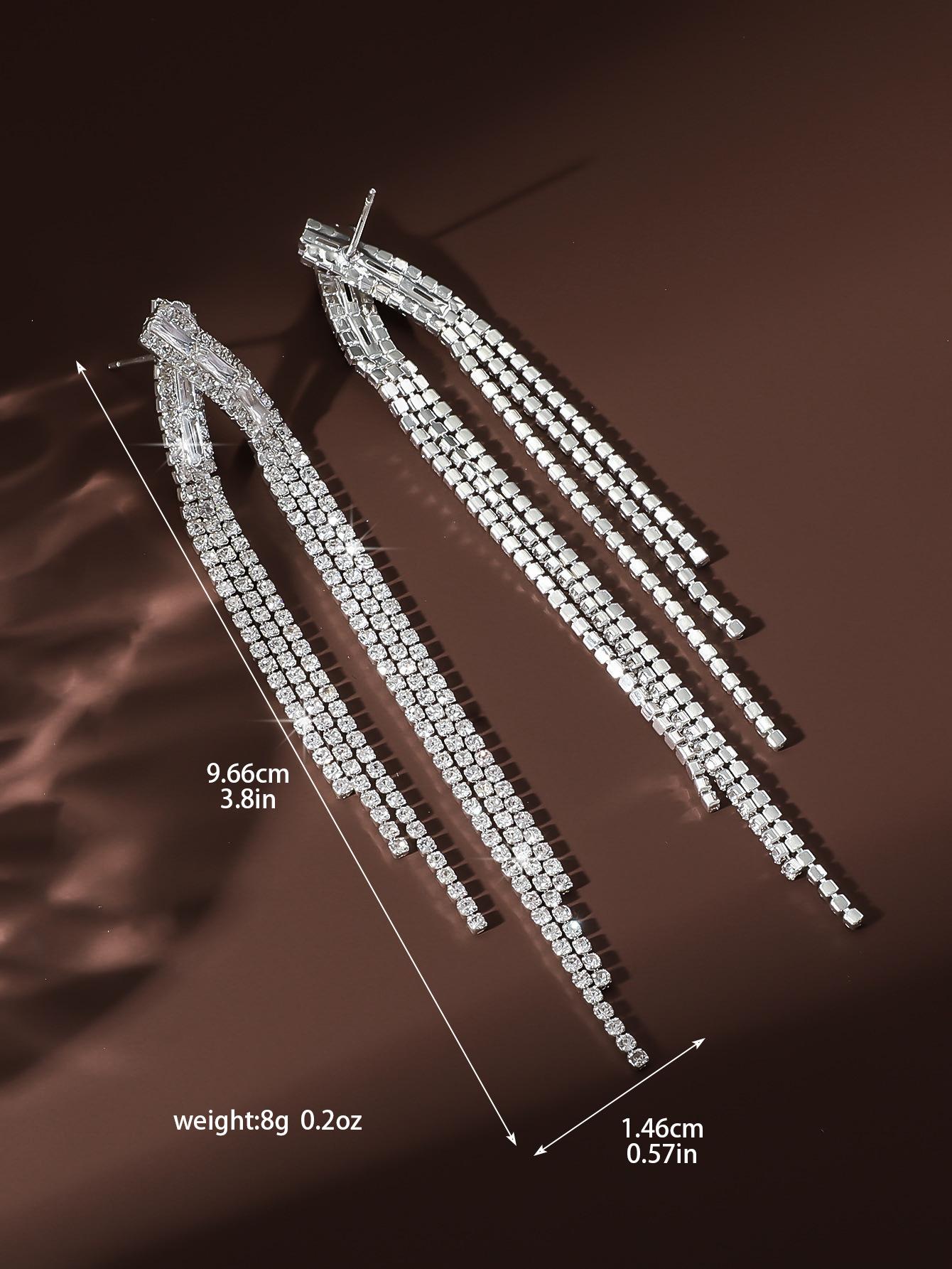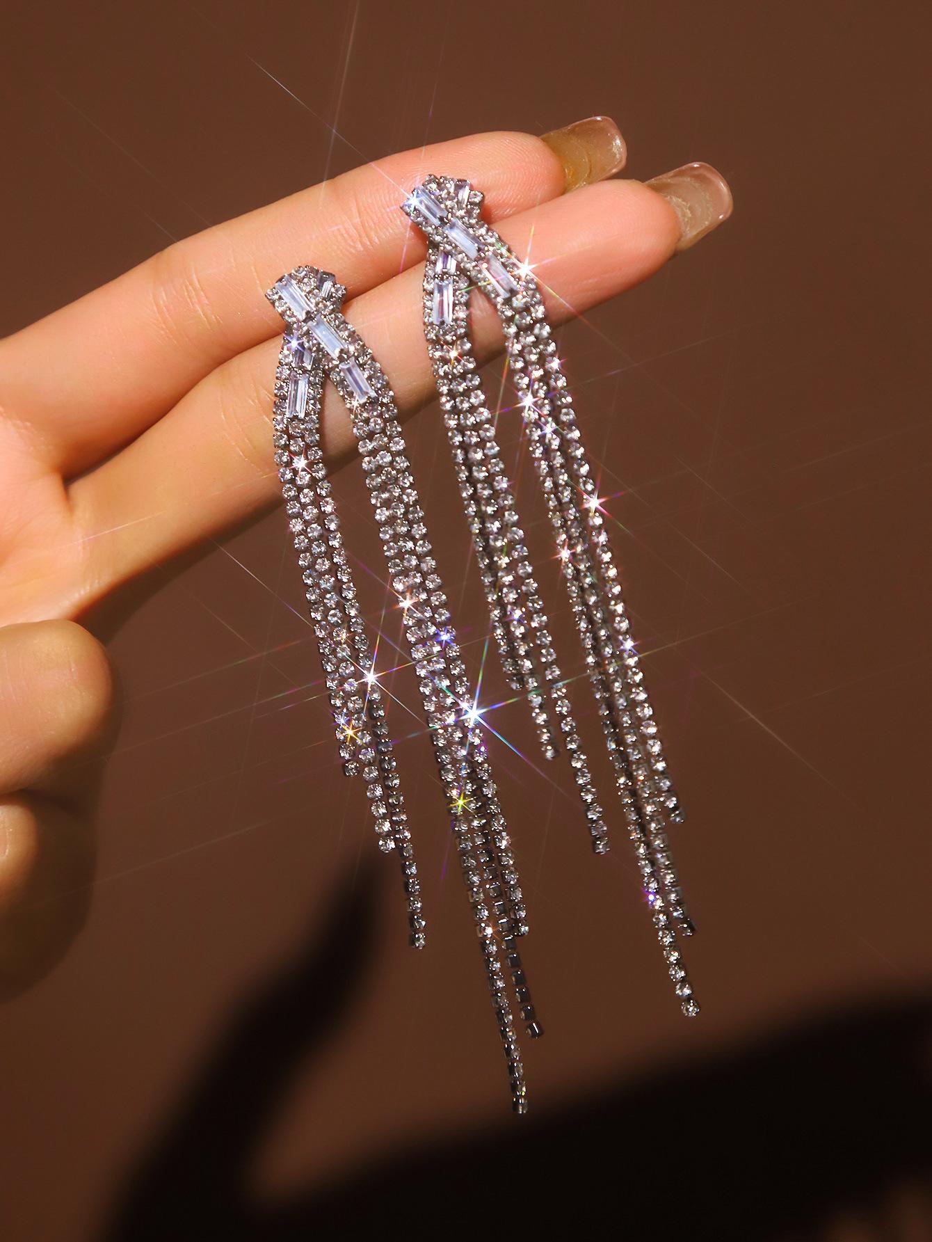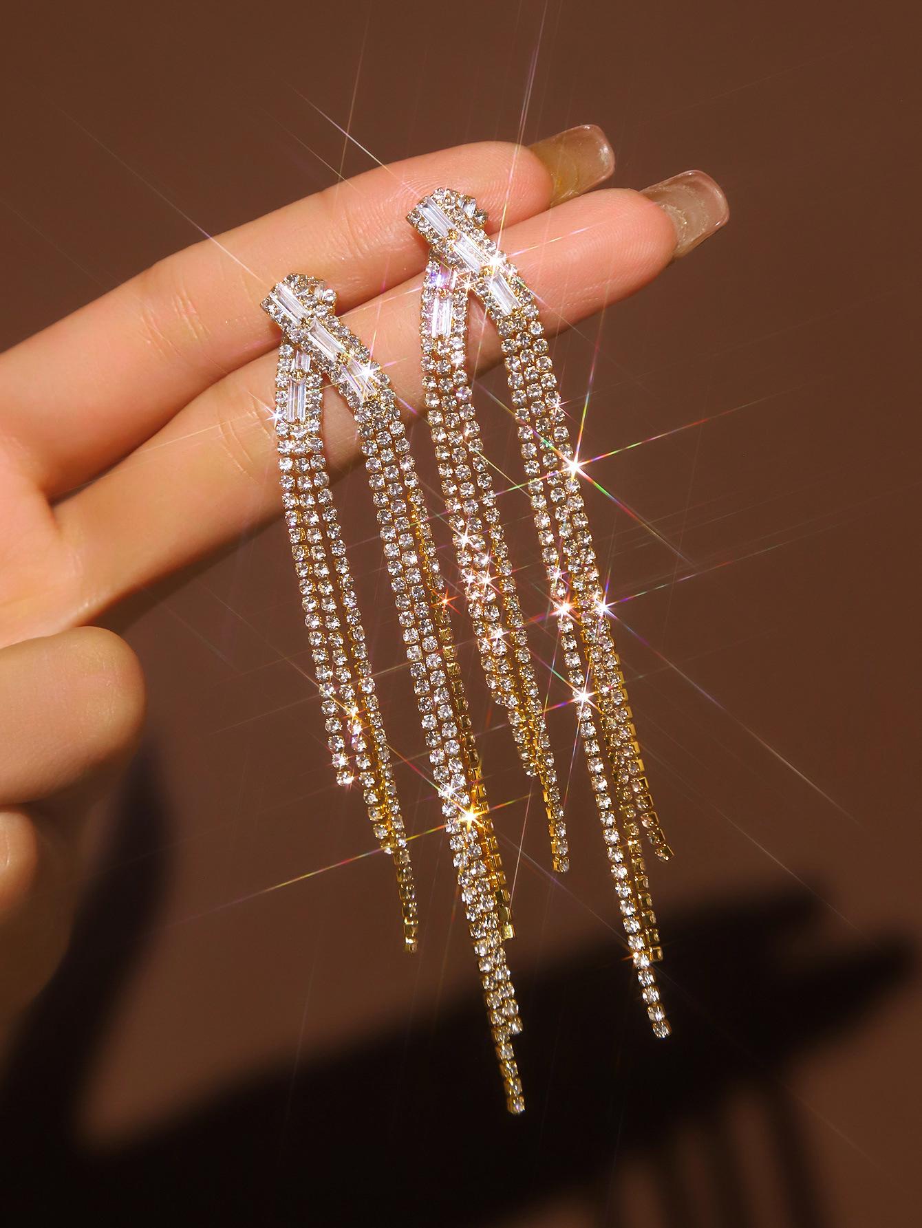 Pendientes largos con borlas y diamantes de imitación geométricos elegantes con cadena de garra Super Flash para mujer, aretes de banquete exagerados europeos y americanos.