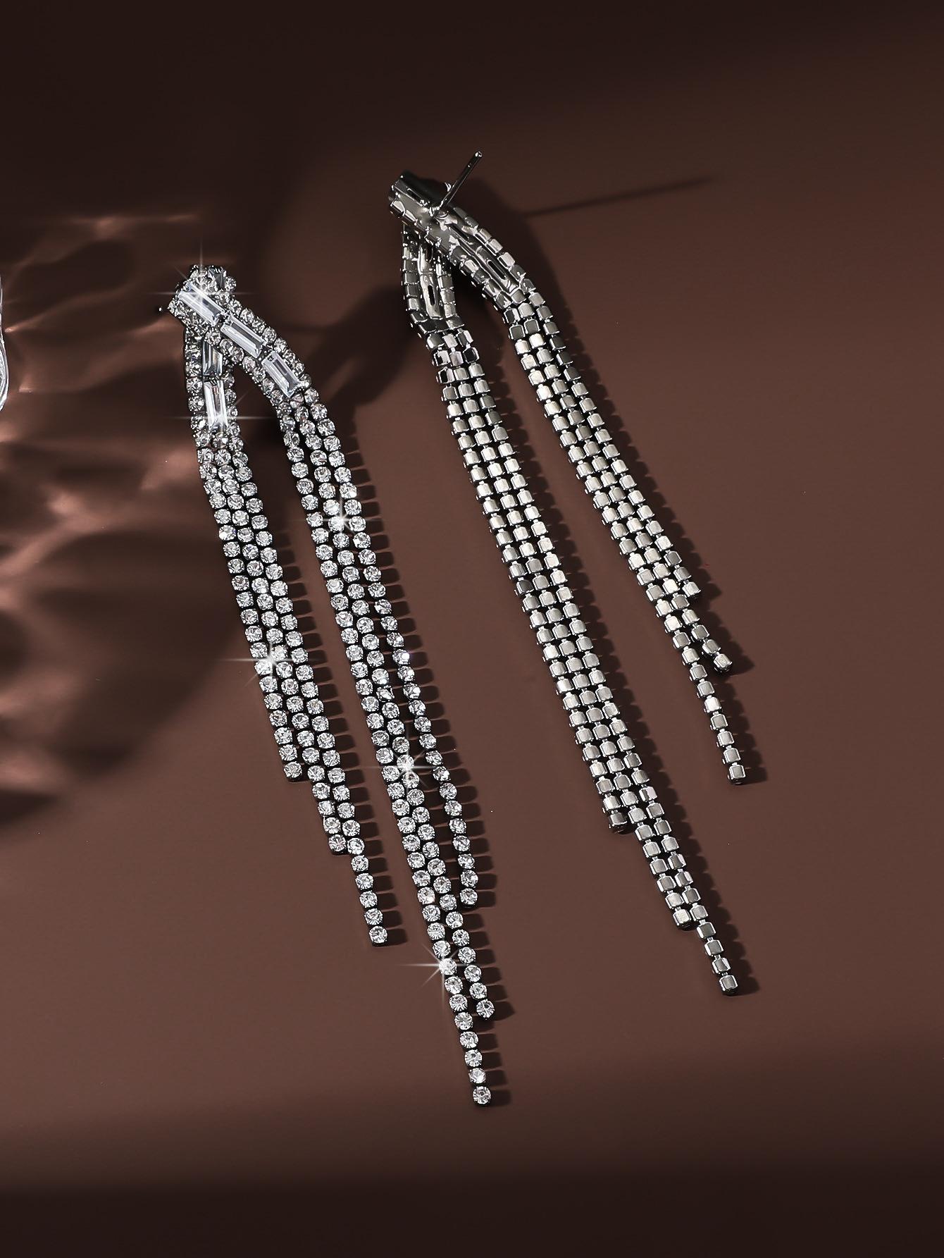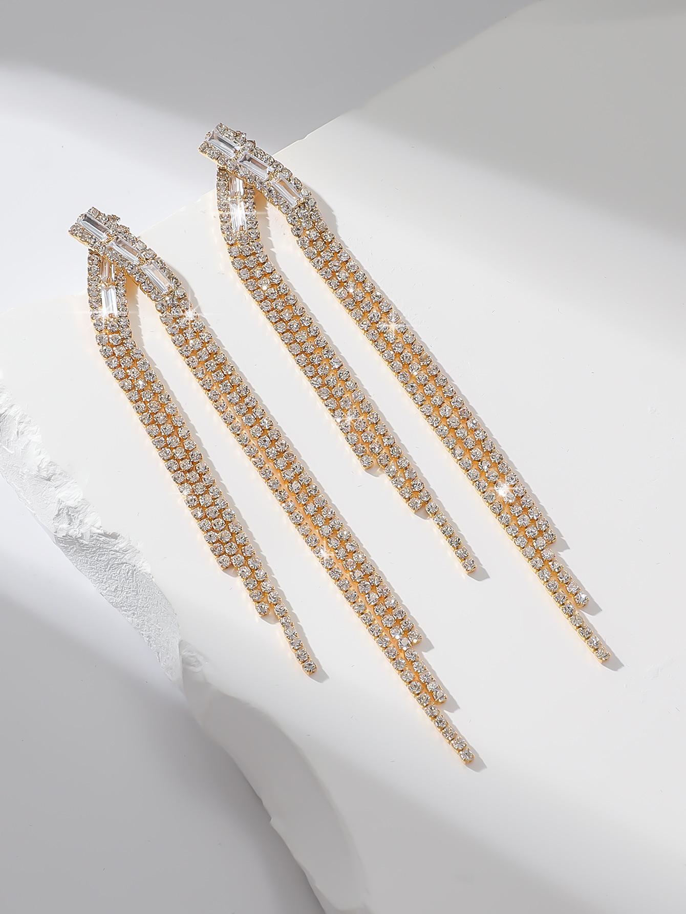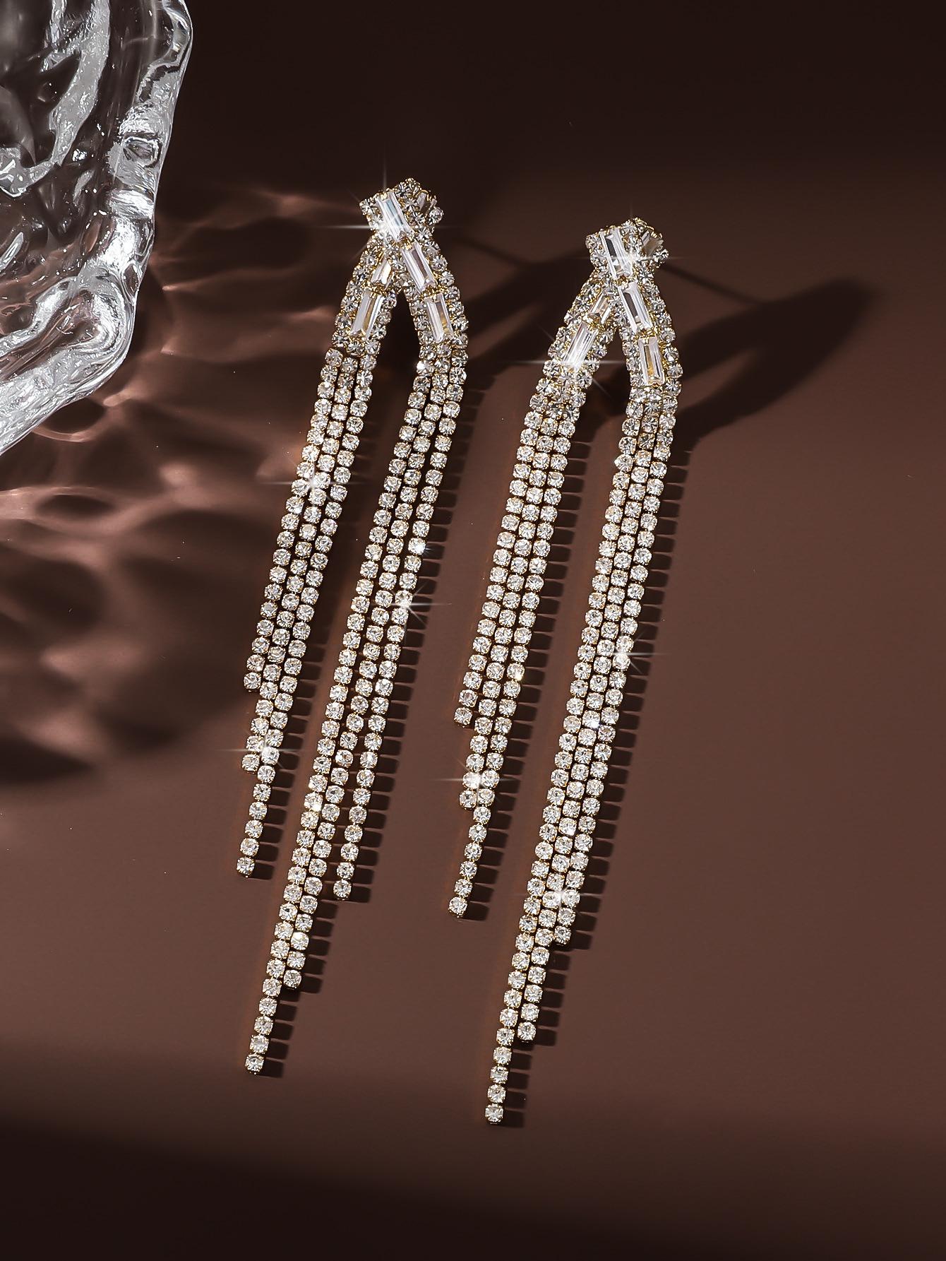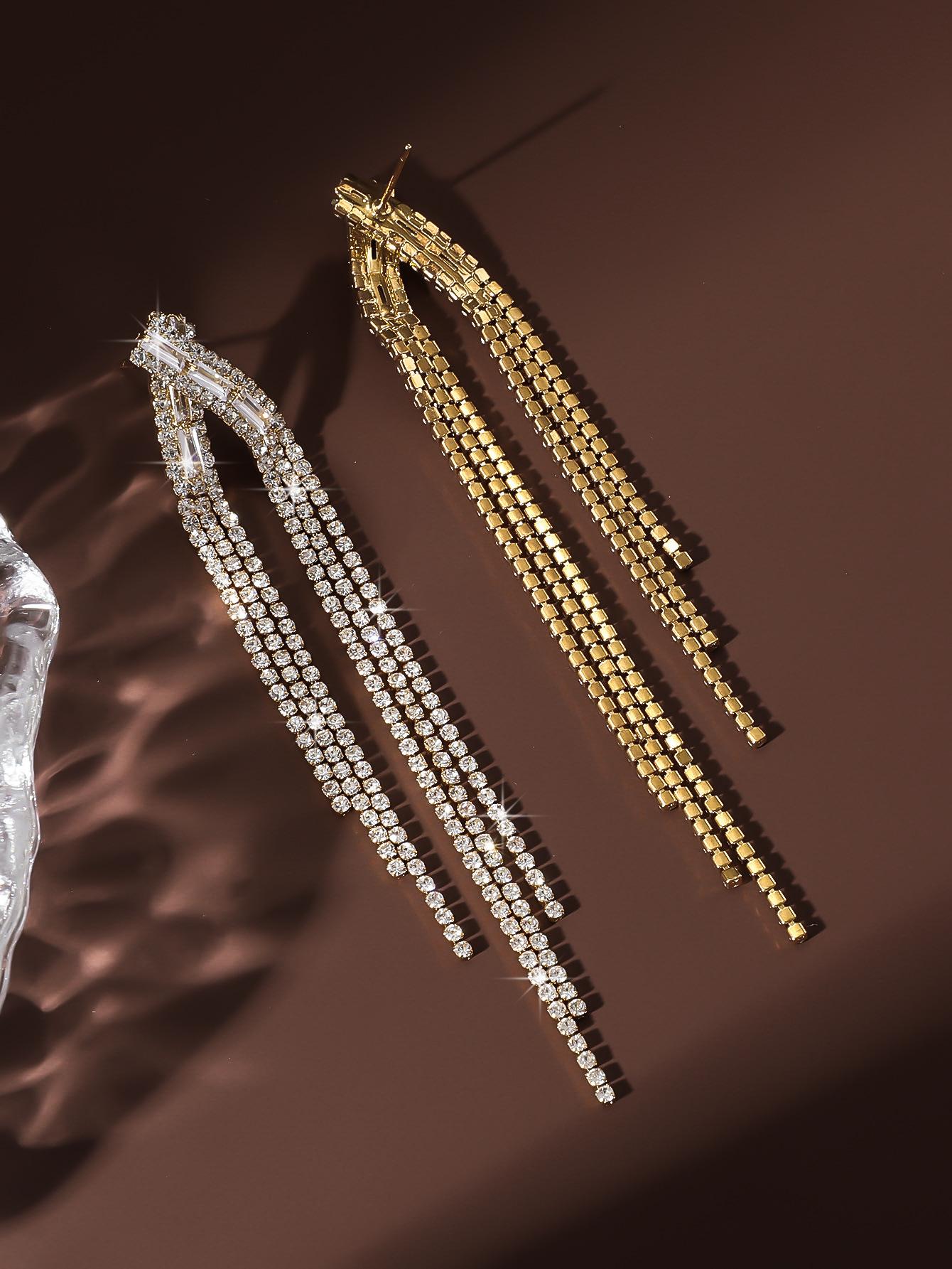 Pendientes largos con borlas y diamantes de imitación geométricos elegantes con cadena de garra Super Flash para mujer, aretes de banquete exagerados europeos y americanos.