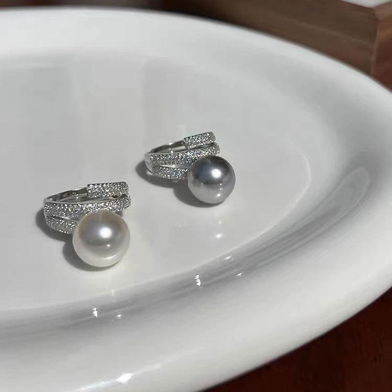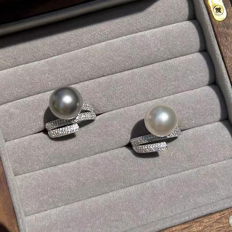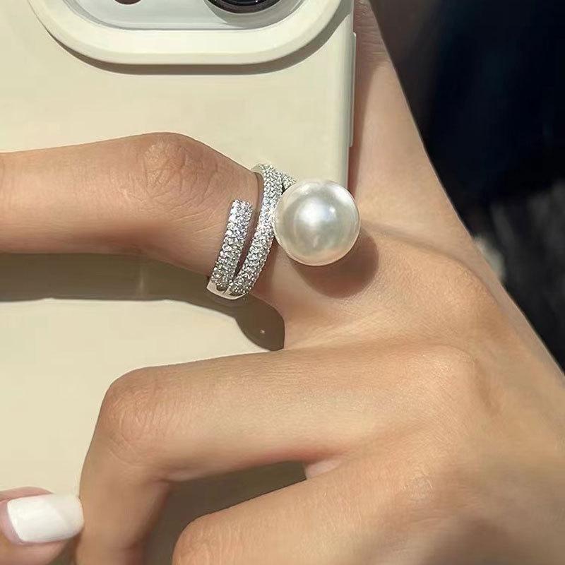 Anillo de perla con apertura de diamante completo para mujer, ligero, de lujo, de alta gama, diseño de nicho, multicapa, elegante, ajustable, combina con todo.
