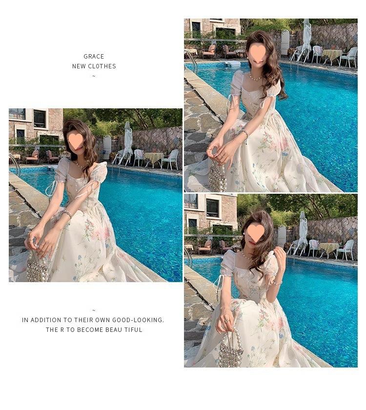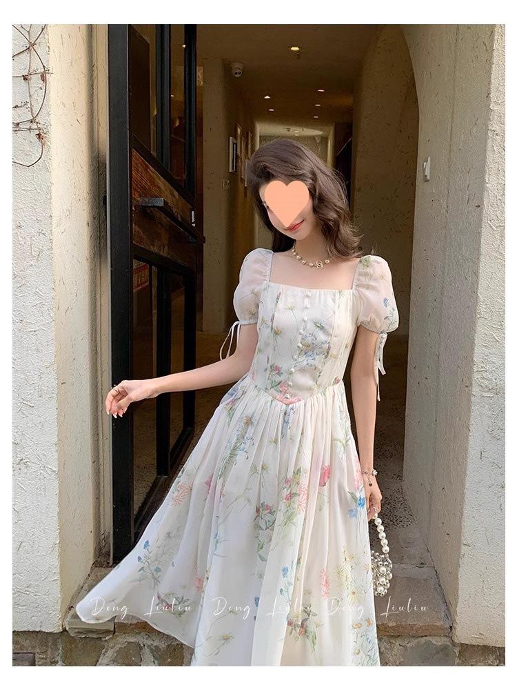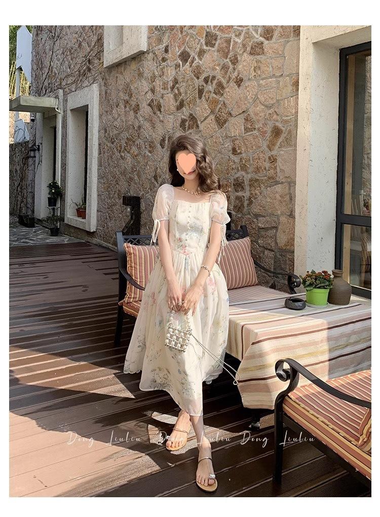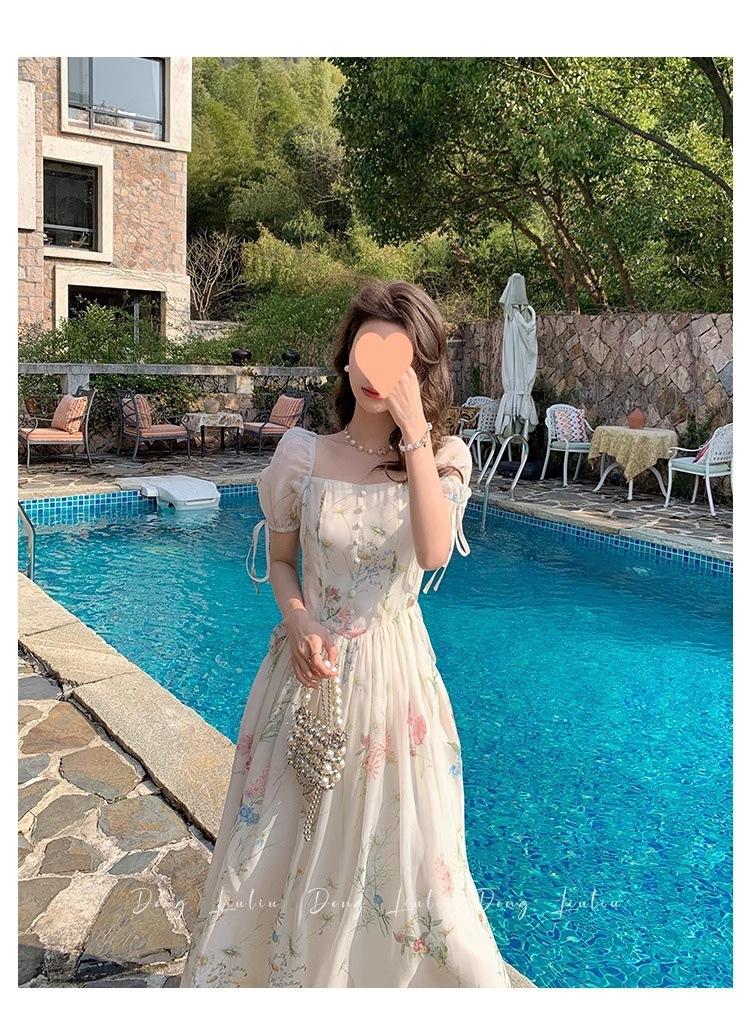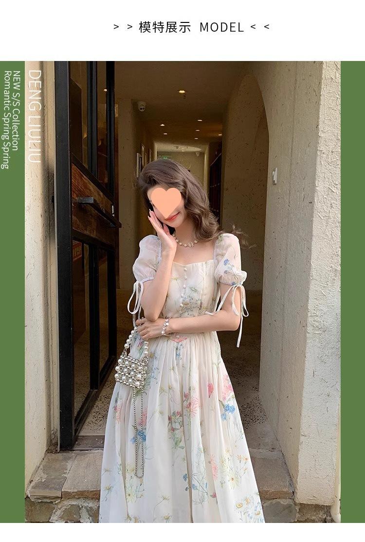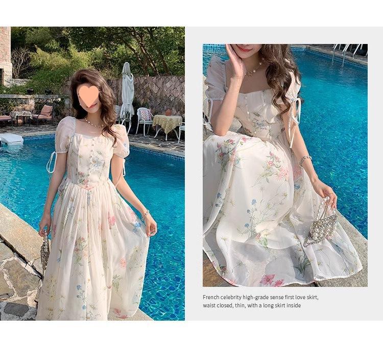 Vestido floral estilo francés para mujer, de verano, con cuello cuadrado, elegante, estilo socialité, fresco, dulce, adelgazante, para tomar el té, vestido largo