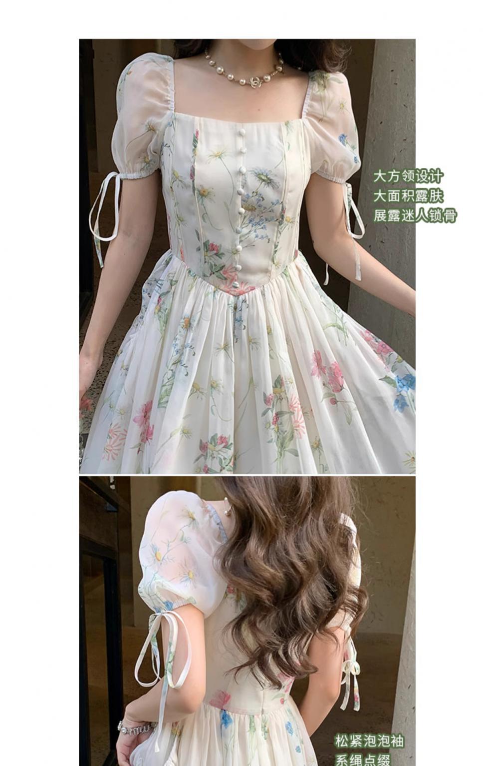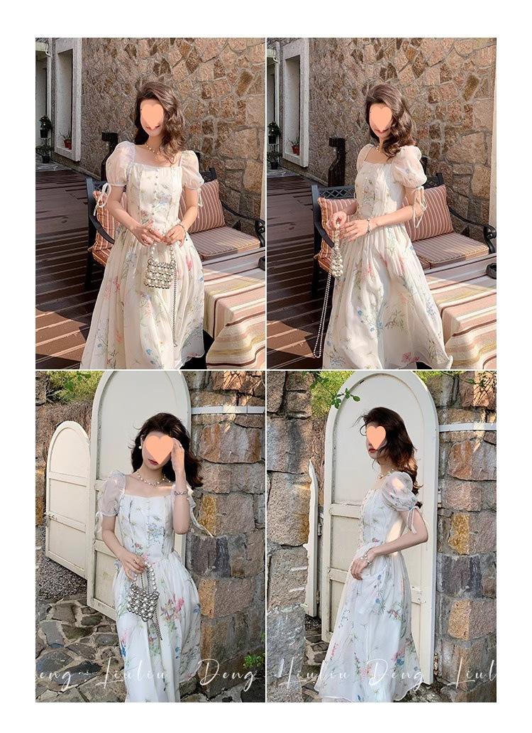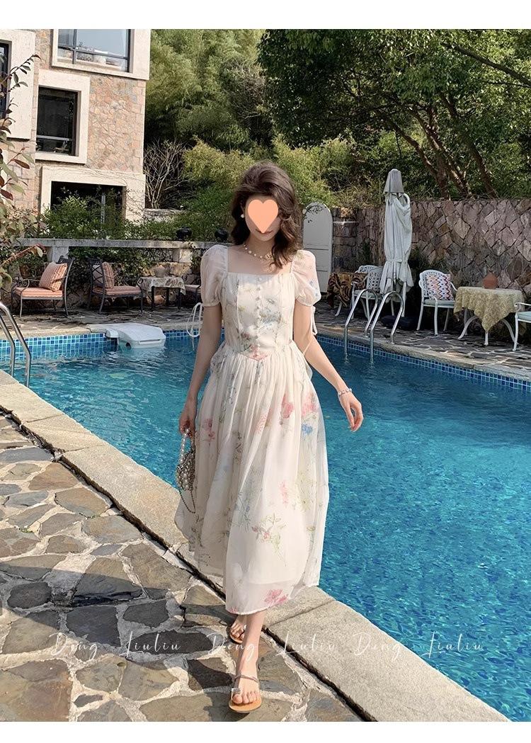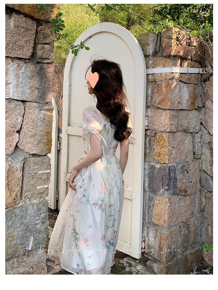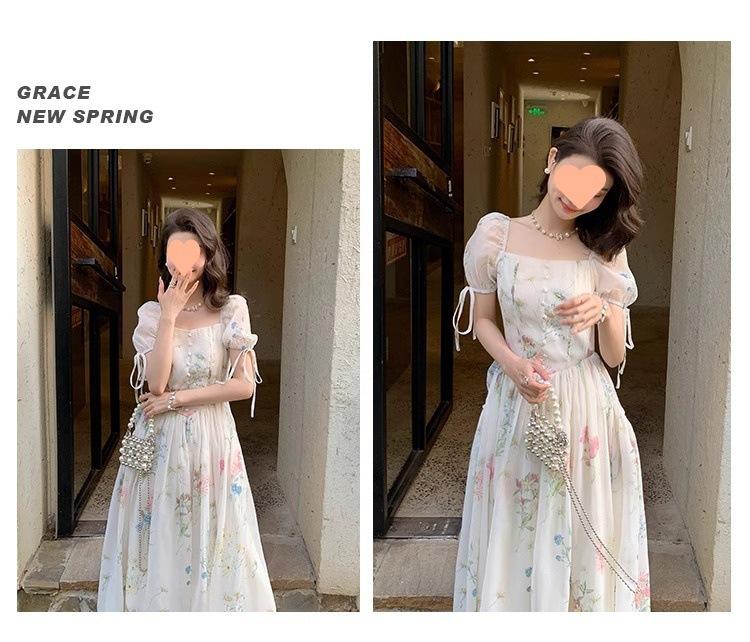 Vestido floral estilo francés para mujer, de verano, con cuello cuadrado, elegante, estilo socialité, fresco, dulce, adelgazante, para tomar el té, vestido largo