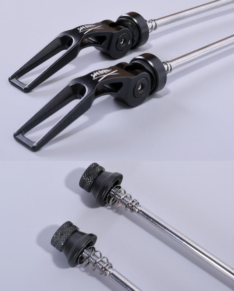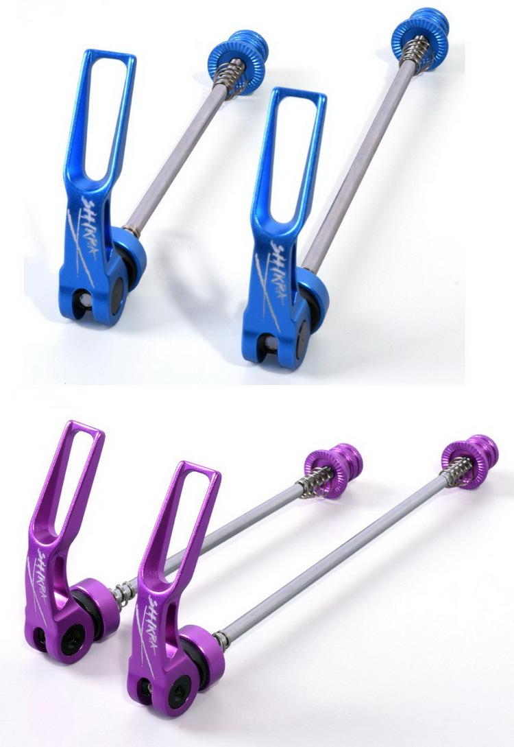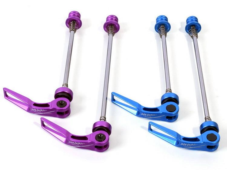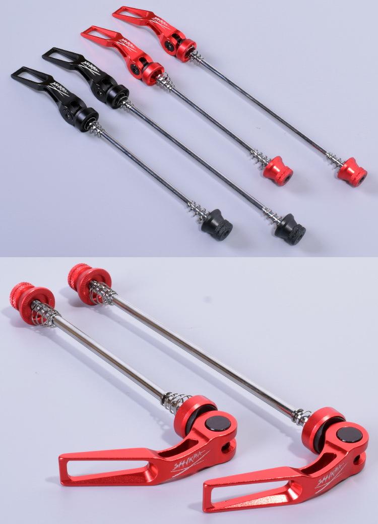 Black front and rear quick release pair, Front and rear red quick release pair, Front and rear Blue quick rele...