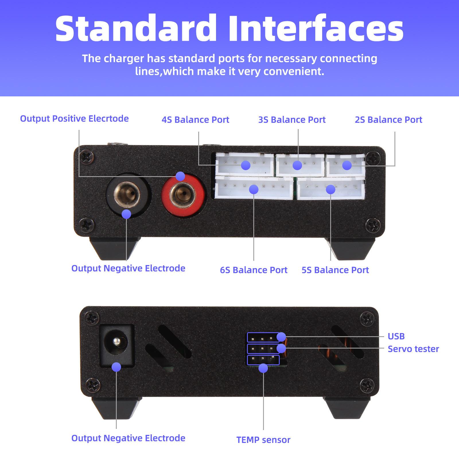4. Adecuado para LiPo/LiFe/LiHV/Li-ion de 1-6s, NiCD/NiMH de 1-15s, PB de 2-20V y Batería Inteligente I/II/III. Identifica automáticamente el número de celdas en la batería de litio. El cargador de batería con control remoto D610 es una versión mejorada del B6 y tiene múltiples modos de carga: Carga, Carga Balanceada, Descarga, etc. Cuando la batería está completamente cargada, el cargador detendrá automáticamente la carga.