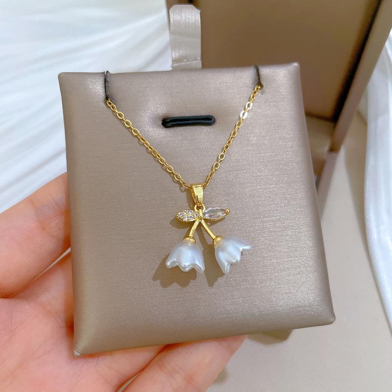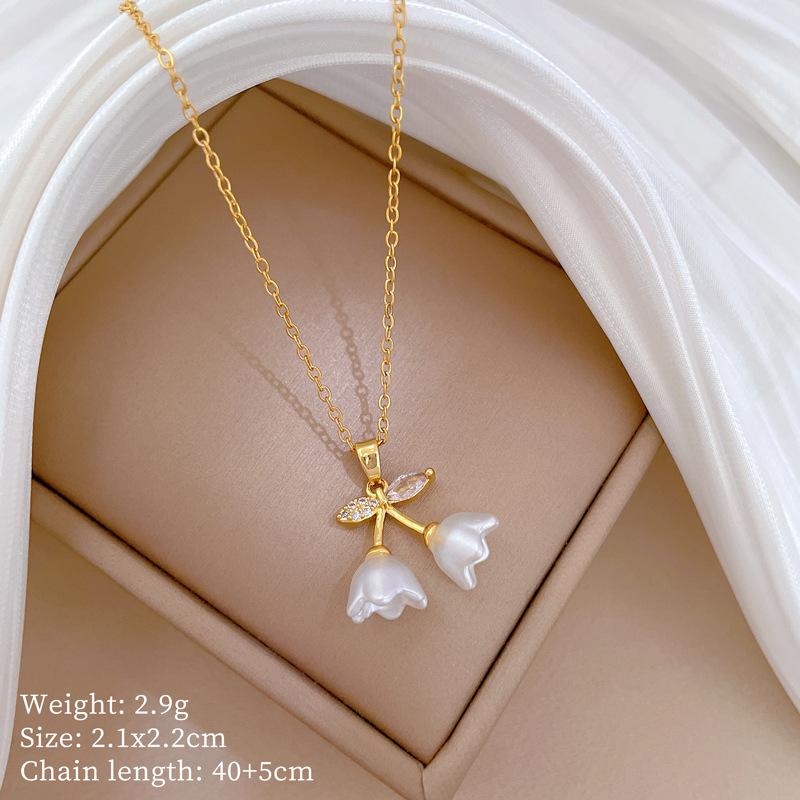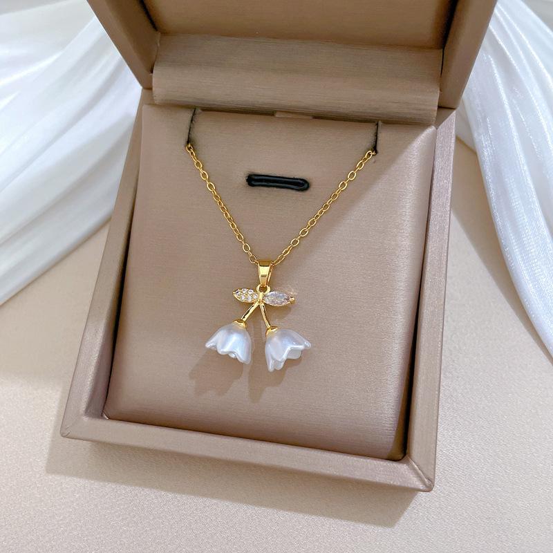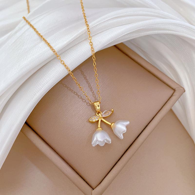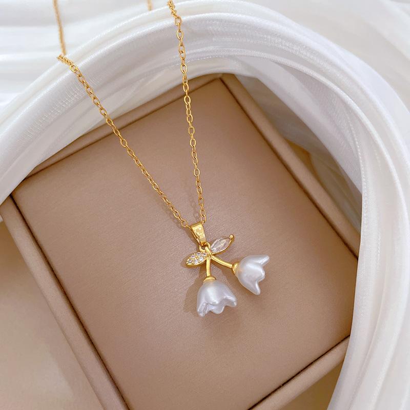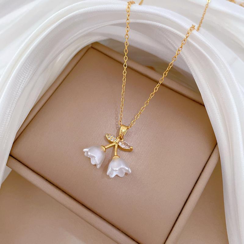 [Acero de titanio] Elegante collar de diamantes con forma de campana, trompeta y flor, de lujo, para mujer, cadena de clavícula combinable, cadena de acero de titanio.
