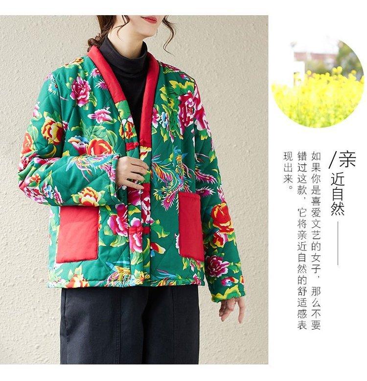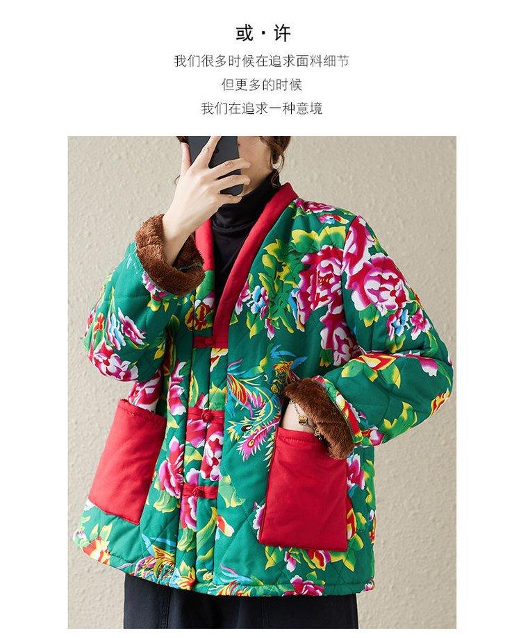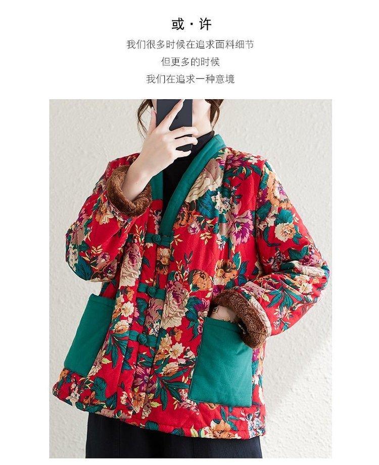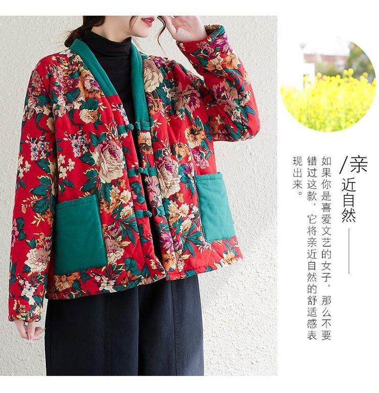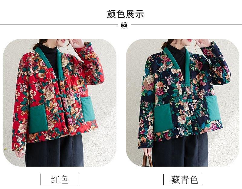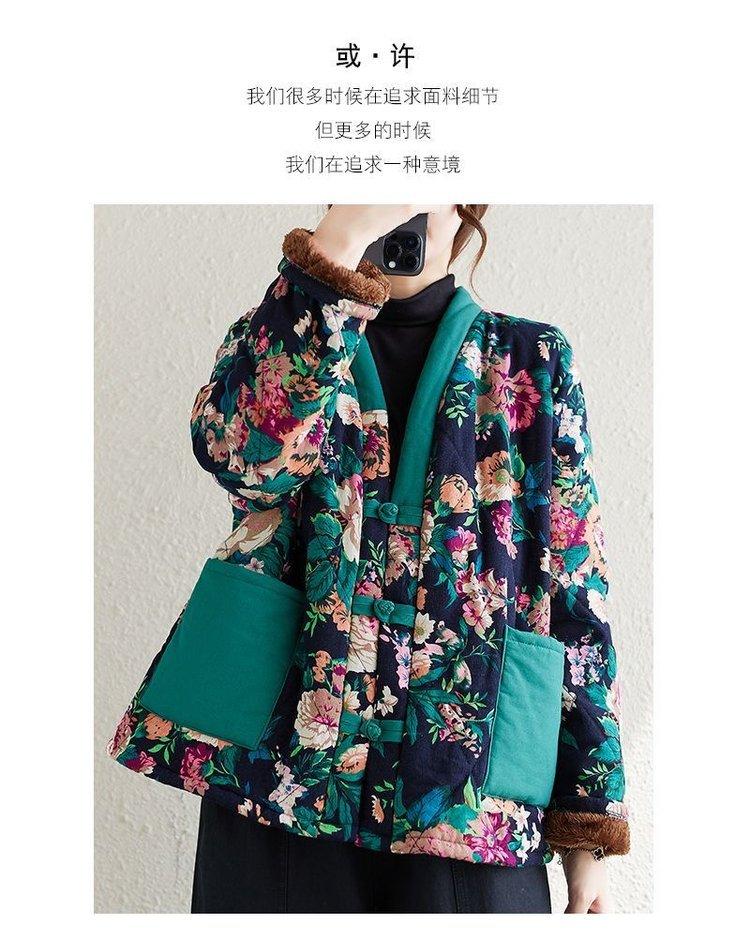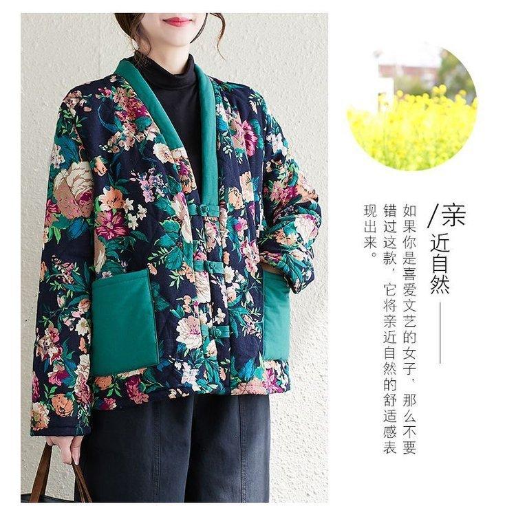 Chaqueta acolchada de algodón con flores grandes del noreste con hebilla retro artística de estilo étnico con transmisión en vivo, chaqueta acolchada de algodón a juego, corta con forro polar, gruesa, estilo chino