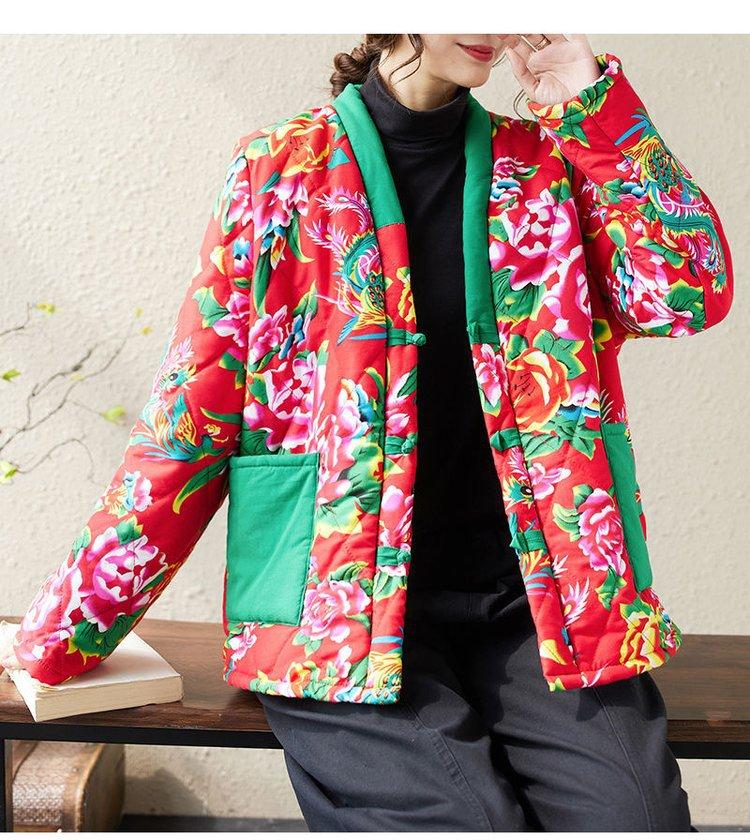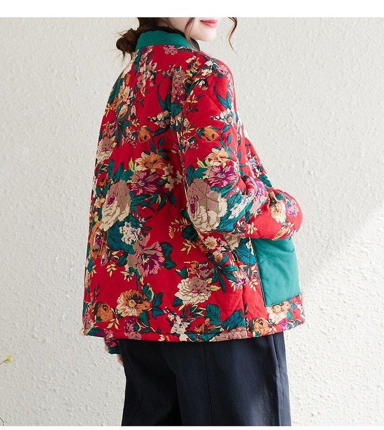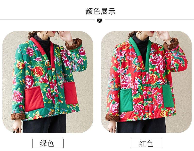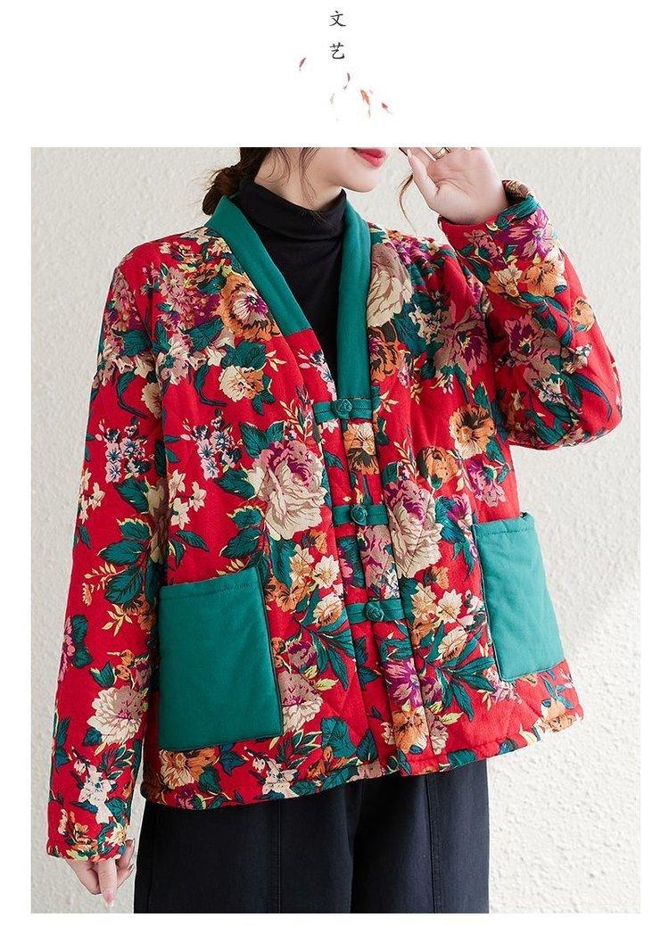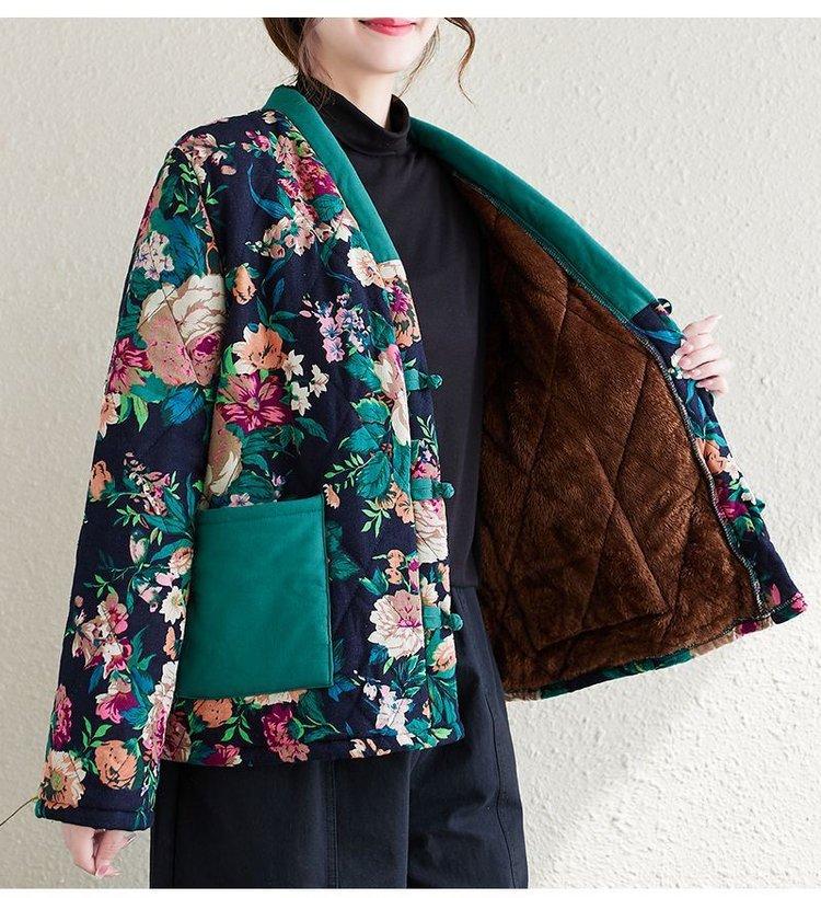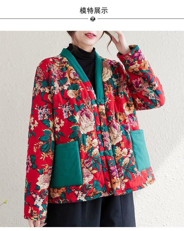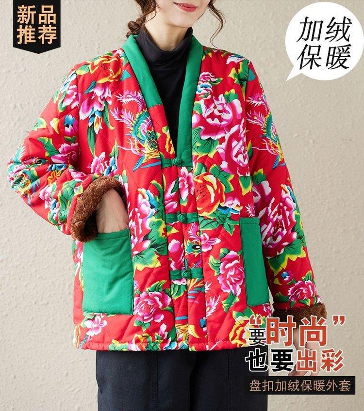 Chaqueta acolchada de algodón con flores grandes del noreste con hebilla retro artística de estilo étnico con transmisión en vivo, chaqueta acolchada de algodón a juego, corta con forro polar, gruesa, estilo chino
