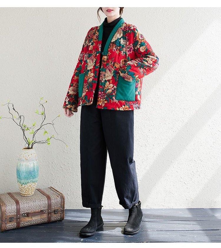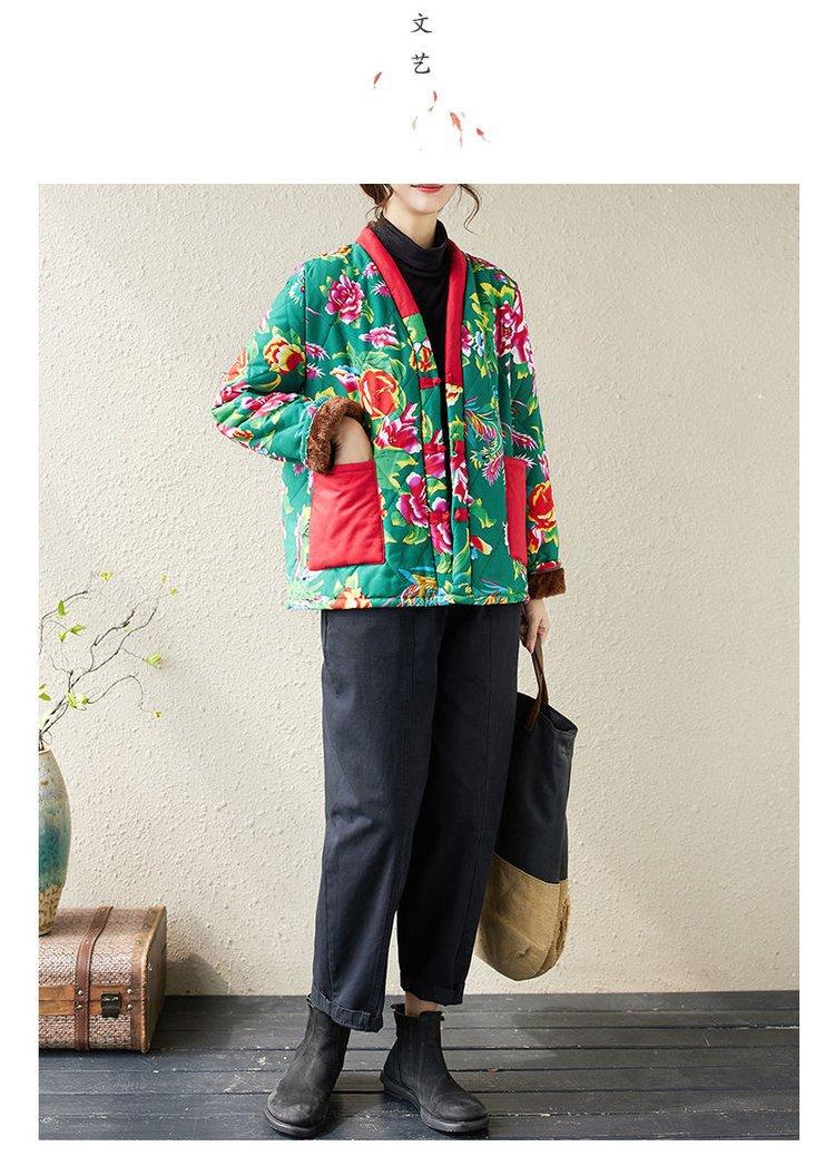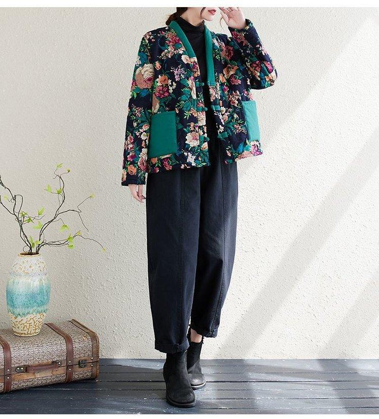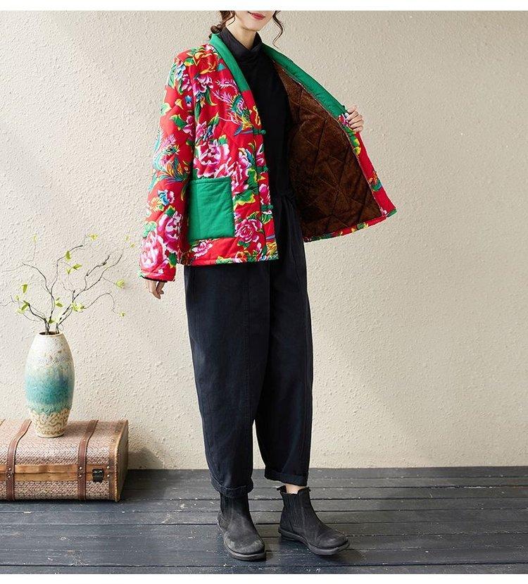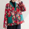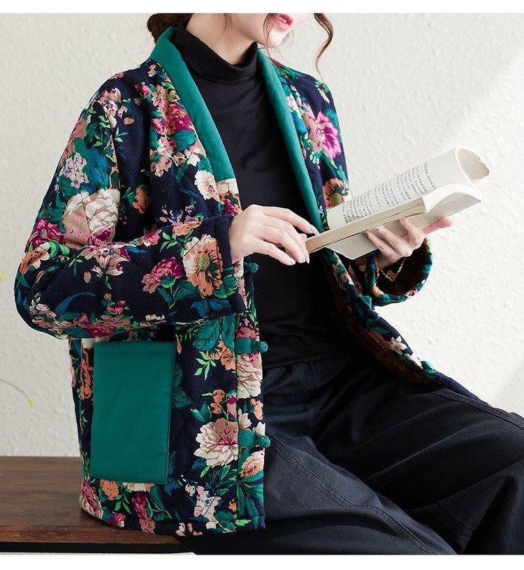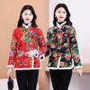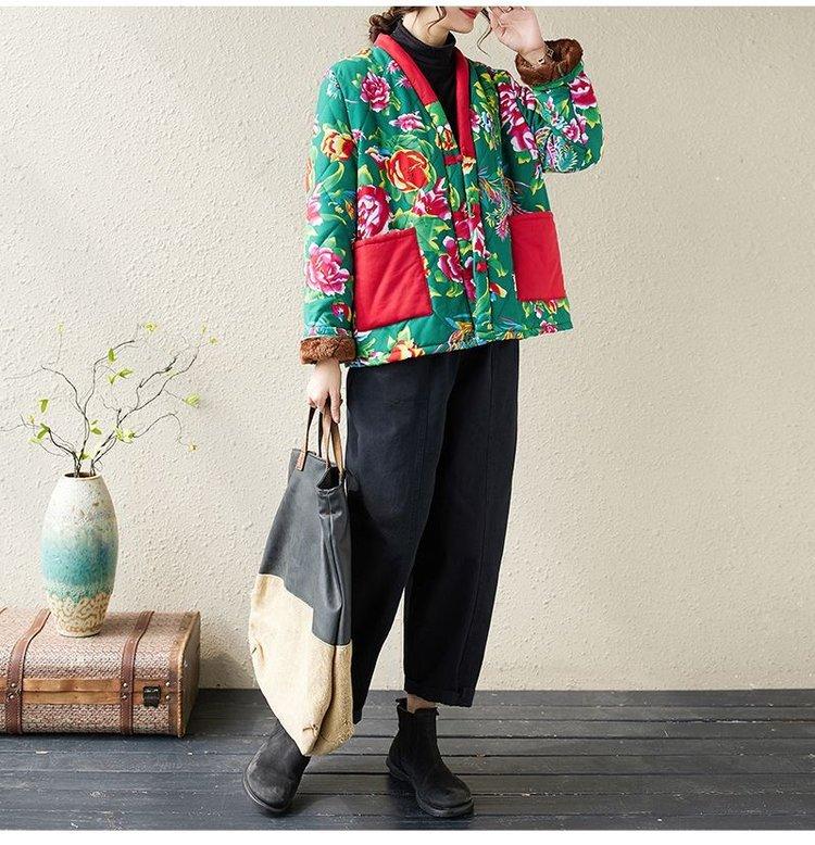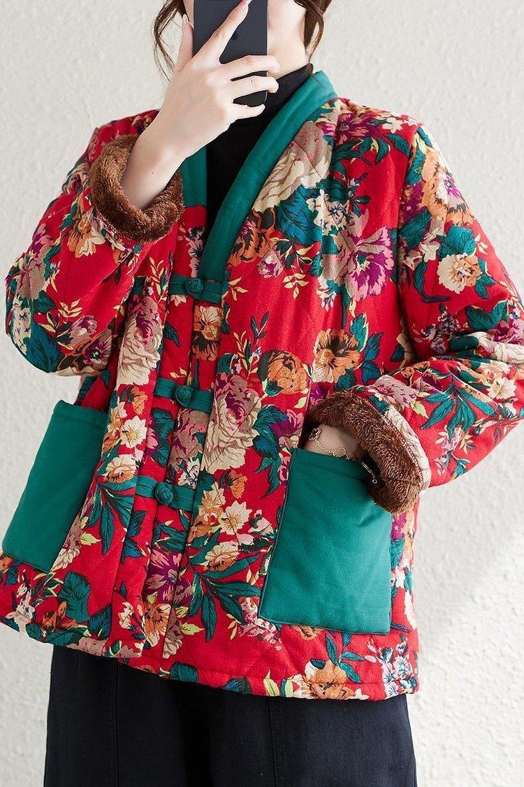 Chaqueta acolchada de algodón con flores grandes del noreste con hebilla retro artística de estilo étnico con transmisión en vivo, chaqueta acolchada de algodón a juego, corta con forro polar, gruesa, estilo chino