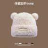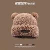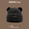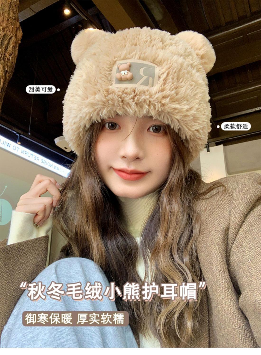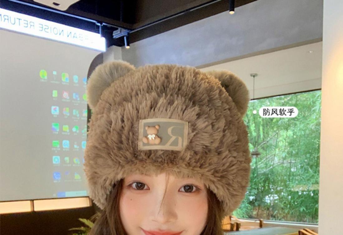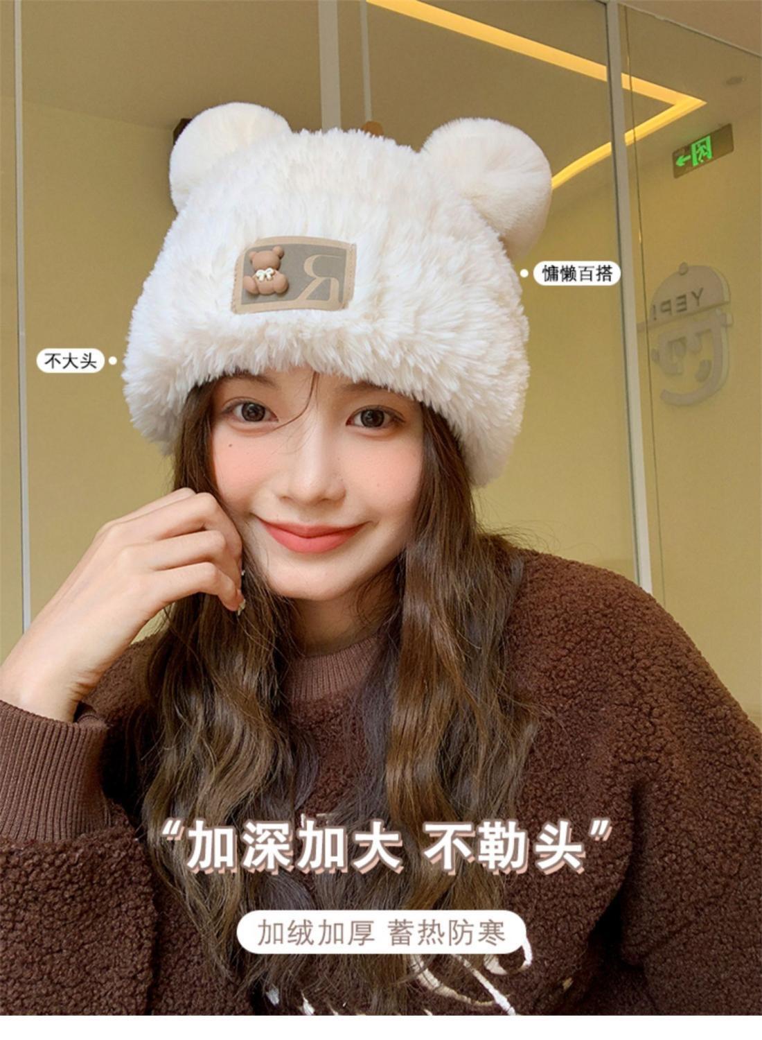 Sombrero de felpa con orejas de oso lindo para otoño e invierno para mujer, estilo coreano, circunferencia de cabeza grande, capucha para protección de orejas para Heattech y mostrar la cara pequeña, gorro frío