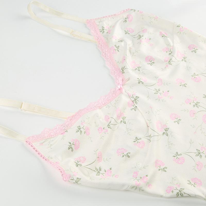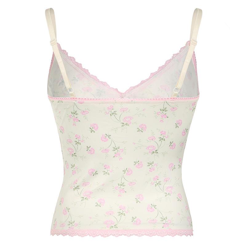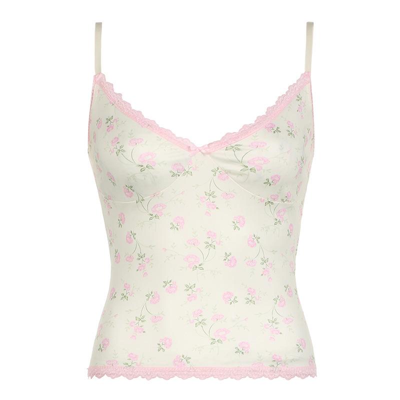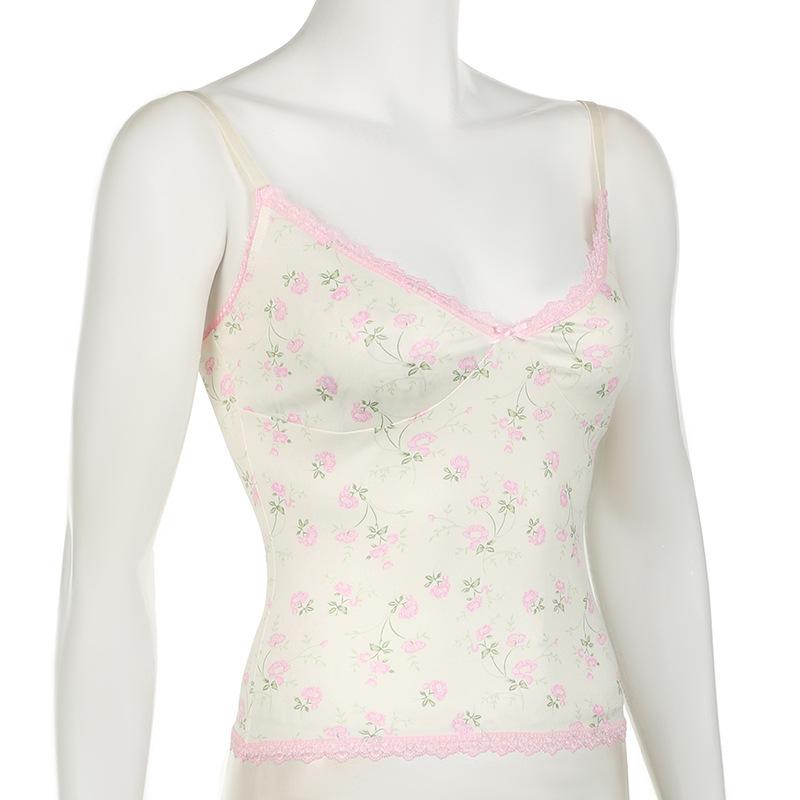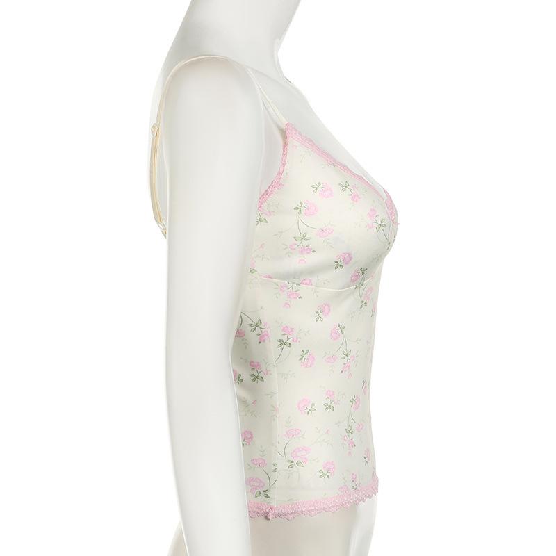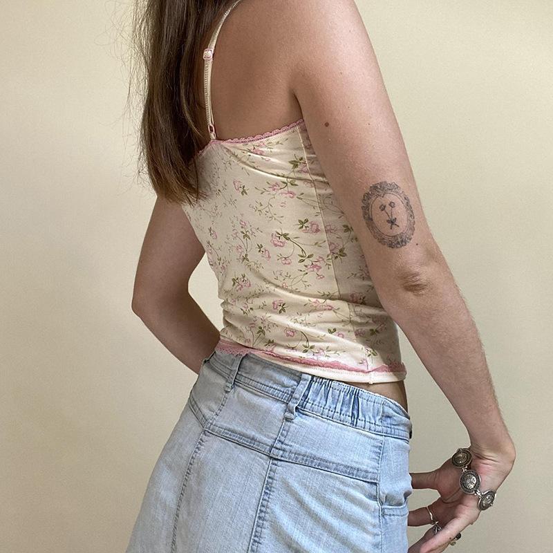 Top corto informal de verano fresco y elegante con cuello de encaje floral y tirantes finos de estilo europeo y americano.
