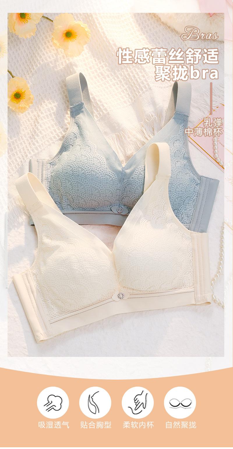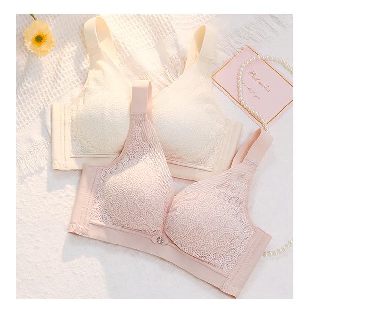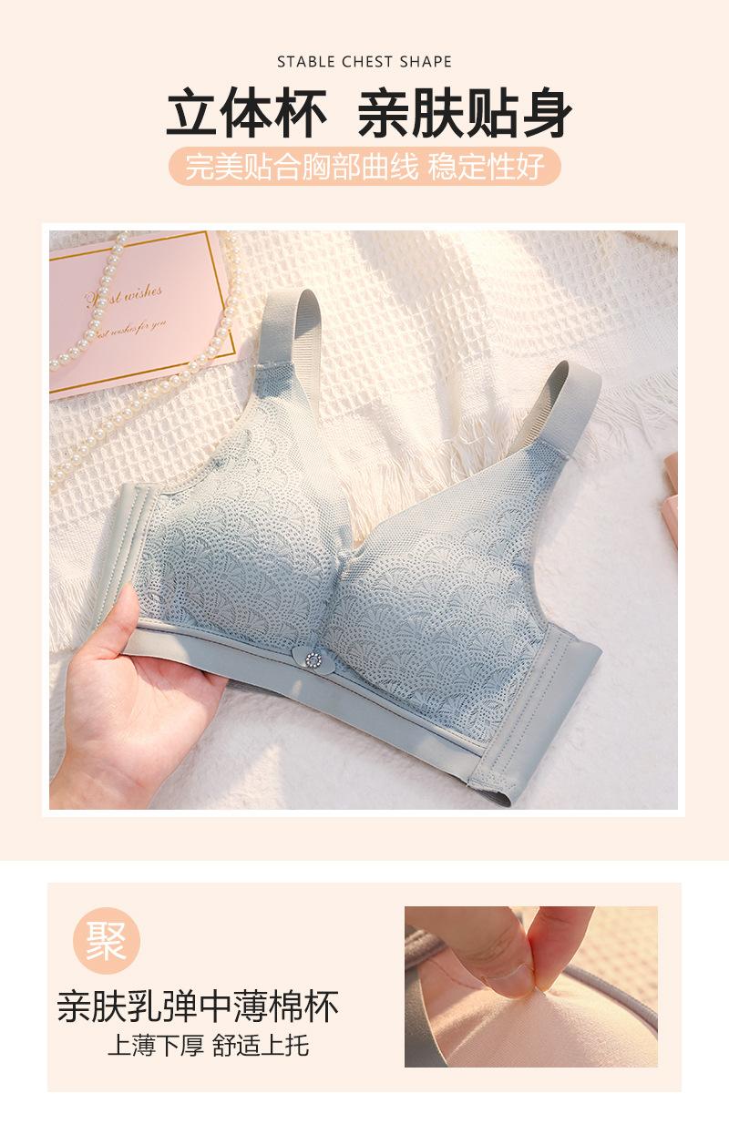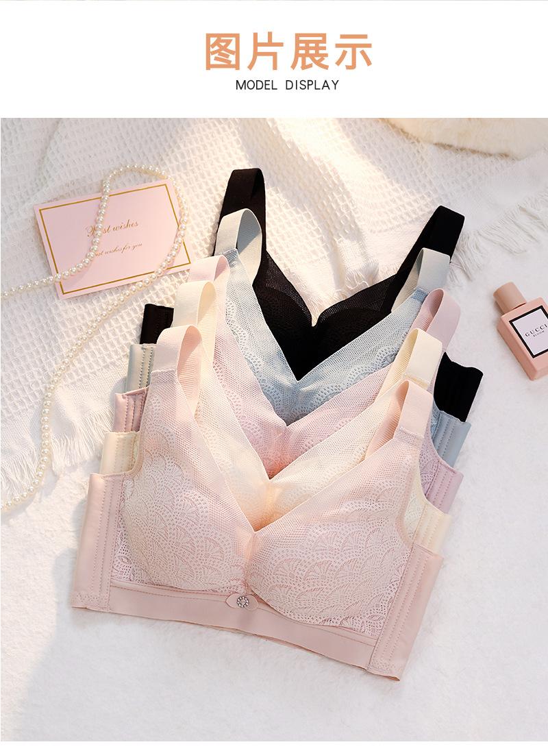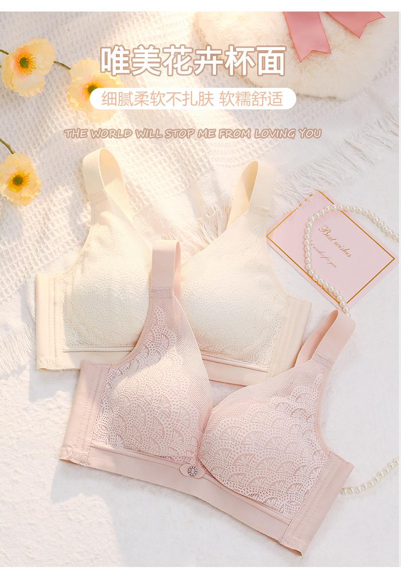 Venta de fábrica, ropa interior de encaje sexy de algodón de leche ligeramente gruesa con copa pequeña suave, tipo ajuste fruncido, sujetador sin aros no magnético