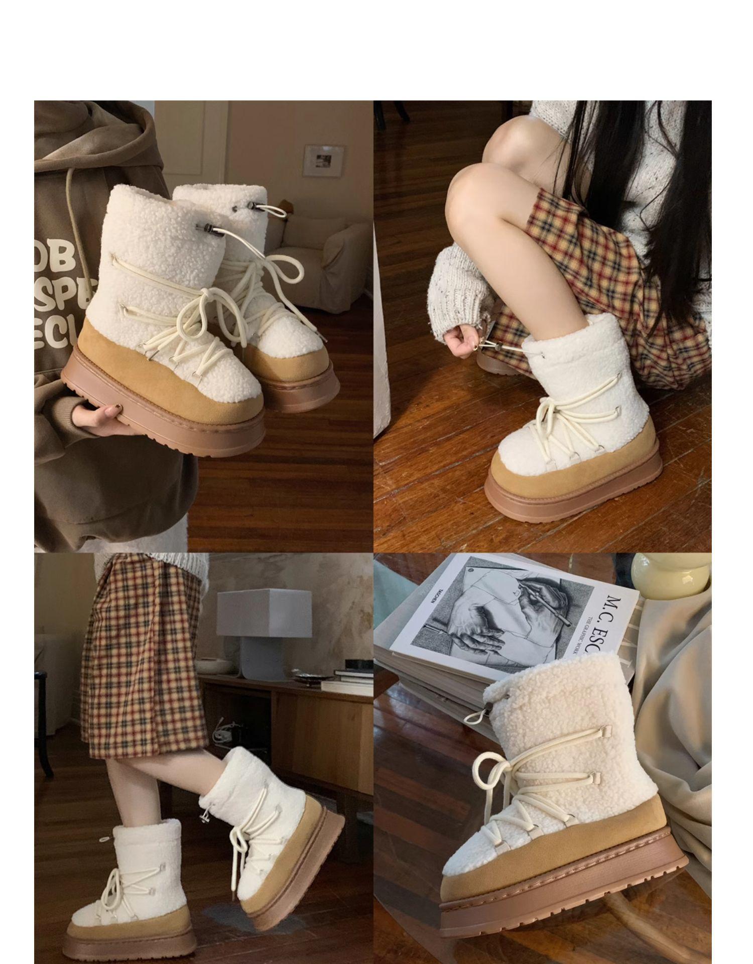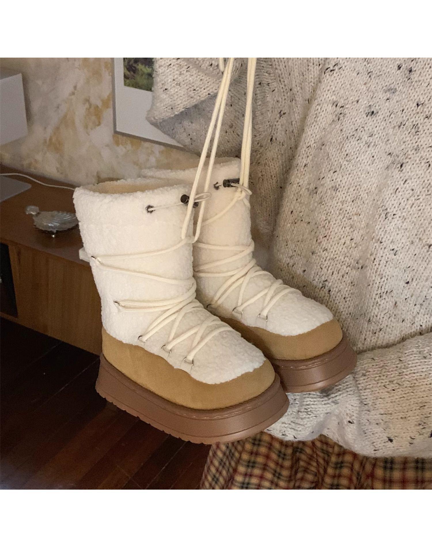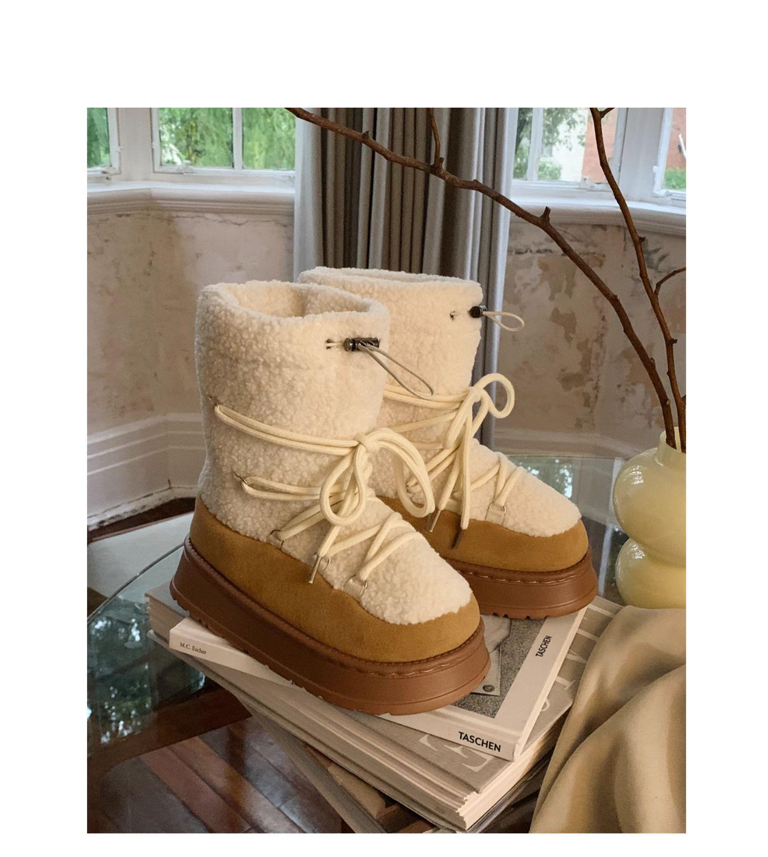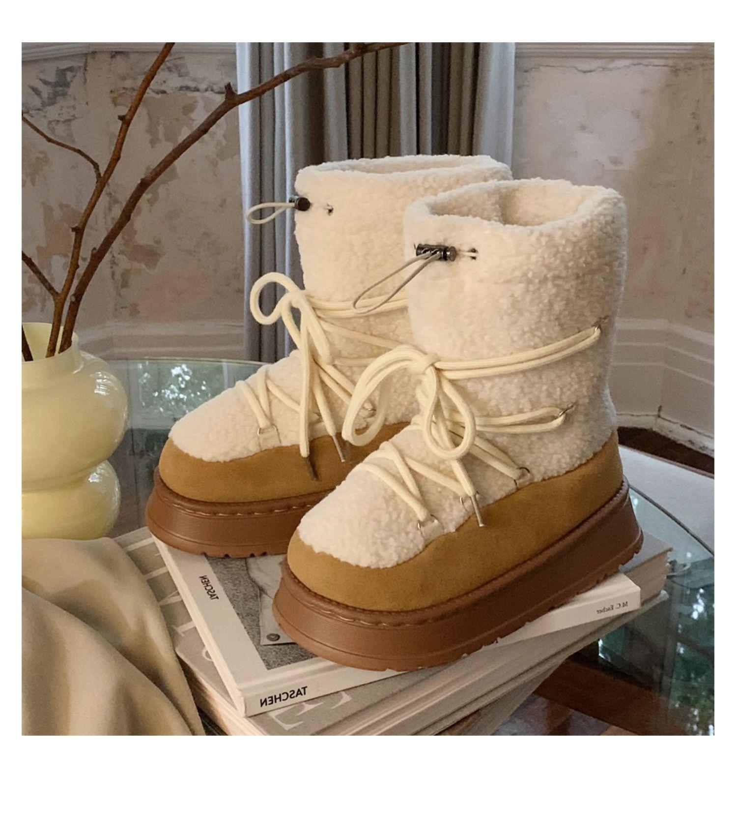 Botas de Nieve con Tiras de Lana de Cordero de Otoño e Invierno 2025 Nuevas Botas Retro de Moda para Mujer de Media Caña Zapatos de Algodón Cálidos Aumentados