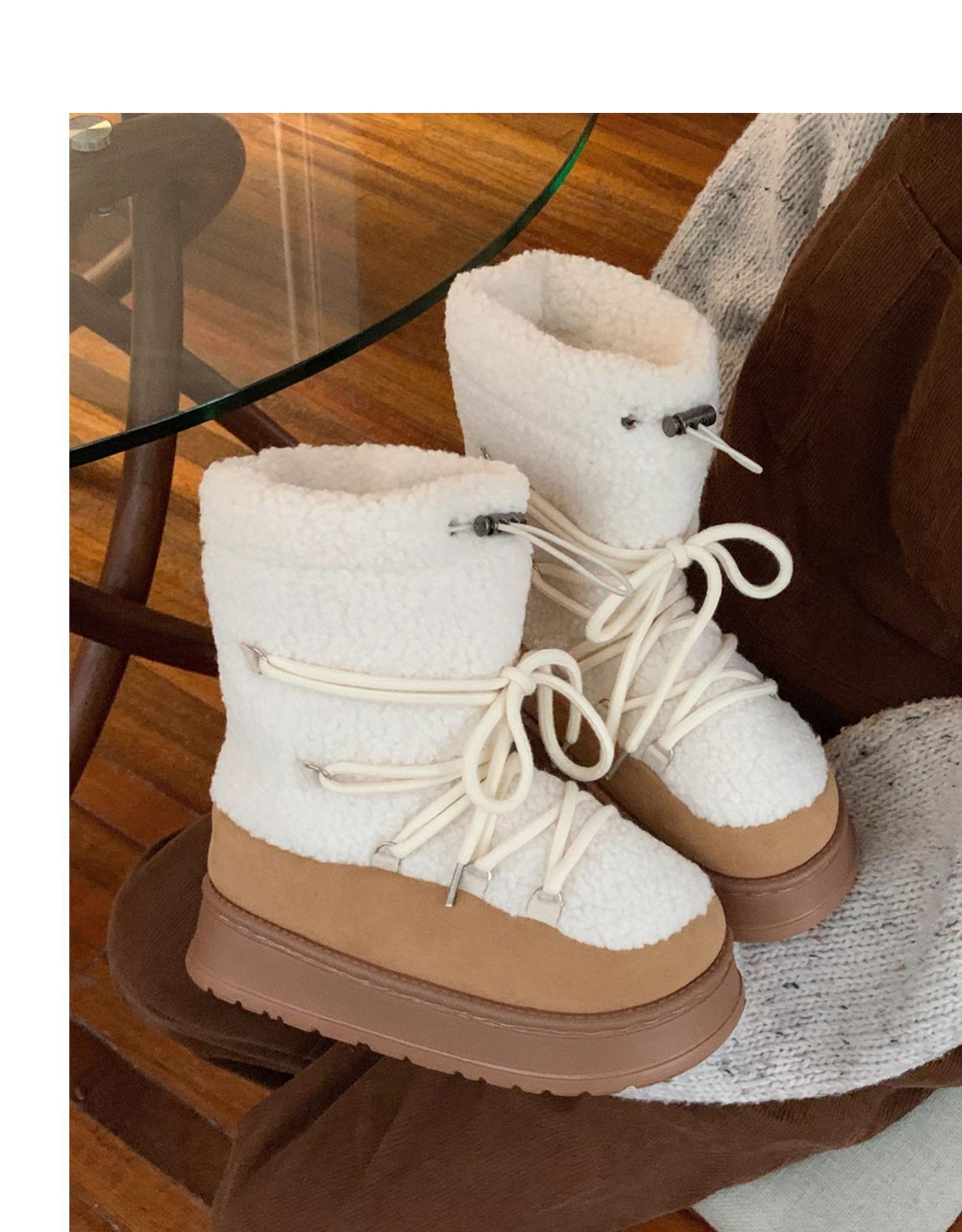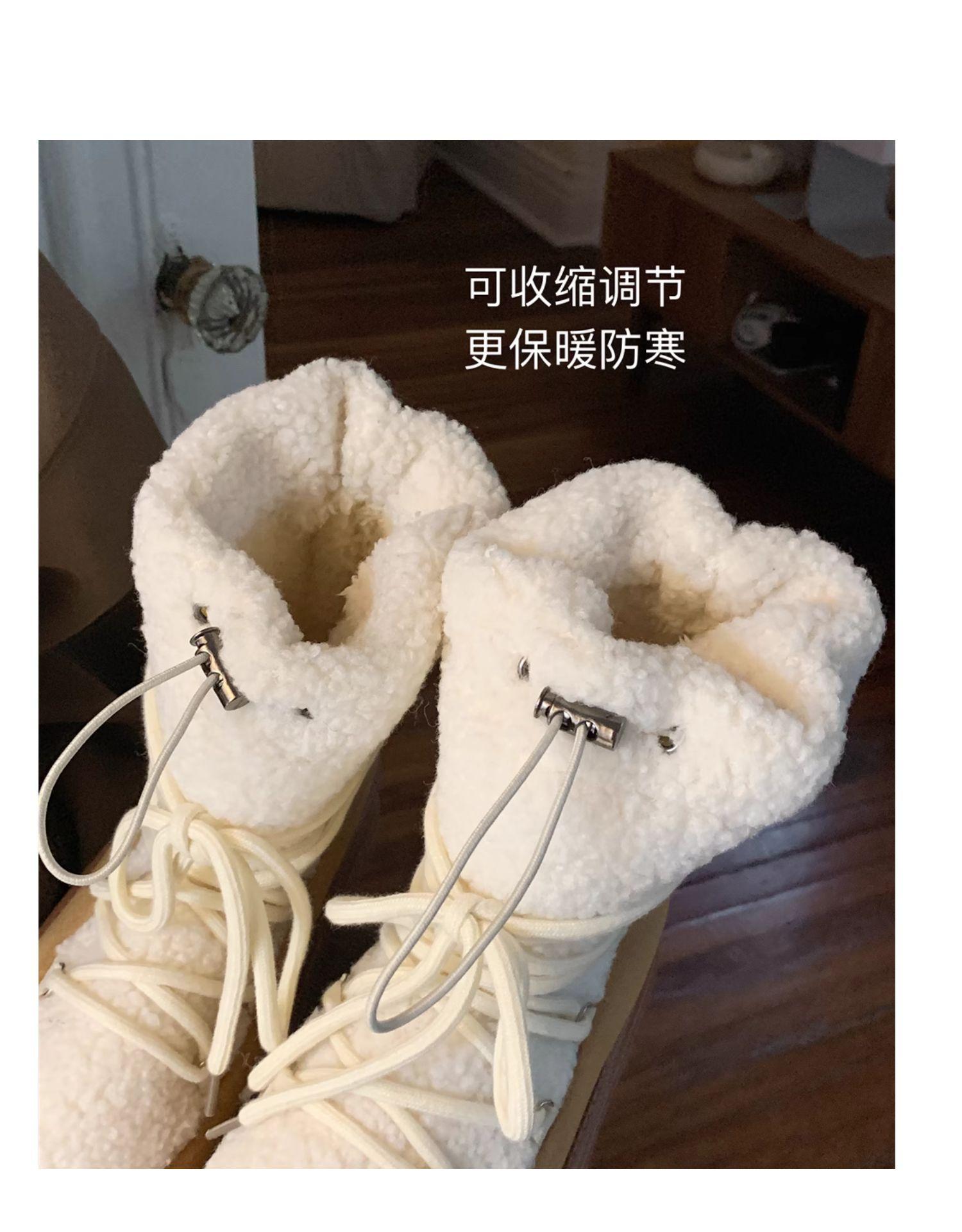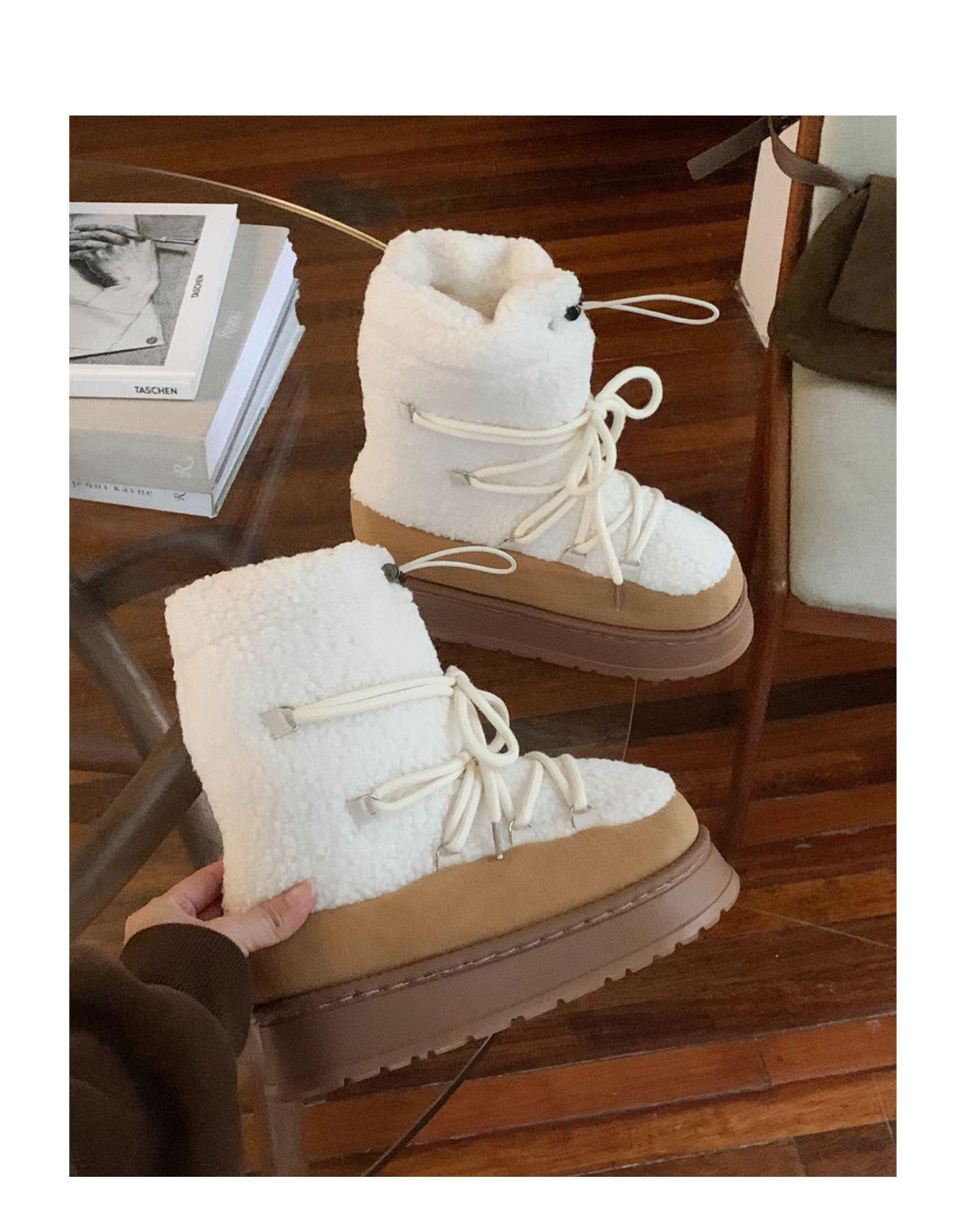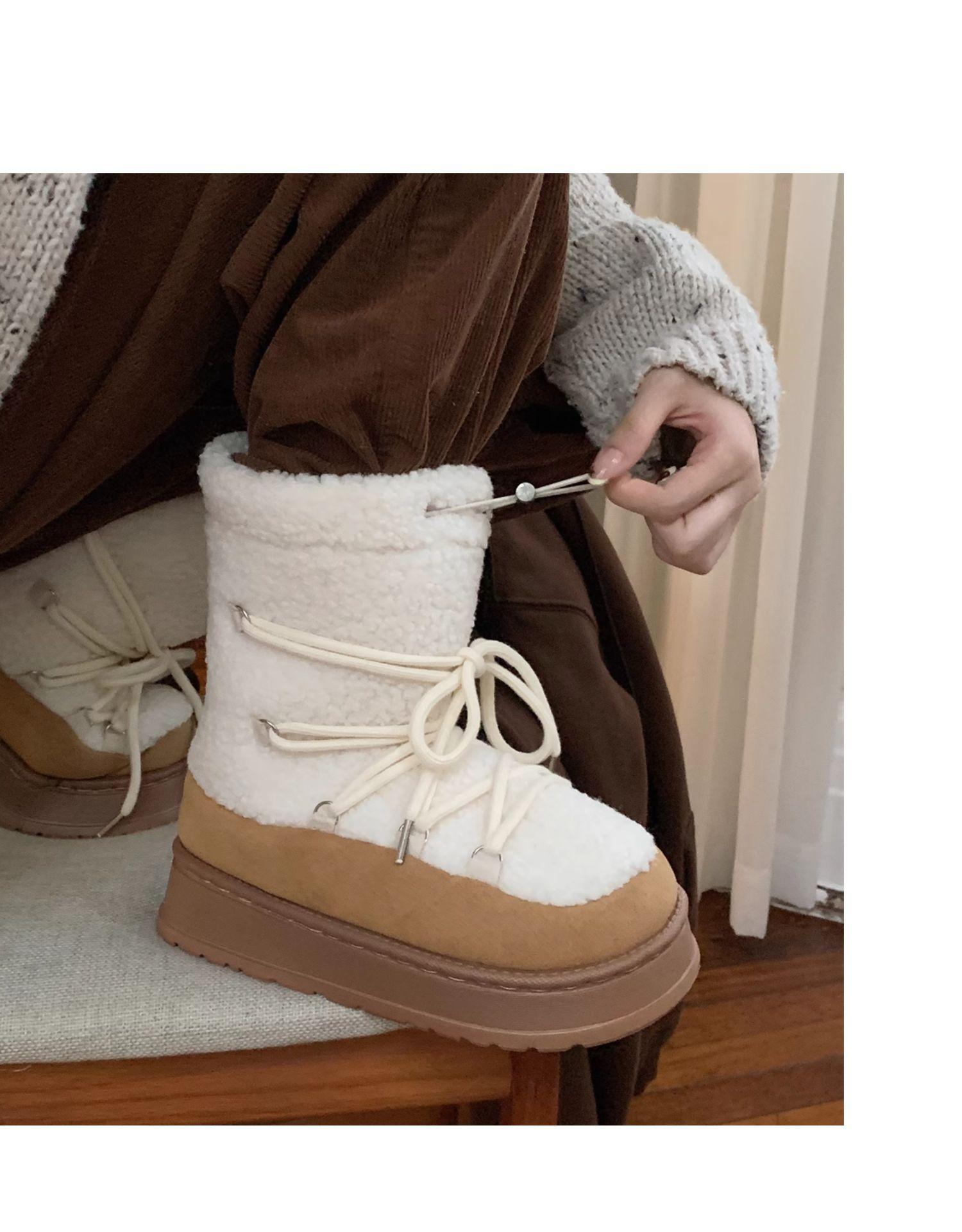 Botas de Nieve con Tiras de Lana de Cordero de Otoño e Invierno 2025 Nuevas Botas Retro de Moda para Mujer de Media Caña Zapatos de Algodón Cálidos Aumentados