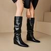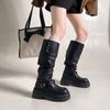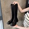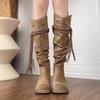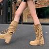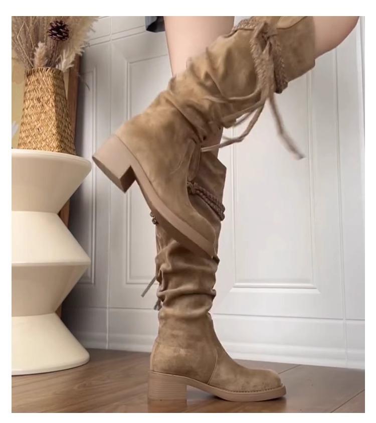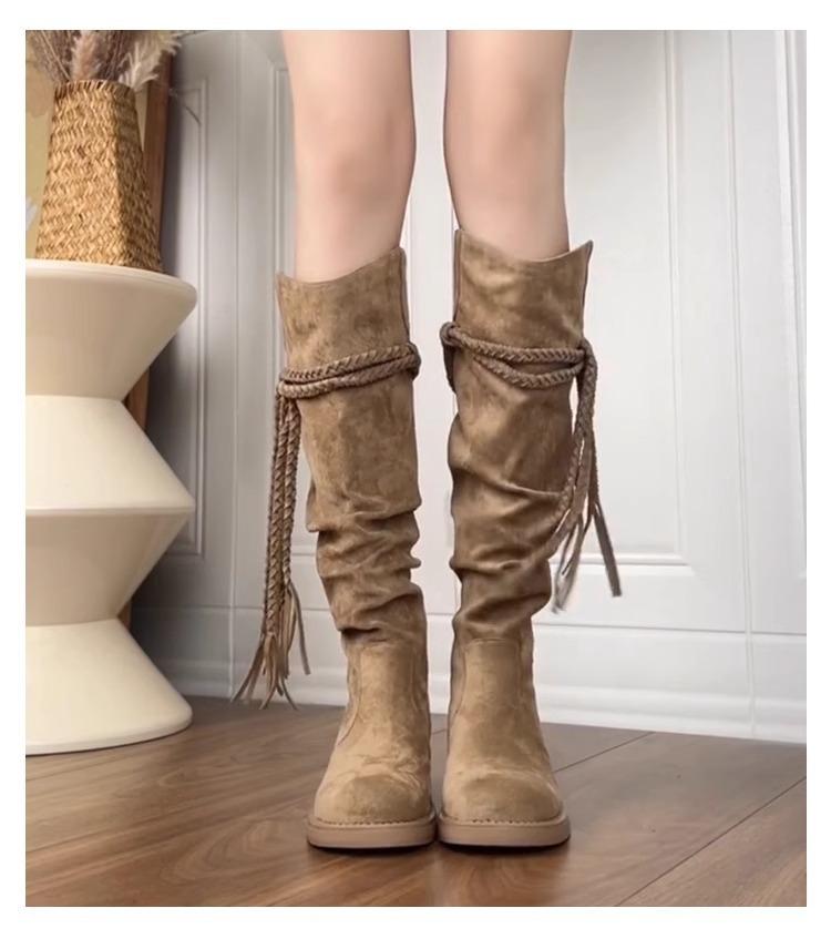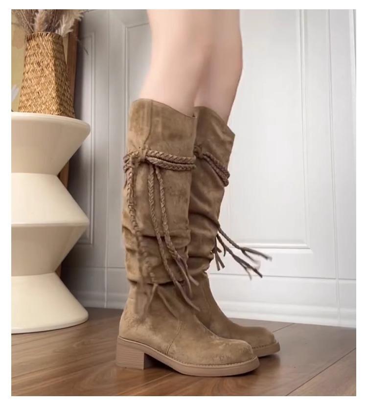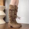 Versión de cuero suave ~ botas de caballero con borlas de viento y tierra de desecho retro, botas de tacón grueso pero hasta la rodilla, botas apiladas para mujer