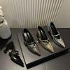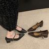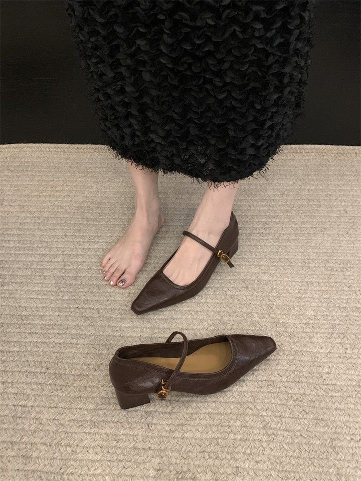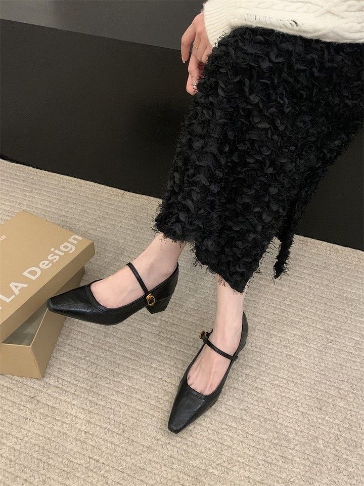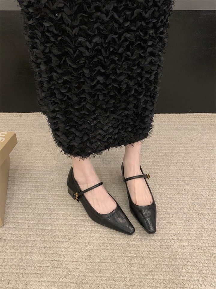 Zapatos Mary Jane Punta Afilada Boca Baja Primavera 2025 Nuevo Estilo Tacón Grueso Correa con Hebilla Francesa con Falda Zapatos Elegantes de Mujer
