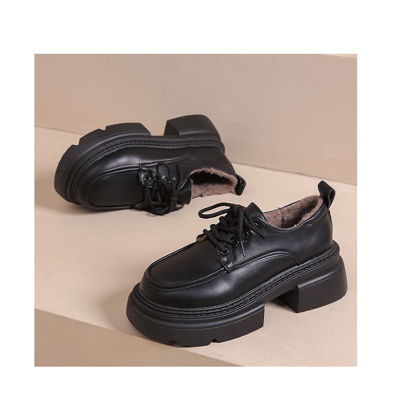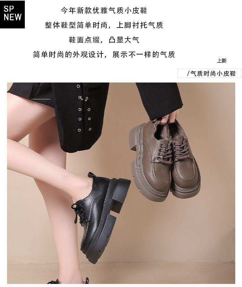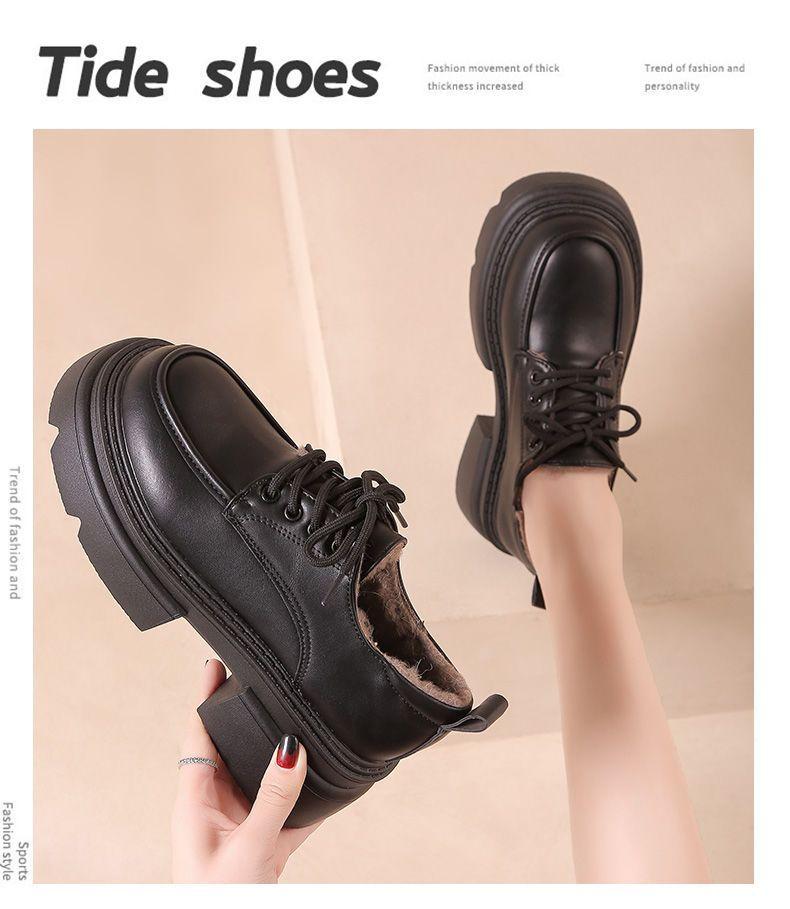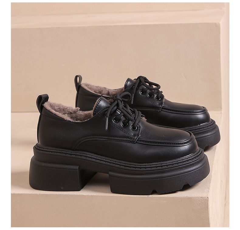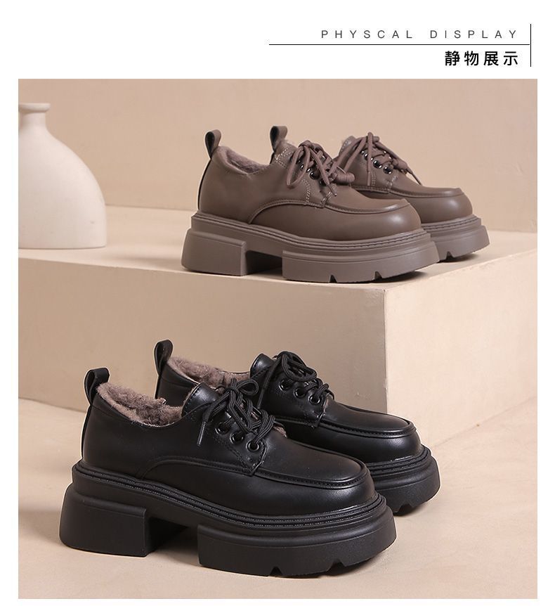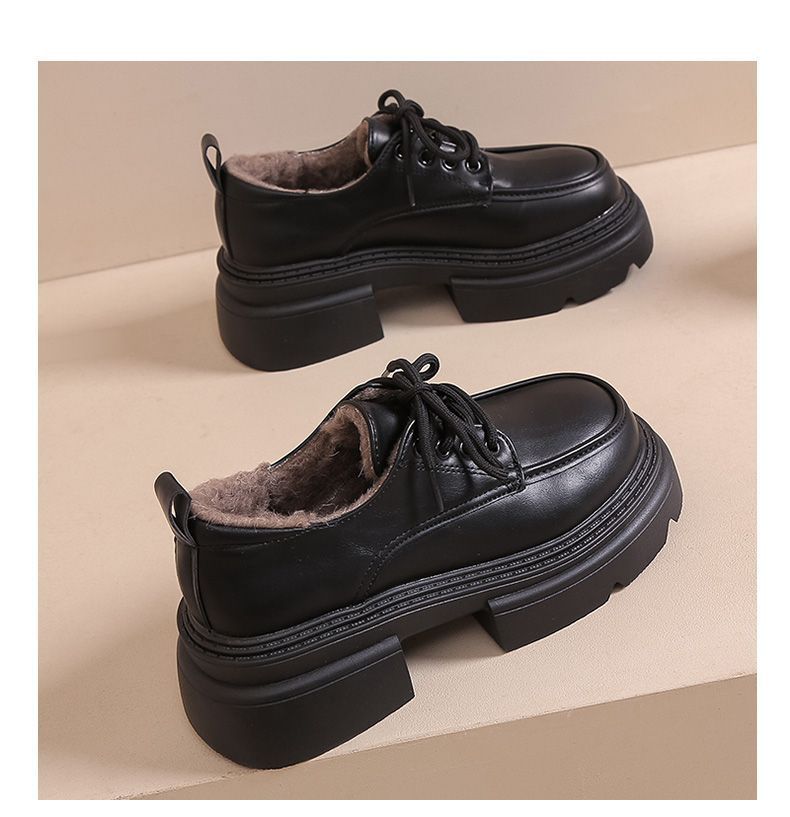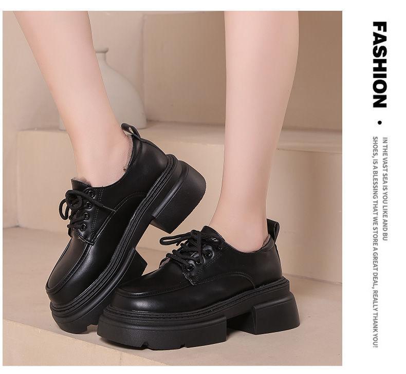 Zapatos de cuero con cordones estilo británico para mujer, invierno 2023, nuevos mocasines de plataforma con forro polar retro versátiles que aumentan la altura