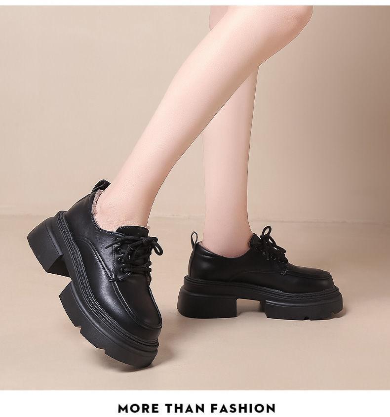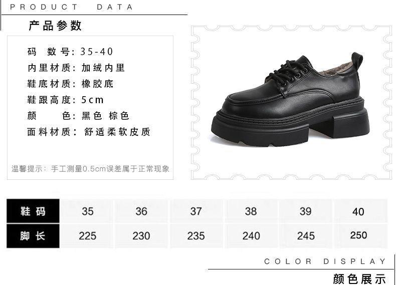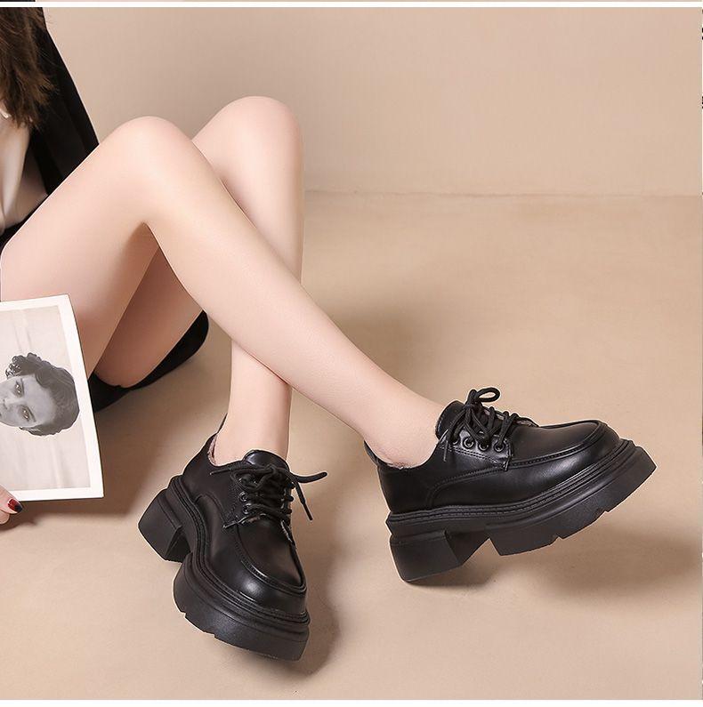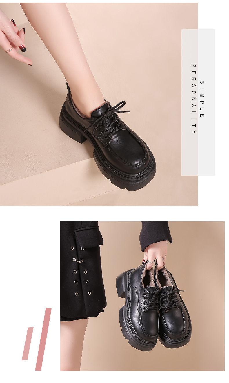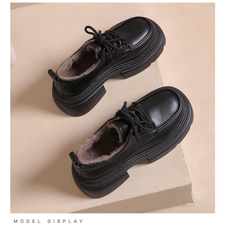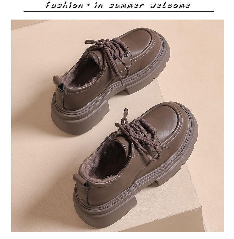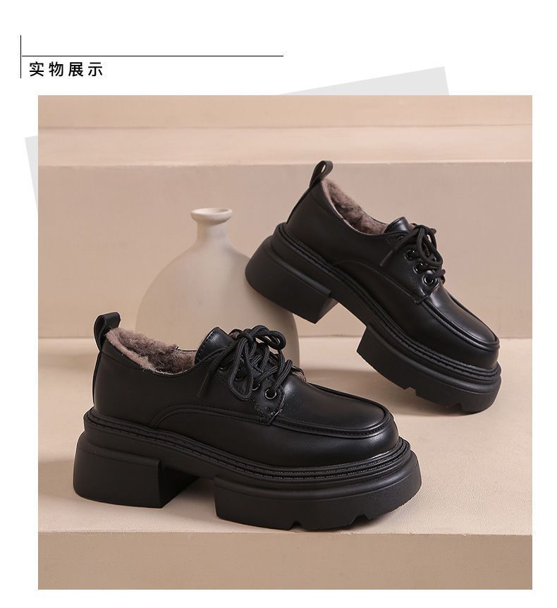 Zapatos de cuero con cordones estilo británico para mujer, invierno 2023, nuevos mocasines de plataforma con forro polar retro versátiles que aumentan la altura