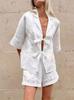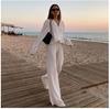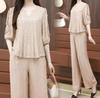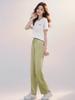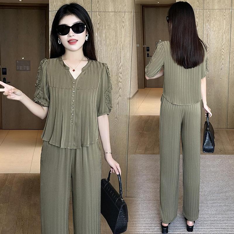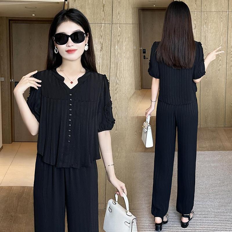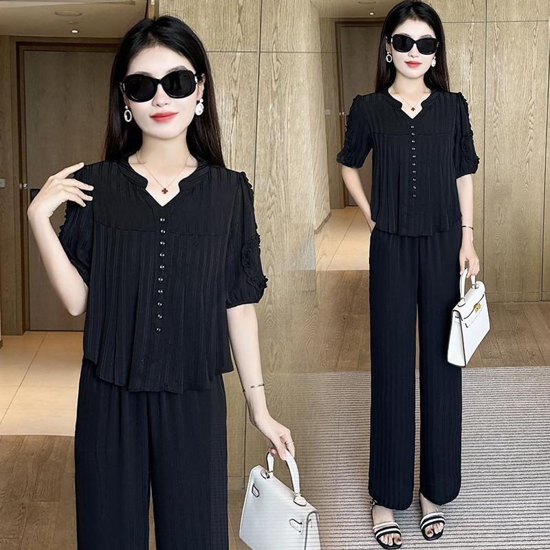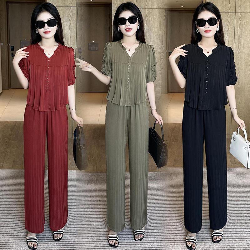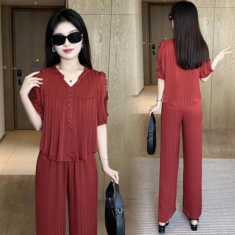 Traje de moda de seda de hielo para mujer, verano 2024, nuevo diseño, corte entallado, manga corta, pantalones anchos, conjunto de dos piezas
