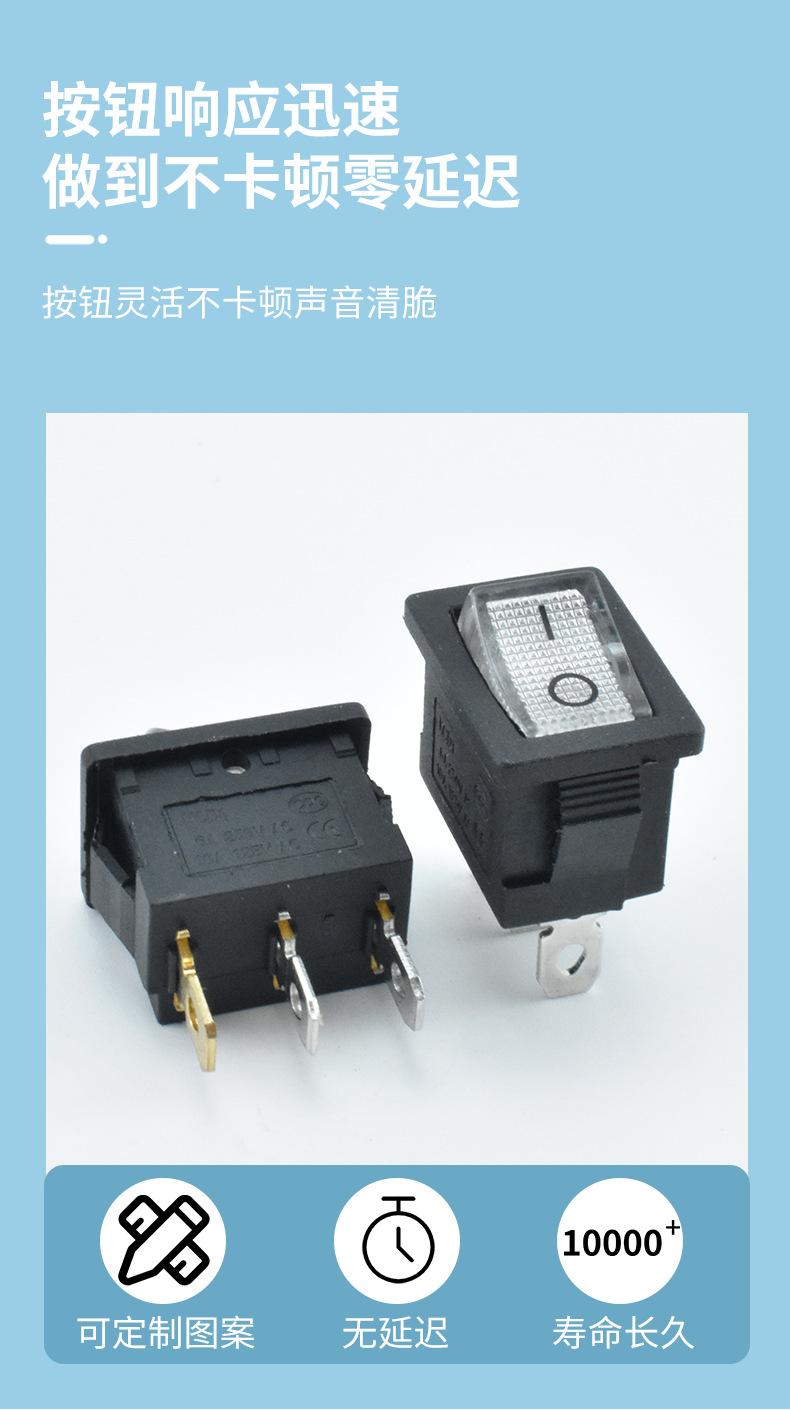 Introducción al interruptor de barco: El interruptor de barco también se denomina interruptor de onda. Su estructura es la misma que la del interruptor de botón, excepto que la manija del botón tiene forma de barco. El interruptor de barco se utiliza a menudo como interruptor de encendido de equipos electrónicos. Sus contactos se dividen en unipolares (de una vía) y bipolares (de dos vías). Algunos interruptores requieren luces indicadoras. Rango de aplicación: Los interruptores basculantes se utilizan en dispensadores de agua, cintas de correr, altavoces de computadora, automóviles a batería, motocicletas, televisores de plasma, cafeteras, regletas de enchufes, máquinas de masaje, etc. Se utilizan principalmente en electrodomésticos. El método de prueba para verificar la vida útil del interruptor basculante consiste principalmente en comprobar el número de aperturas y cierres hasta que se dañe. Si no necesita hacerlo manualmente, puede usar un pequeño motor para accionar el interruptor basculante de apertura y cierre y usar un contador para registrar el número de veces. Este interruptor requiere certificación de seguridad. Si el producto se vende en el país, utiliza CQC. Si se vende en el extranjero, depende del país de destino, como UL en Estados Unidos, ETL en Canadá, CUL en Europa y VDE, ENEC, TÜV y otras certificaciones de seguridad. Clasificación del interruptor basculante: 1. SPST: 1 contacto móvil y 1 contacto estático. Solo 1 canal. 2. Unipolar de doble tiro: 1 contacto móvil y 2 contactos estacionarios (los contactos estacionarios de ambos lados se pueden conectar por separado) 3. Bipolar de un solo tiro, 2 contactos móviles y 2 contactos fijos, con 2 canales 4. Bipolar de dos vías, 2 contactos móviles y 4 contactos estáticos, con 4 canales (los 2 contactos estáticos de ambos lados se pueden conectar por separado) Problema de falla del interruptor basculante: Hay una lámina metálica dentro del interruptor con forma de barco, con un punto de apoyo de resorte en el centro. El resorte está desplazado y el soporte de plástico está desgastado y deformado, por lo que el interruptor no es flexible. Puede desconectar la alimentación y revisarlo. Si las piezas de plástico no están dañadas, se puede restaurar. El cable neutro dentro del interruptor es directo y no tiene nada que ver con los componentes. Por lo tanto, si el interruptor se dispara y el interruptor de aire está activado, la capa de aislamiento del cable neutro que pasa por el interruptor está dañada. Puede cortar la sección dañada y recablearla. Preste atención al aislamiento. También podría ser que la base de la luz indicadora esté en cortocircuito, así que simplemente recablee.。