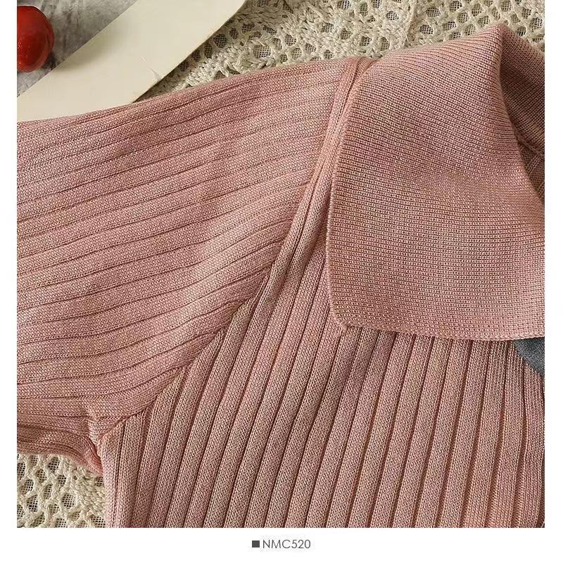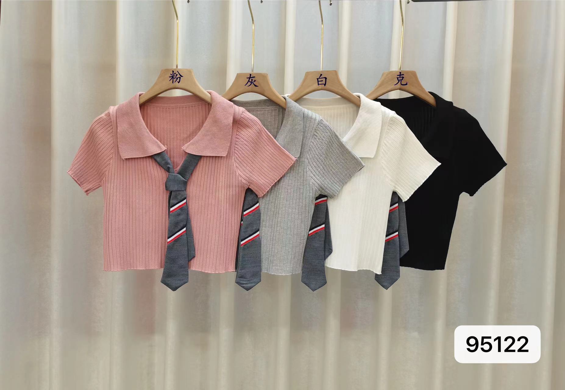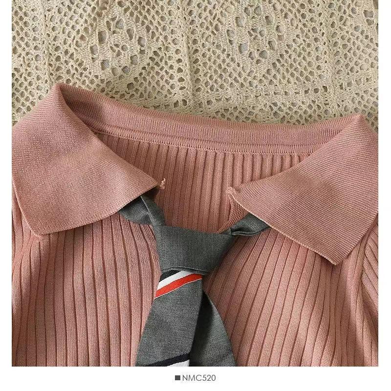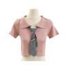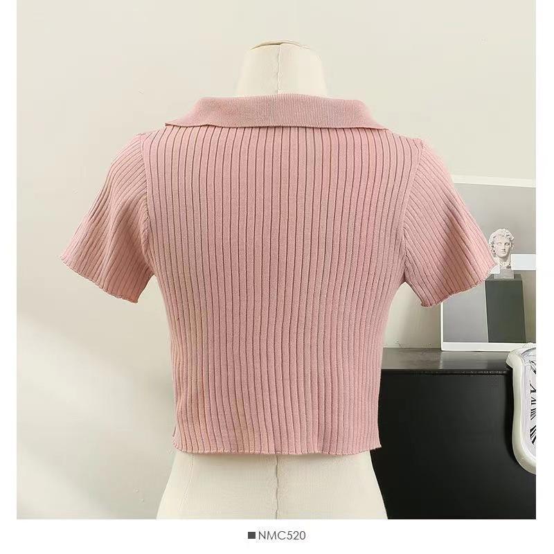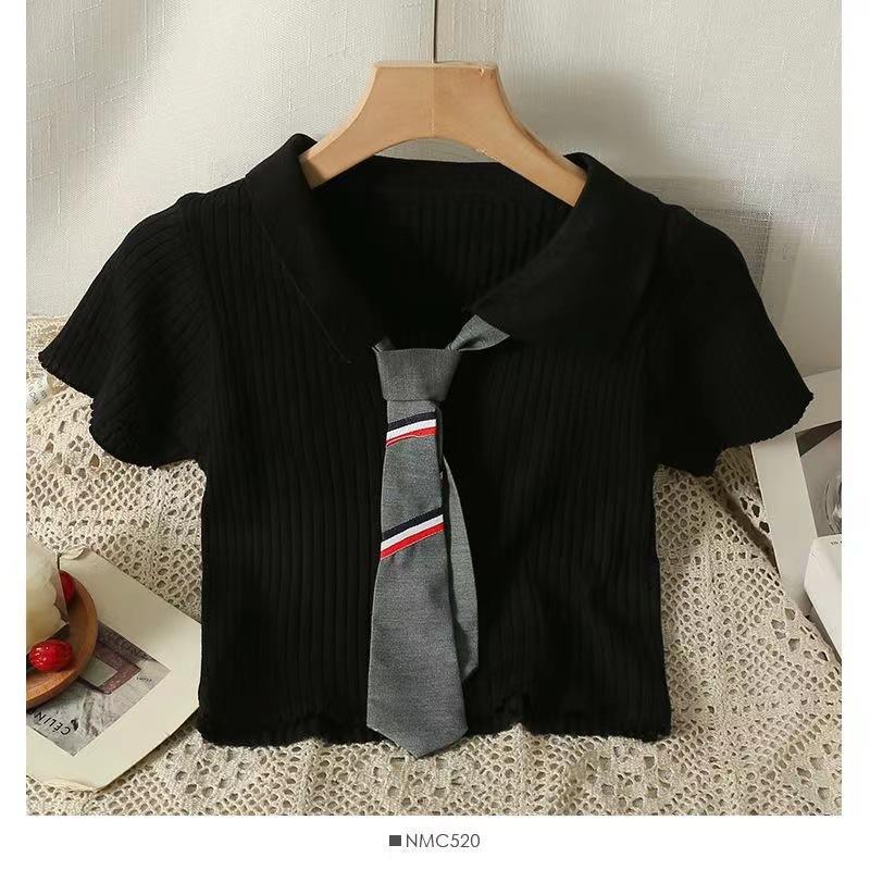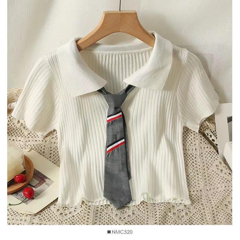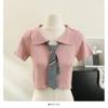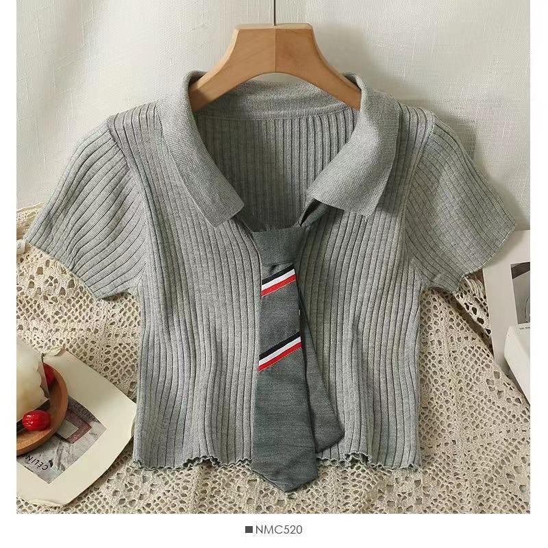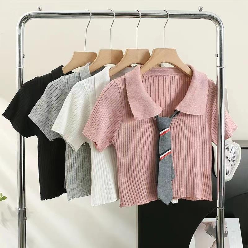Suéter de punto de seda helada de manga corta con cuello polo vintage para mujer, nuevo estilo de punto de verano, prenda exterior fina y corta para mujer
