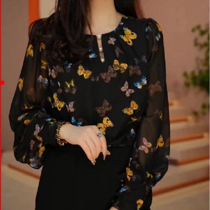 Camisa floral francesa para mujer, nueva primavera y otoño 2024, estilo occidental, camisa pequeña, informal, holgada, de manga larga, de gasa, que cubre el vientre.