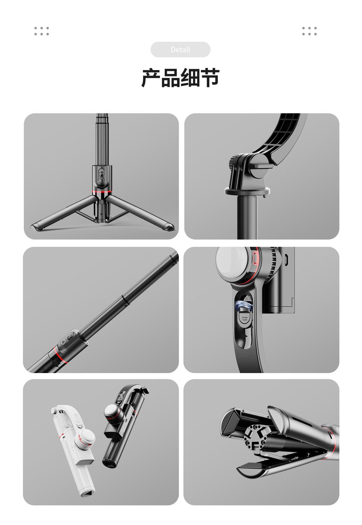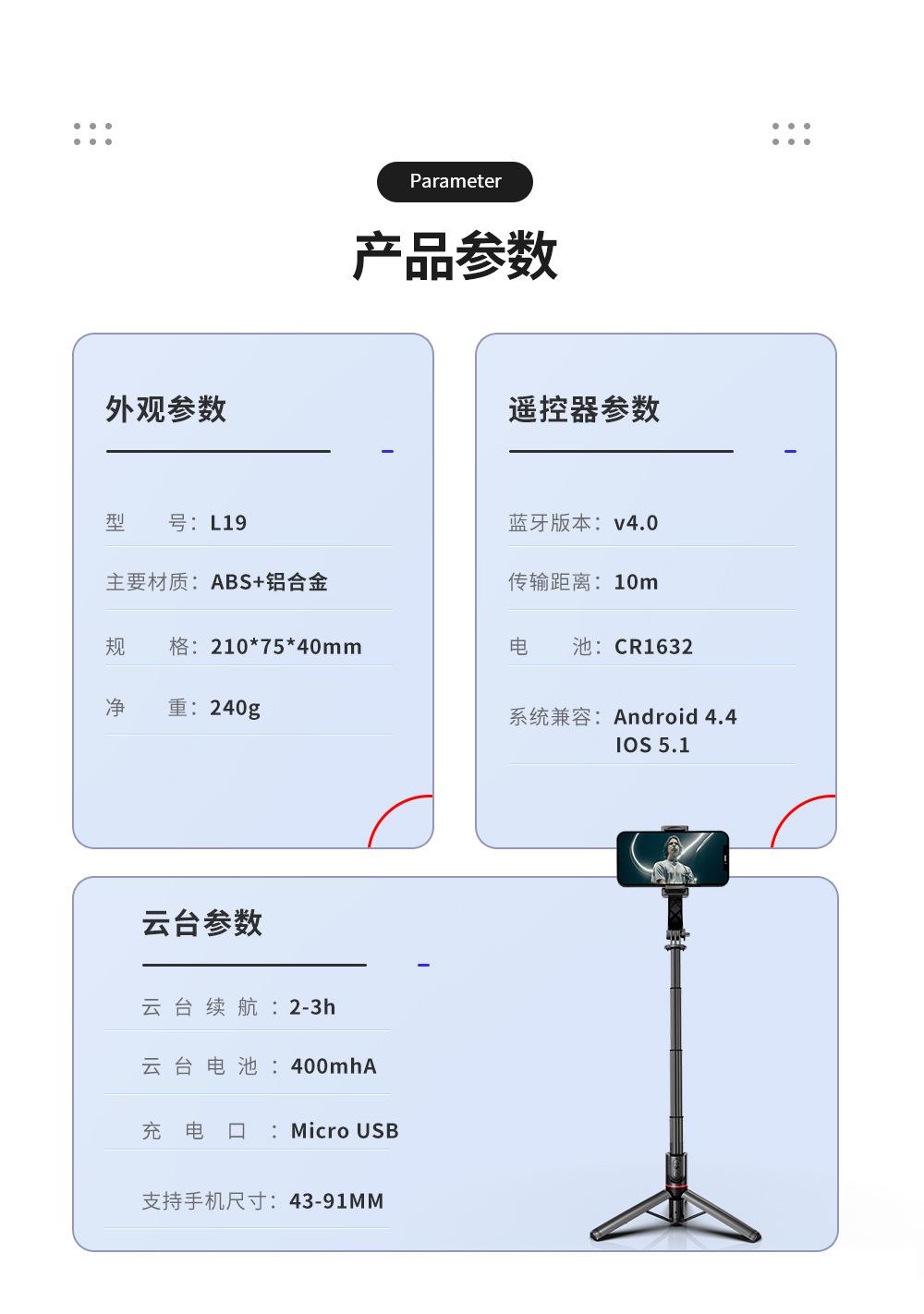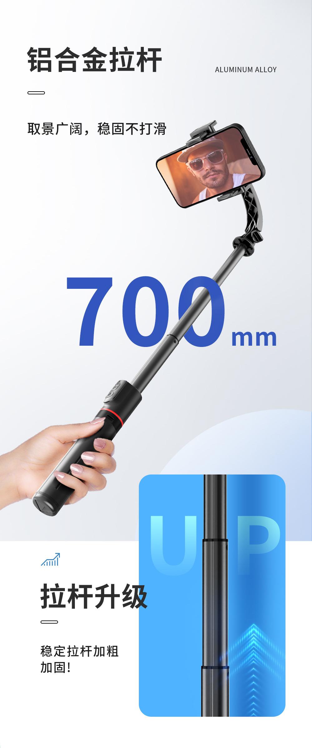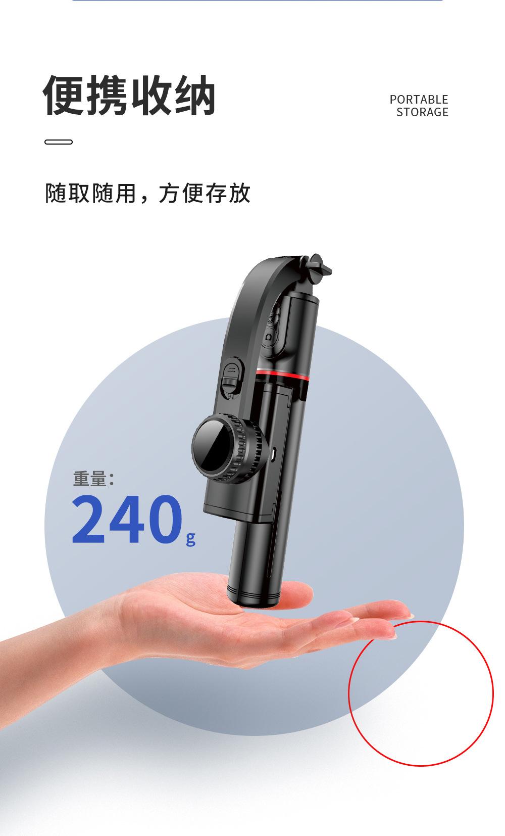 Tamaño del producto: 75 x 40 x 210 mm - 700 mm Tamaño del paquete: 56.5 x 92.5 x 227.5 mm Peso del equipo: Peso neto 240g Peso bruto 412g Dimensiones de la caja exterior: 495 x 305 x 300 mm Peso de la caja exterior: 13.8KG Cantidad por caja: 30 piezas Material:ABS+Aleación de Aluminio Batería para selfie: CR1632 Ángulo de rotación: 90 grados/vez (automático/manual) Tiempo de trabajo: aproximadamente 2 horas. Voltaje de trabajo: 3,7 V Corriente de trabajo: alrededor de 400mA (al ajustar el balance) Puerto de carga: Micro-USB