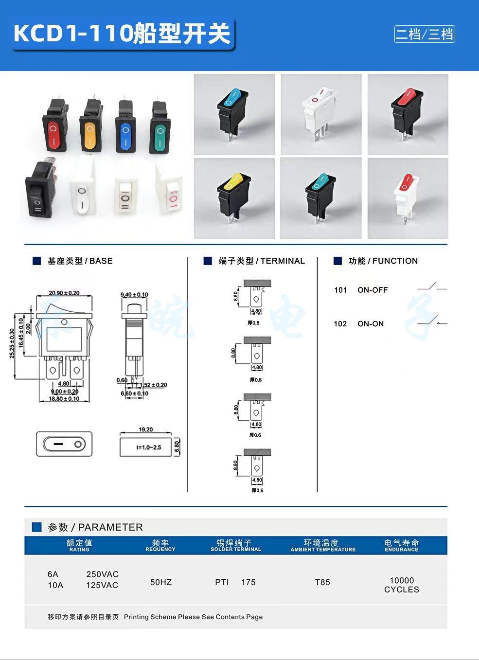Interruptor en forma de barco Kcd1-110 Negro 2 pines Dos velocidades 9.5*21mm Dos pines 2 velocidades Interruptor basculante de auto-reinicio