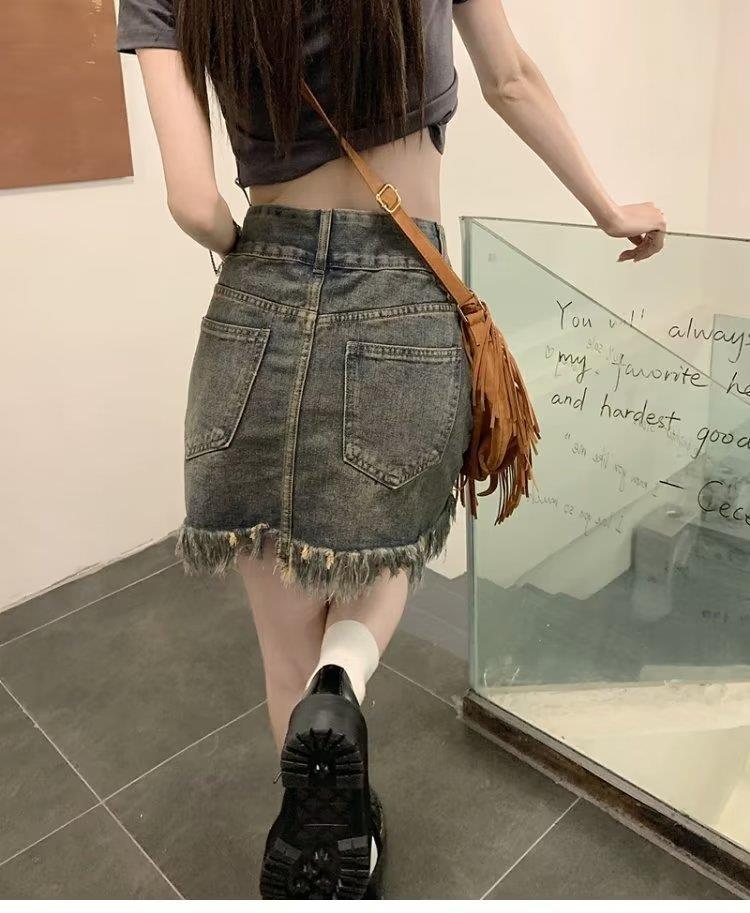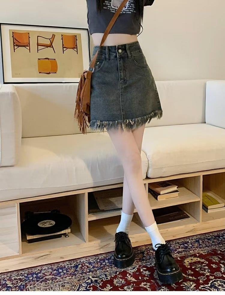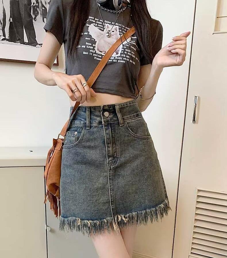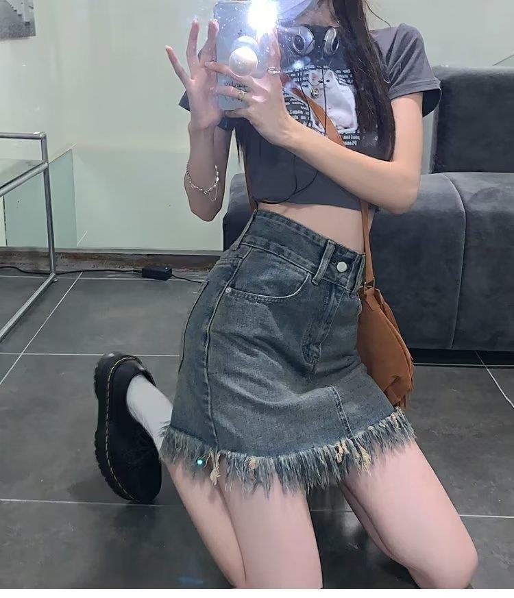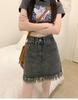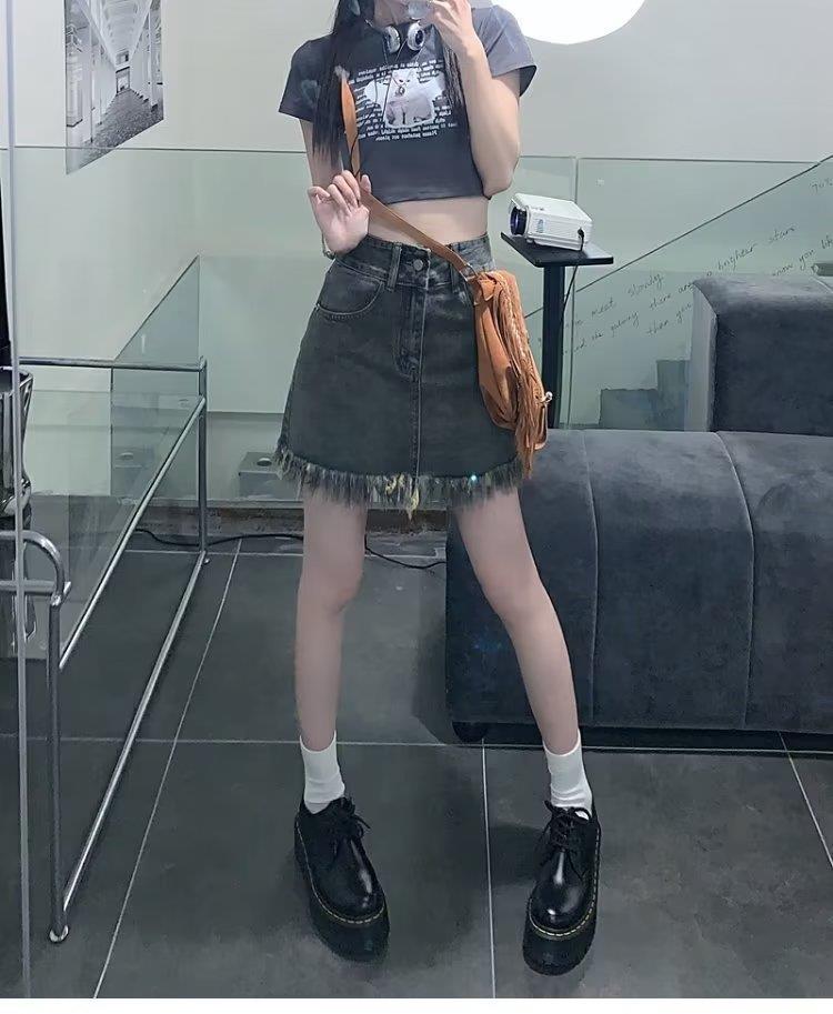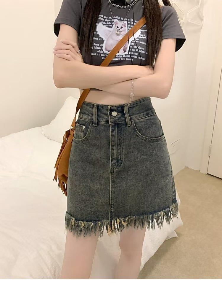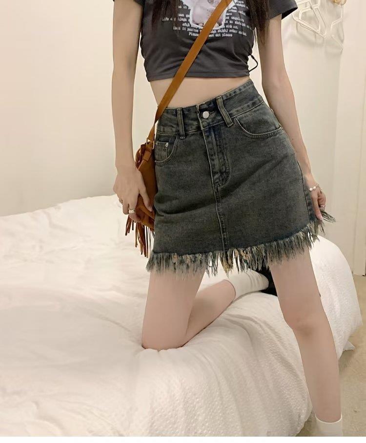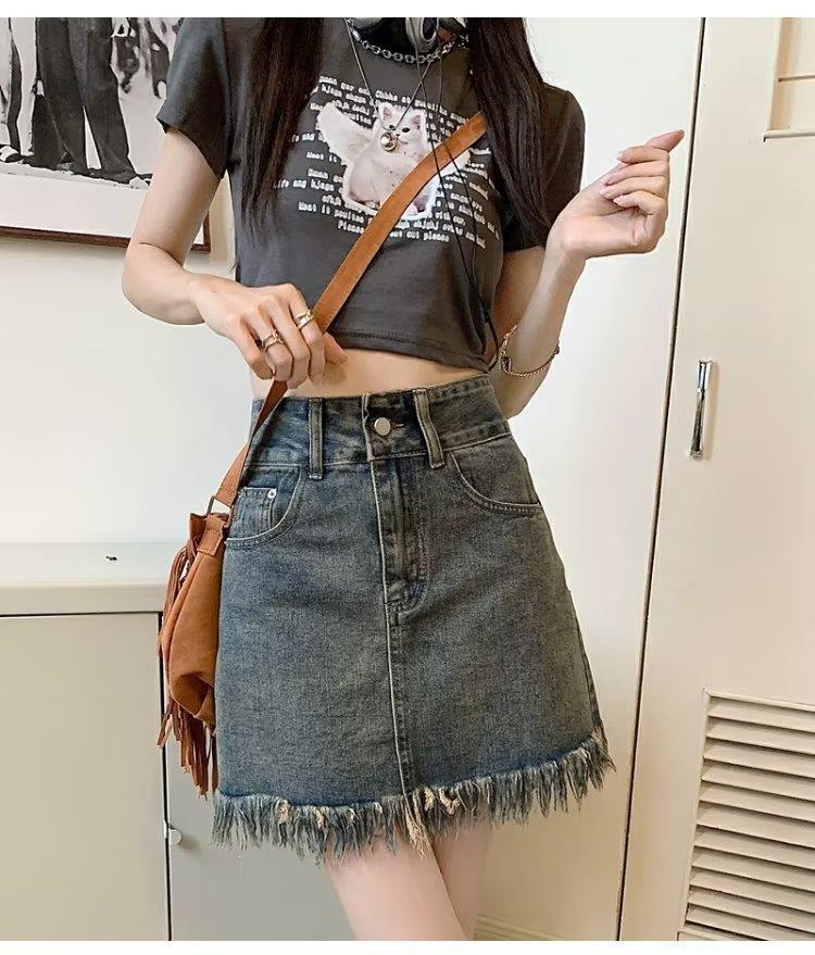 Falda de mezclilla corta para chica sexy verano 2023 nuevo diseño cintura alta delgada con flecos falda línea A