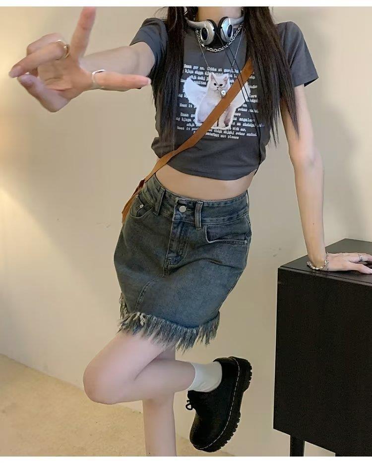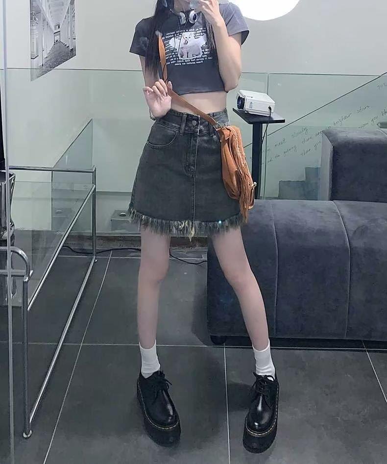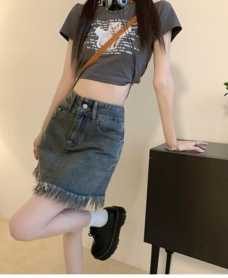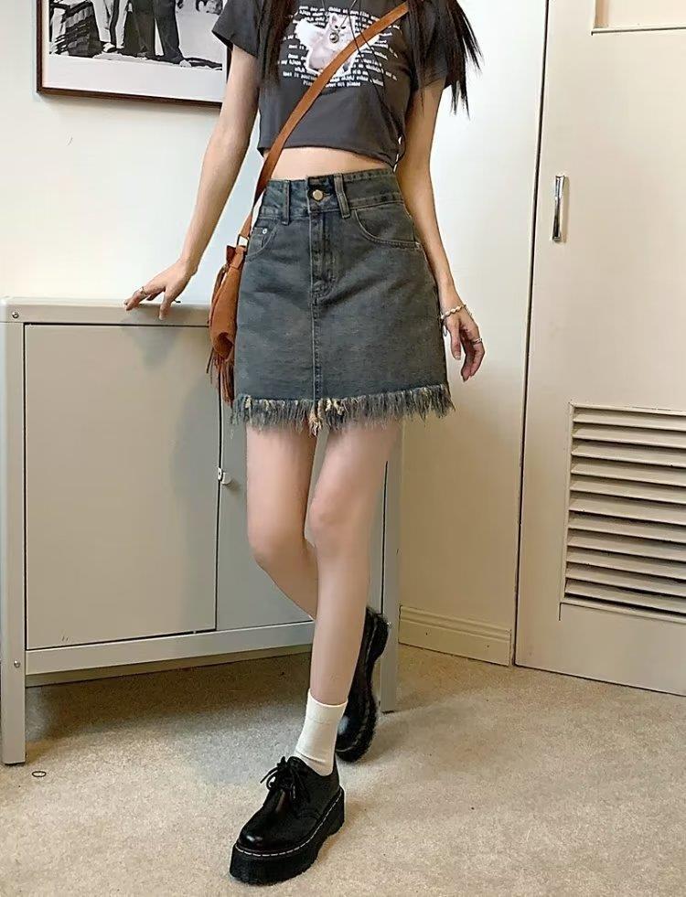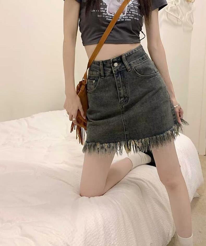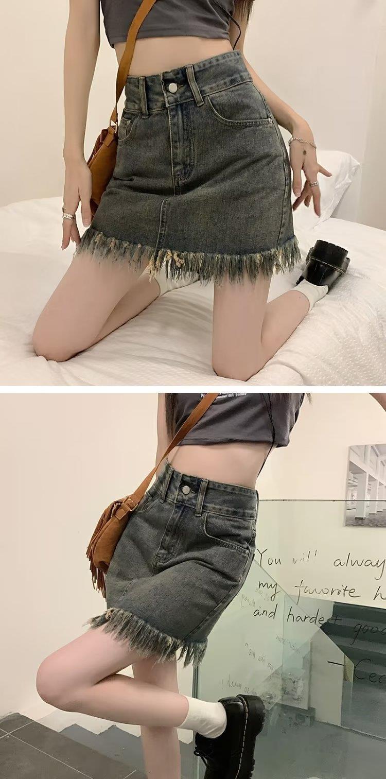 Falda vaquera retro con flecos de talla grande, falda media para mujer, verano nuevo, talla grande, cintura alta, delgada, línea A, cadera, falda corta
