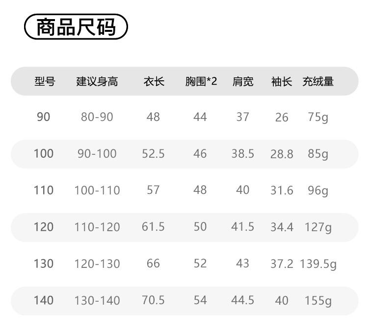 90 down filling capacity 75g, 100 down filling capacity 85g, 110 down filling capacity 96g, 120 down filling c...