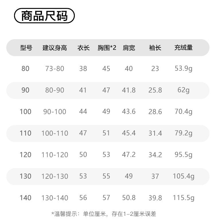 80 down filling capacity 53.9g, 90 down filling capacity 62g, 100 down filling capacity 70.4g, 110 down fillin...