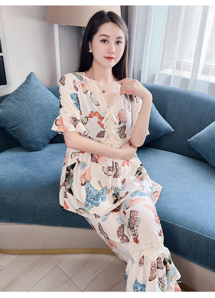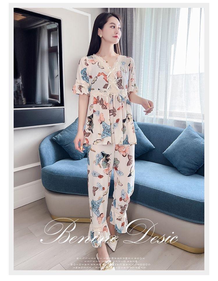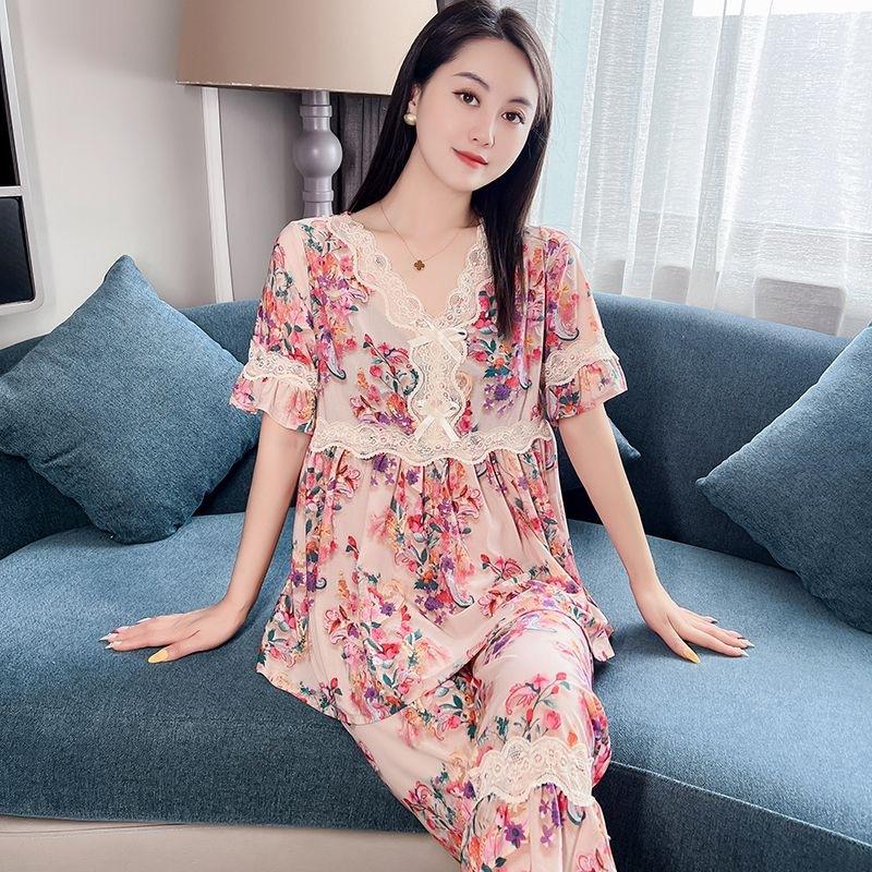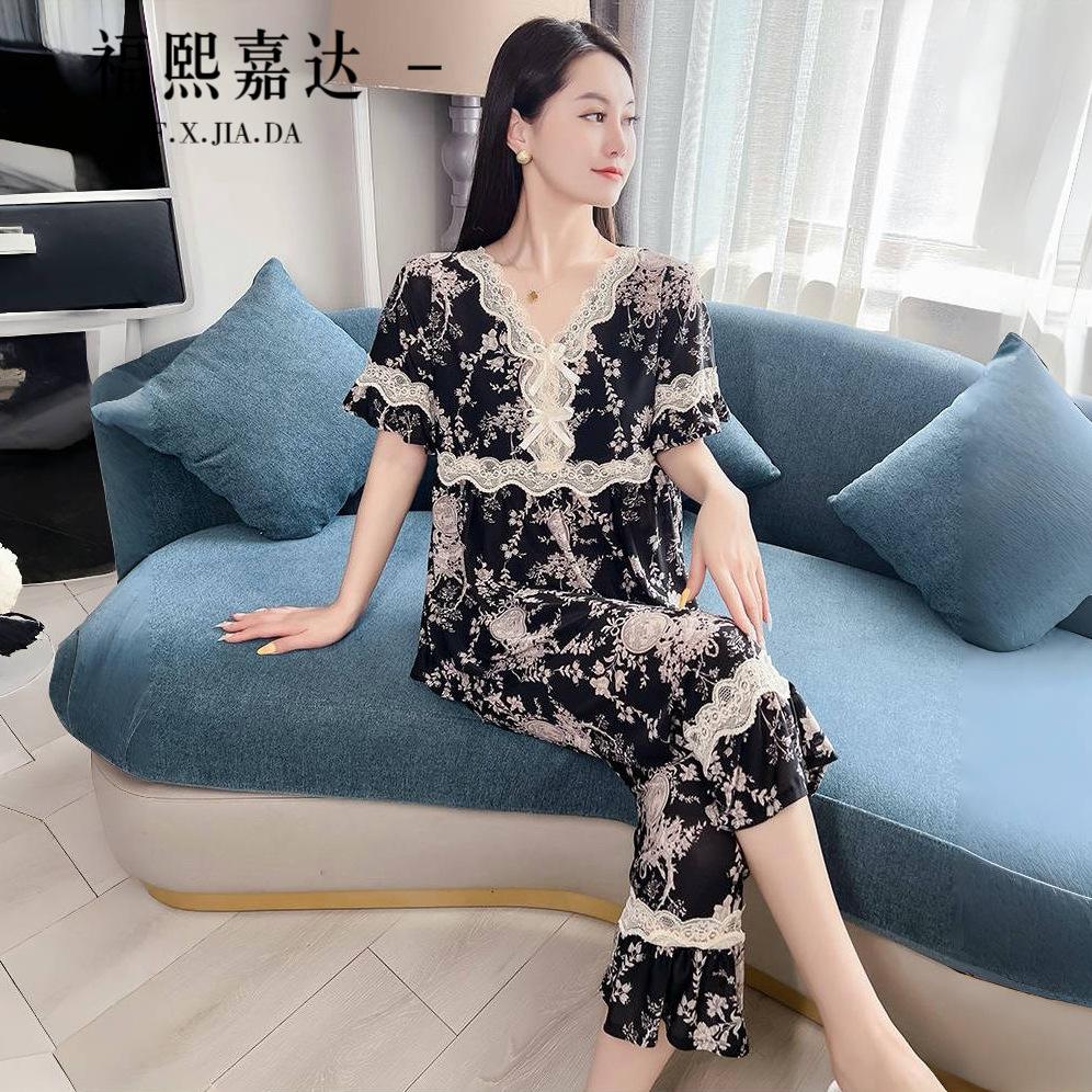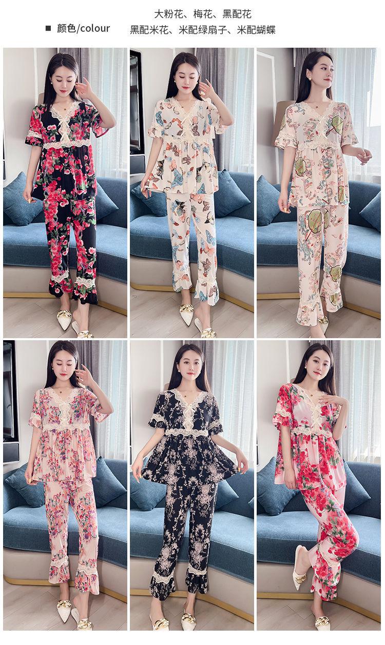 Traje de pijama popular de Internet para mujer de verano delgado a la moda holgado con cuello en V encaje manga corta ropa de casa para salir