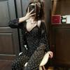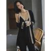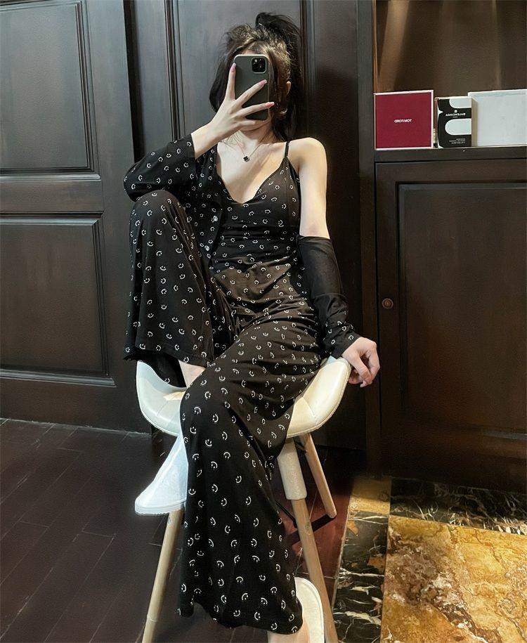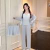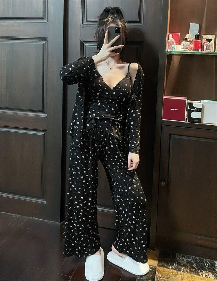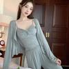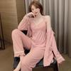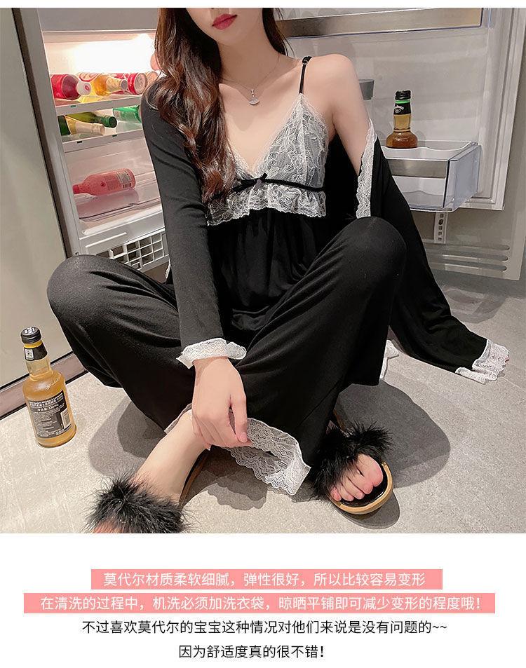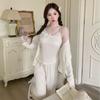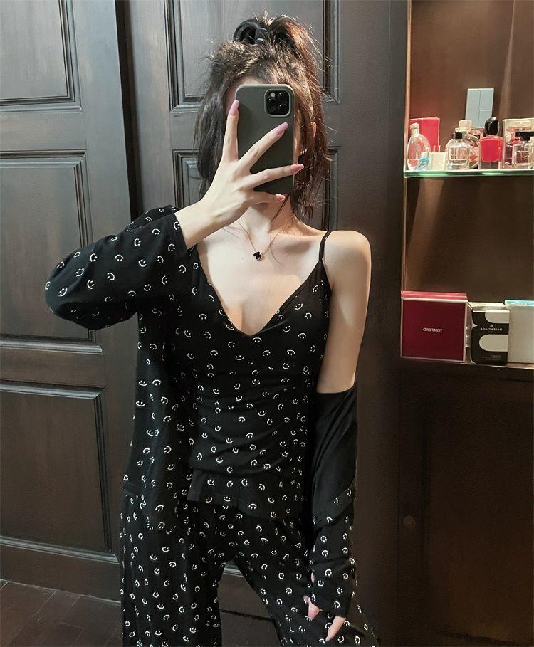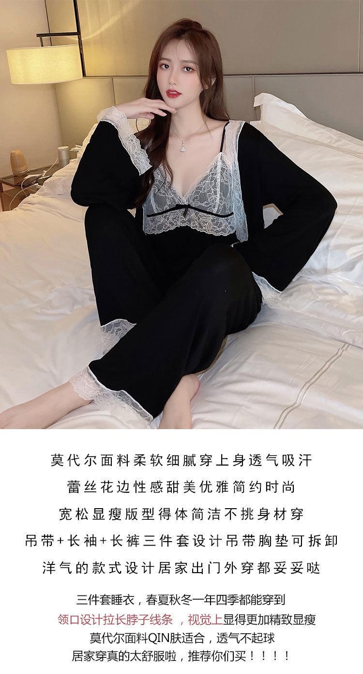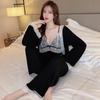 Pijama de tres piezas para mujer, sexy, con tirantes, de algodón, de manga larga, con cinturón y almohadilla para el pecho, para el hogar, para primavera y otoño