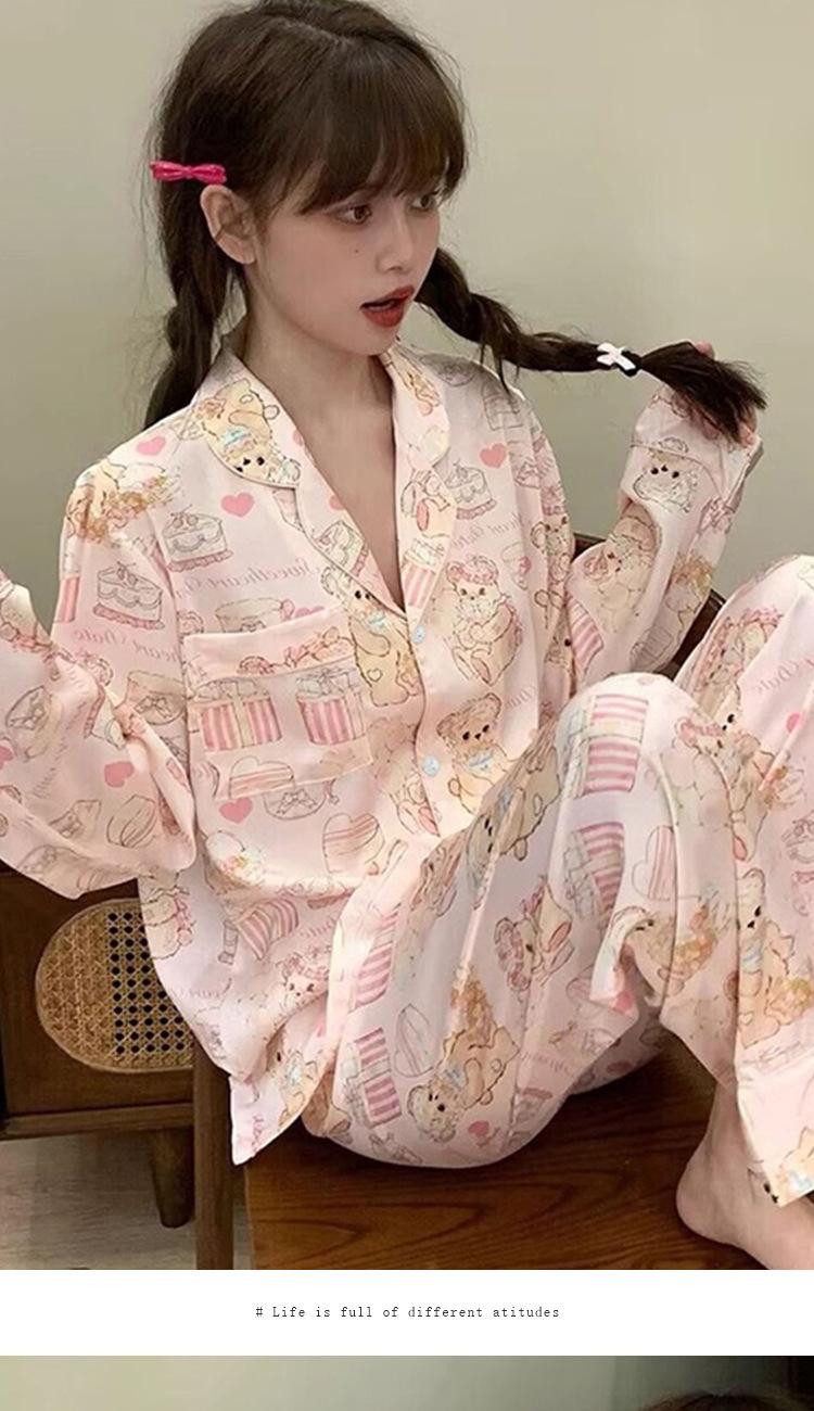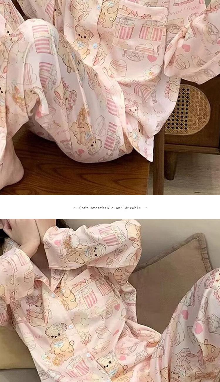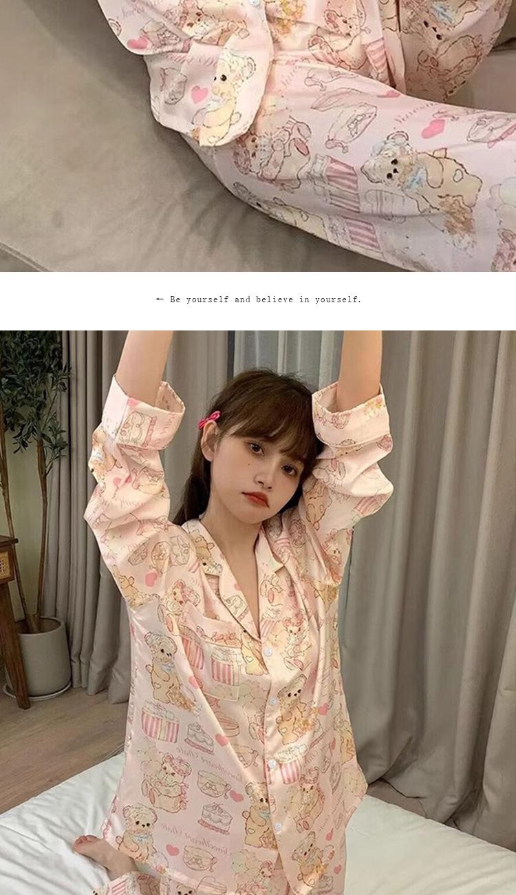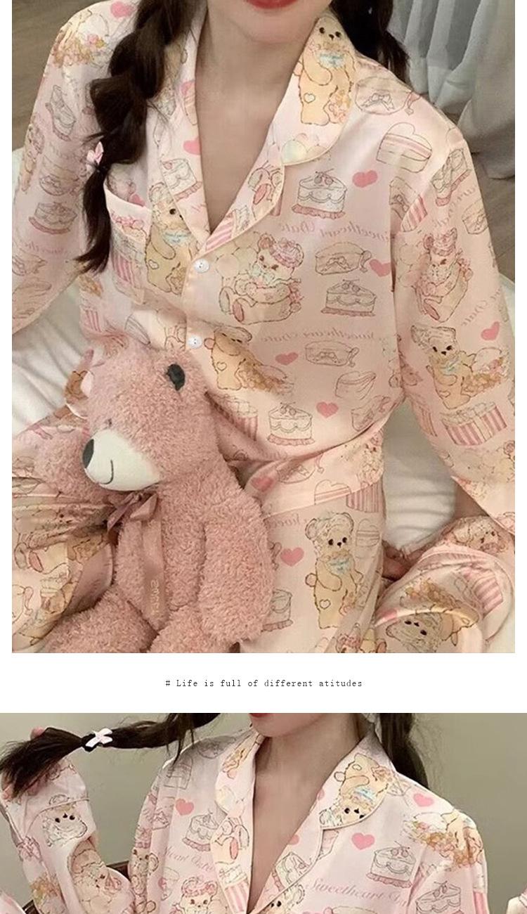 Pijama de seda helada con diseño de oso de pastel de estilo coreano para mujer, traje de manga larga de otoño, ropa de casa de estilo popular de red para niñas, se puede usar al por mayor
