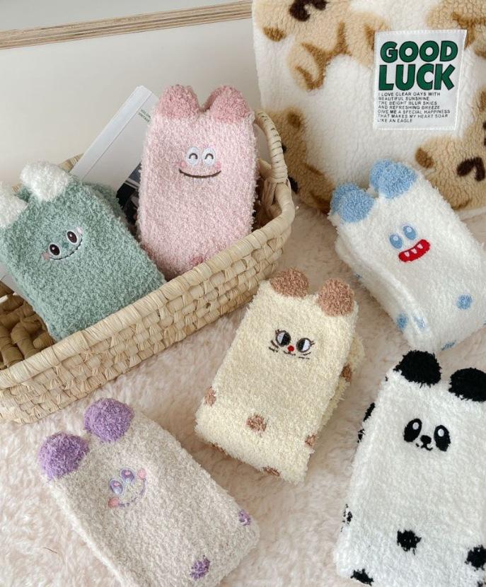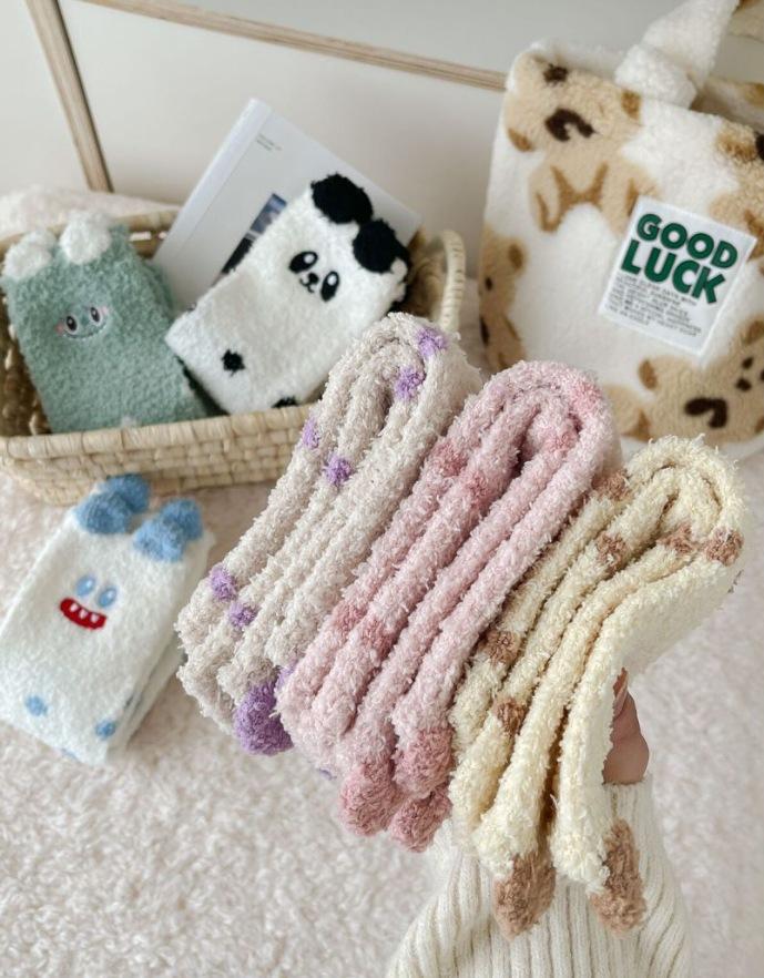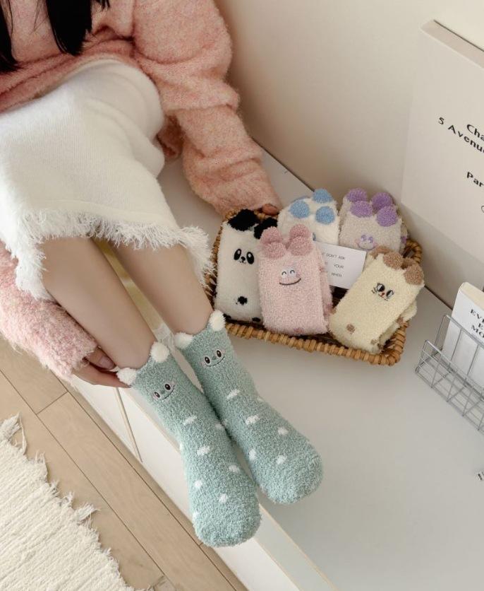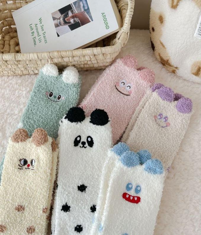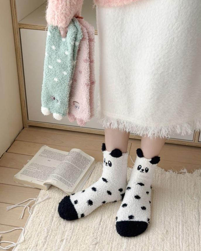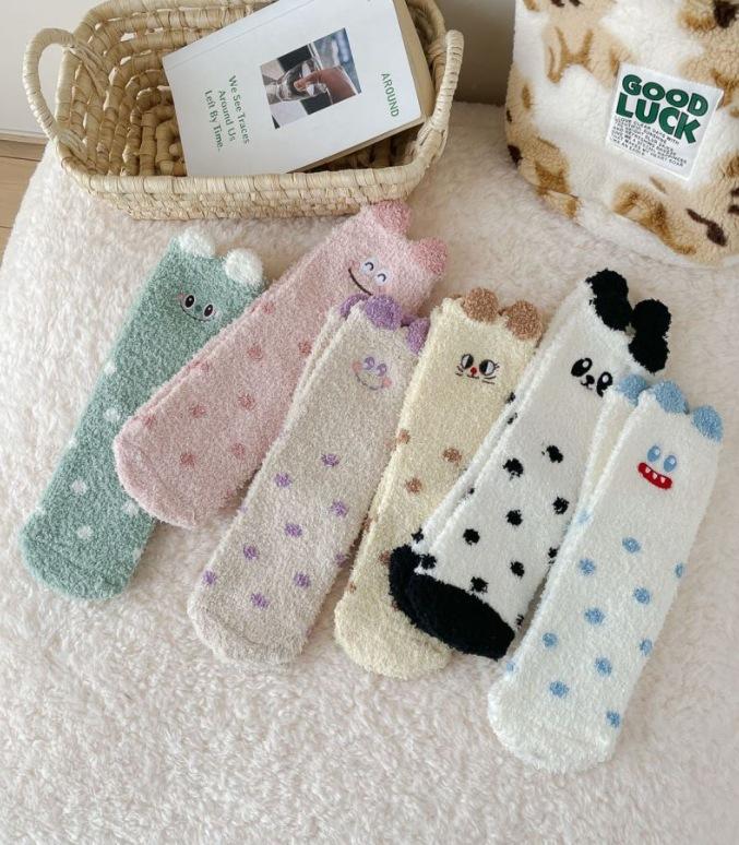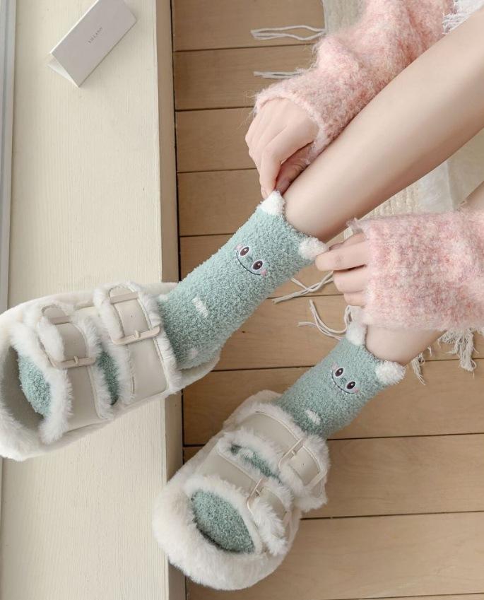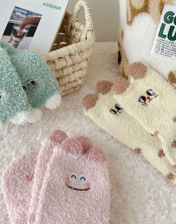 Calcetines de lana coral de tubo medio para mujer, nuevos calcetines de otoño e invierno con dibujos de animales, calcetines para el hogar, calcetines bordados para dormir, calcetines cálidos