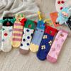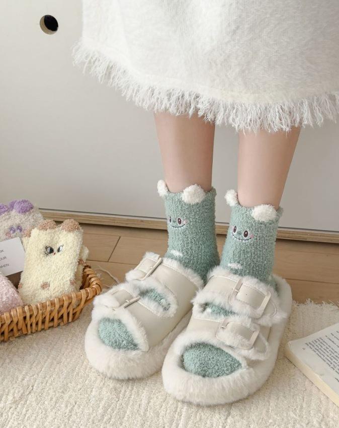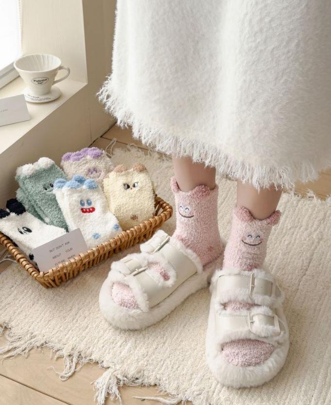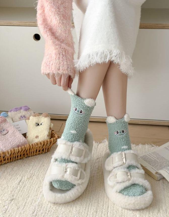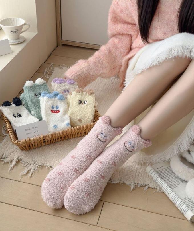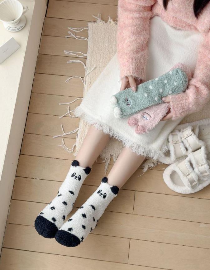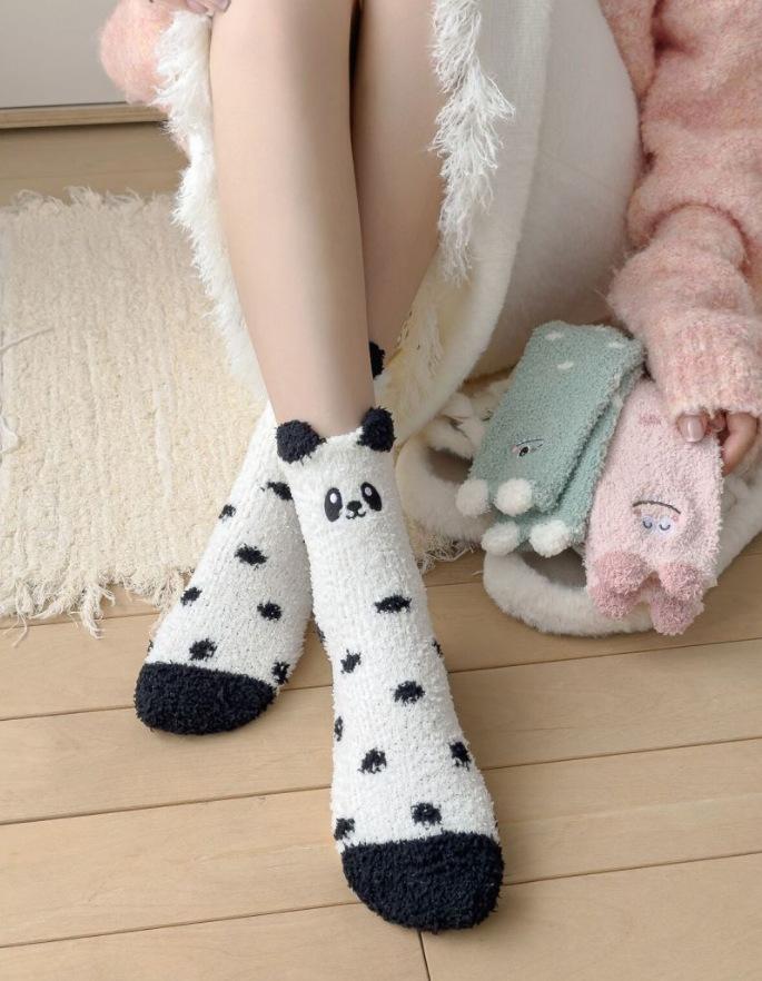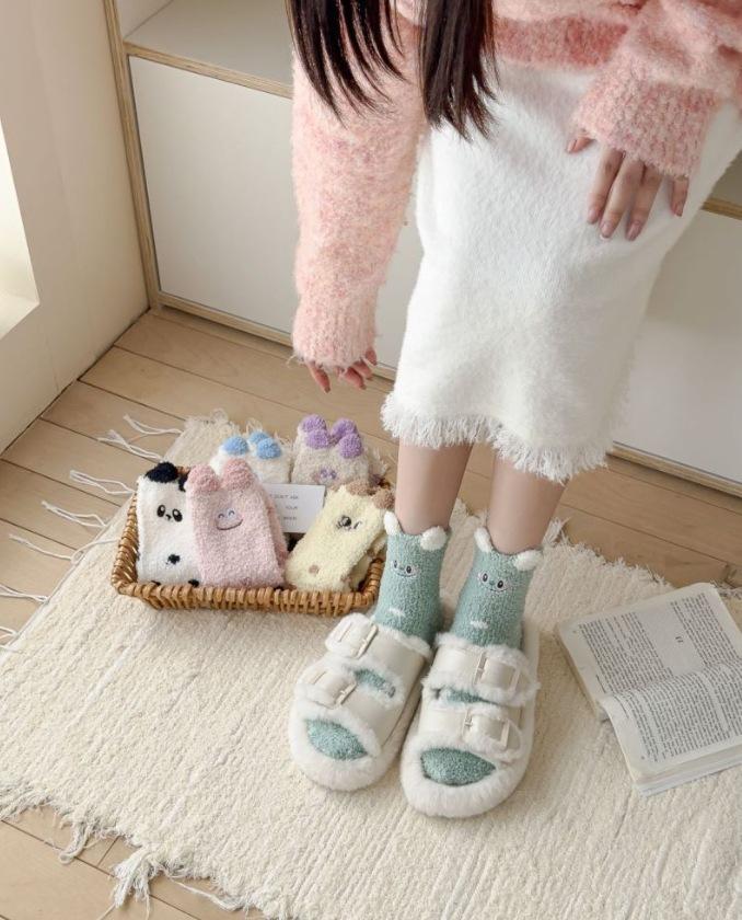 Calcetines de lana coral de tubo medio para mujer, nuevos calcetines de otoño e invierno con dibujos de animales, calcetines para el hogar, calcetines bordados para dormir, calcetines cálidos