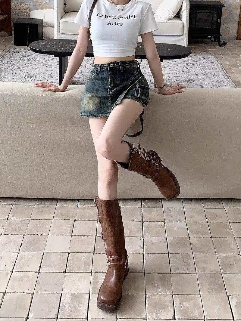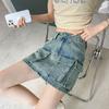 Falda corta de mezclilla para mujer, verano 2024, nueva, cintura alta, adelgazante, pequeña, línea A, falda de cadera, falda de media longitud, hakama