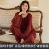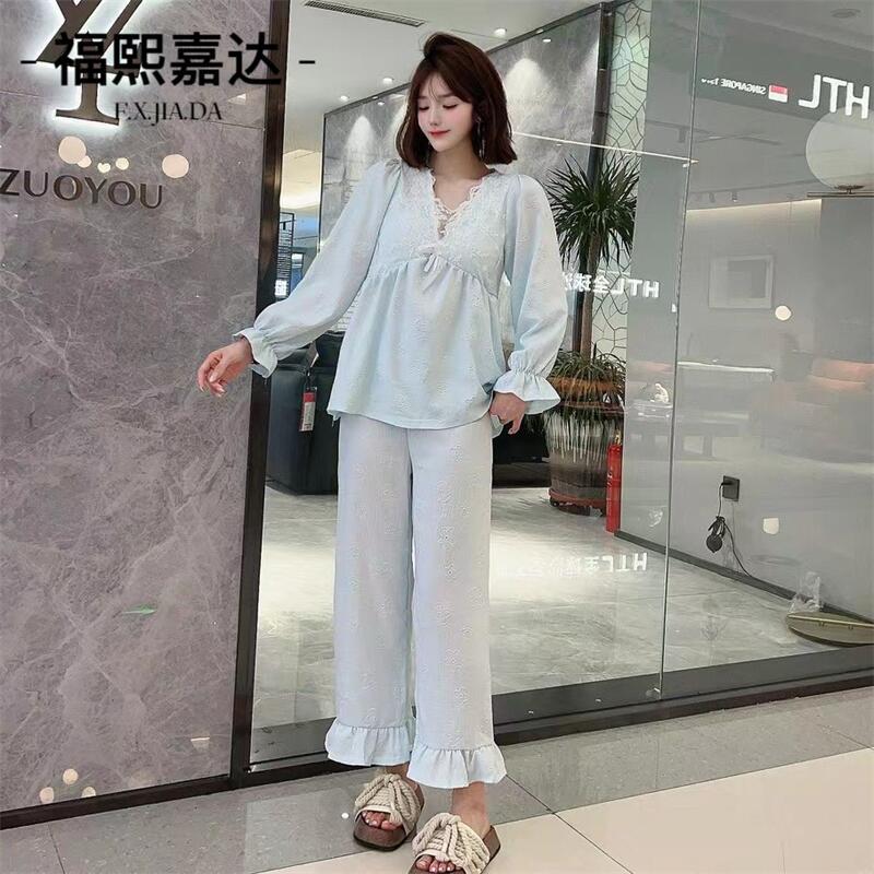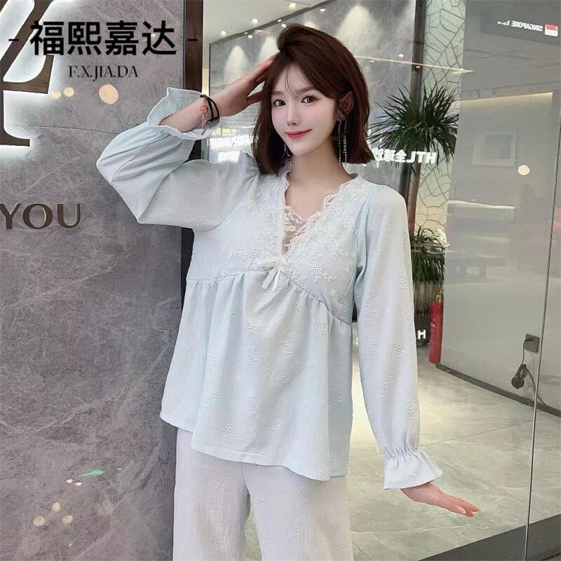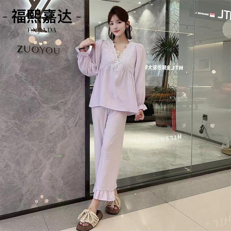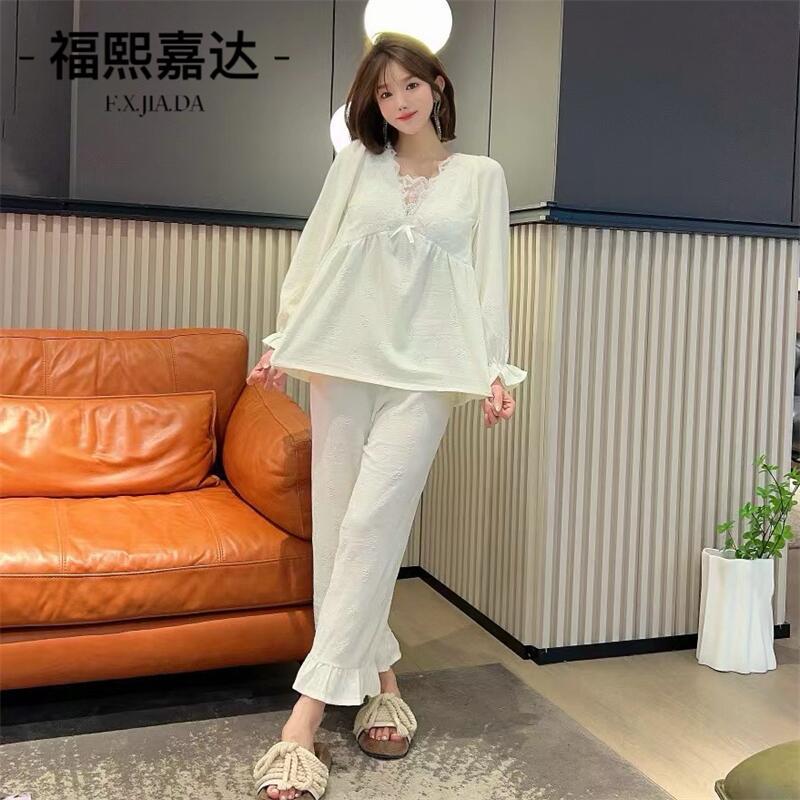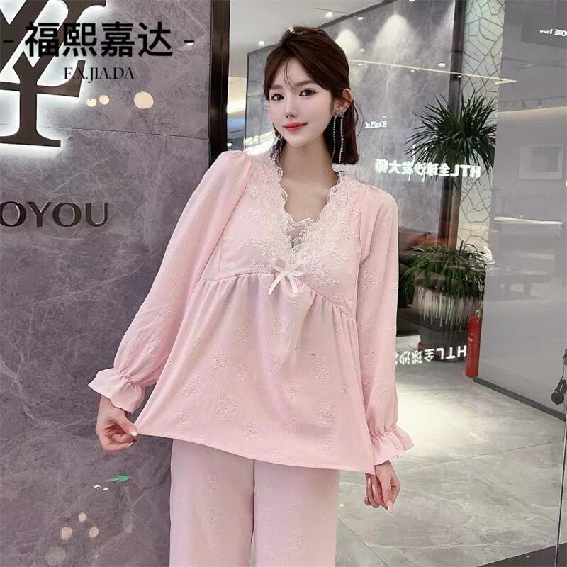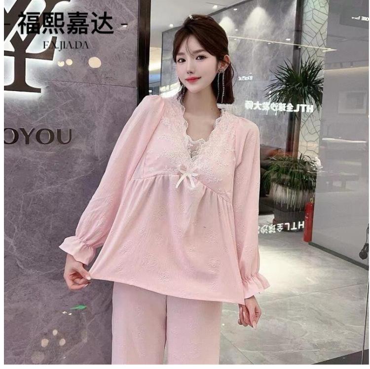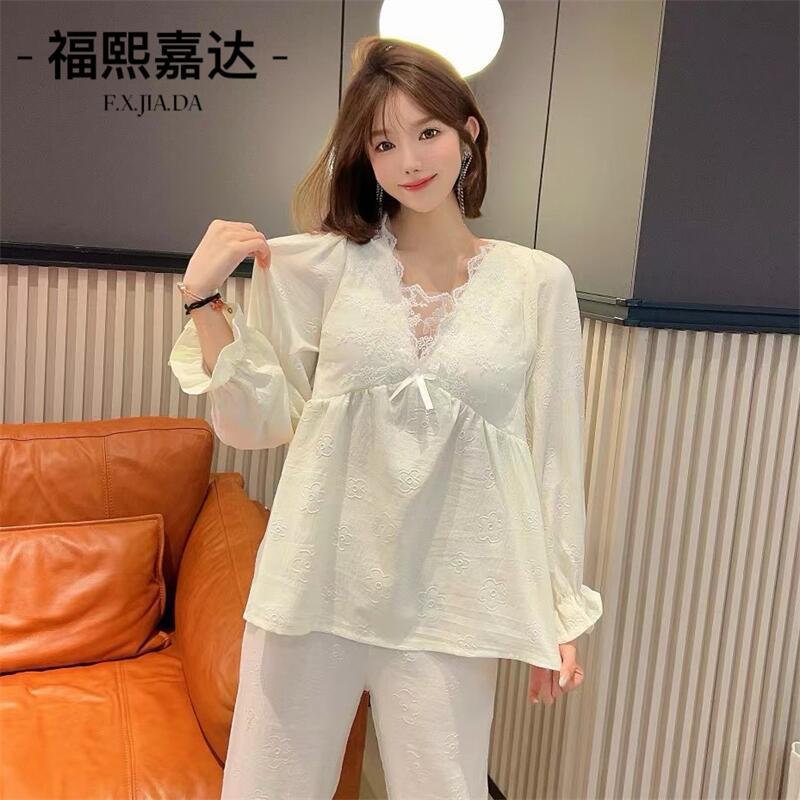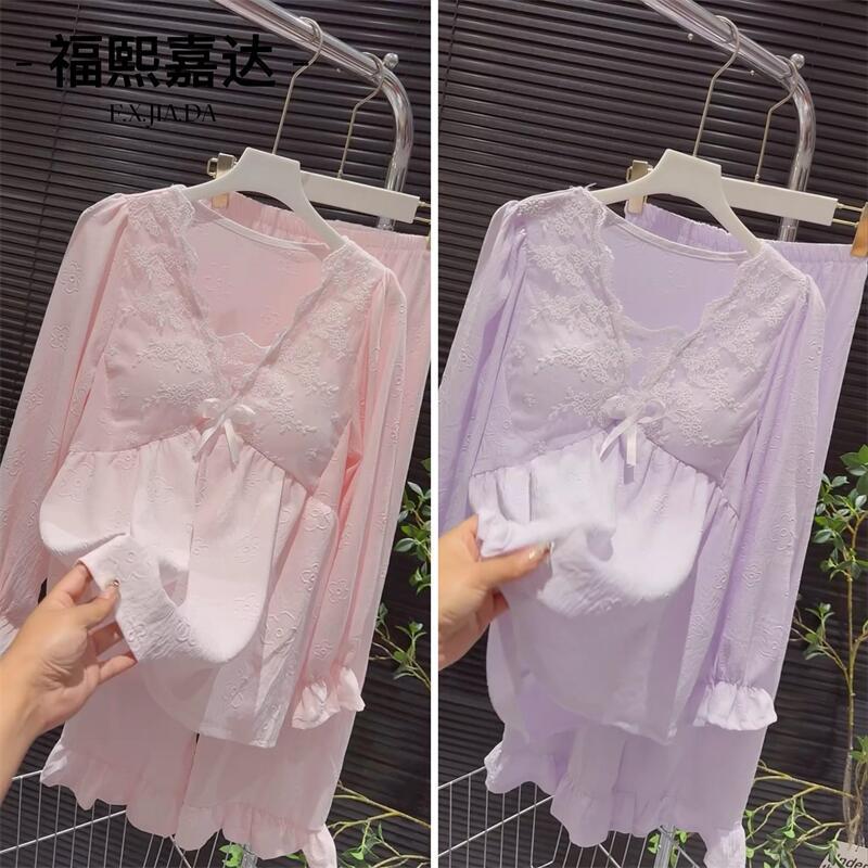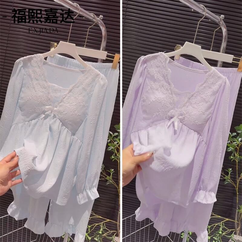 Otoño Nuevo Conjunto de Pijama para Mujer Viene con Almohadilla para el Pecho Holgado Talla Grande Manga Larga Encaje de Princesa Dulce Sexy Ropa para el Hogar