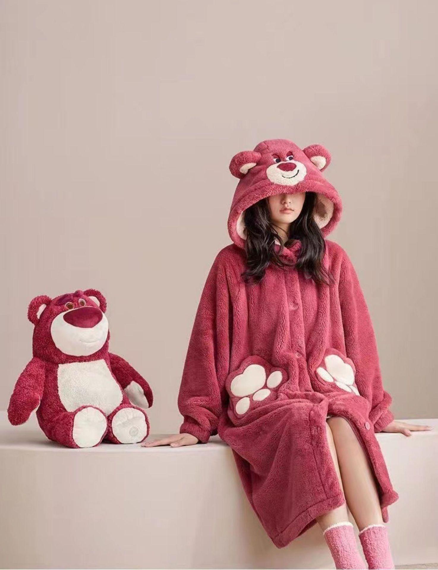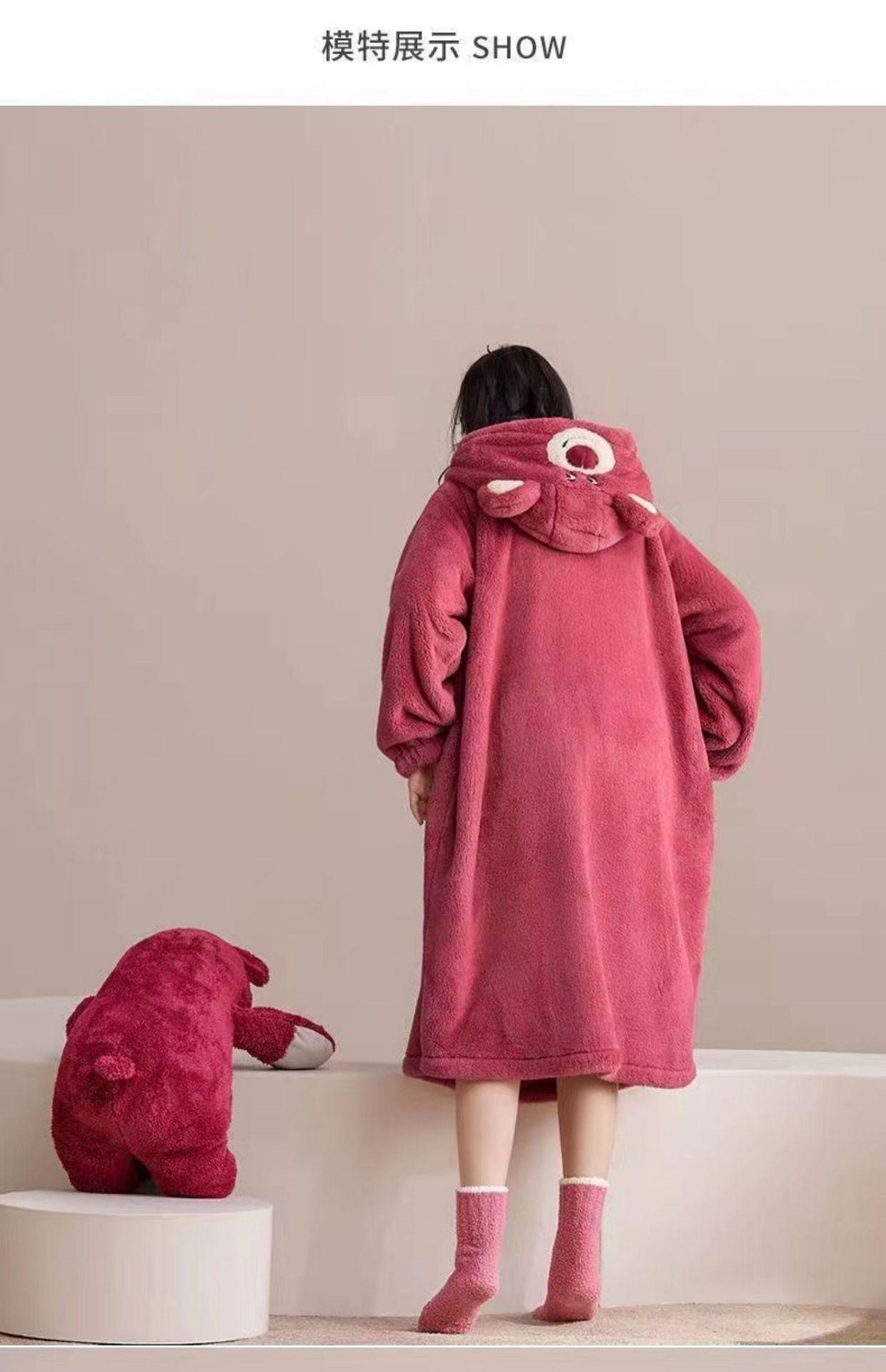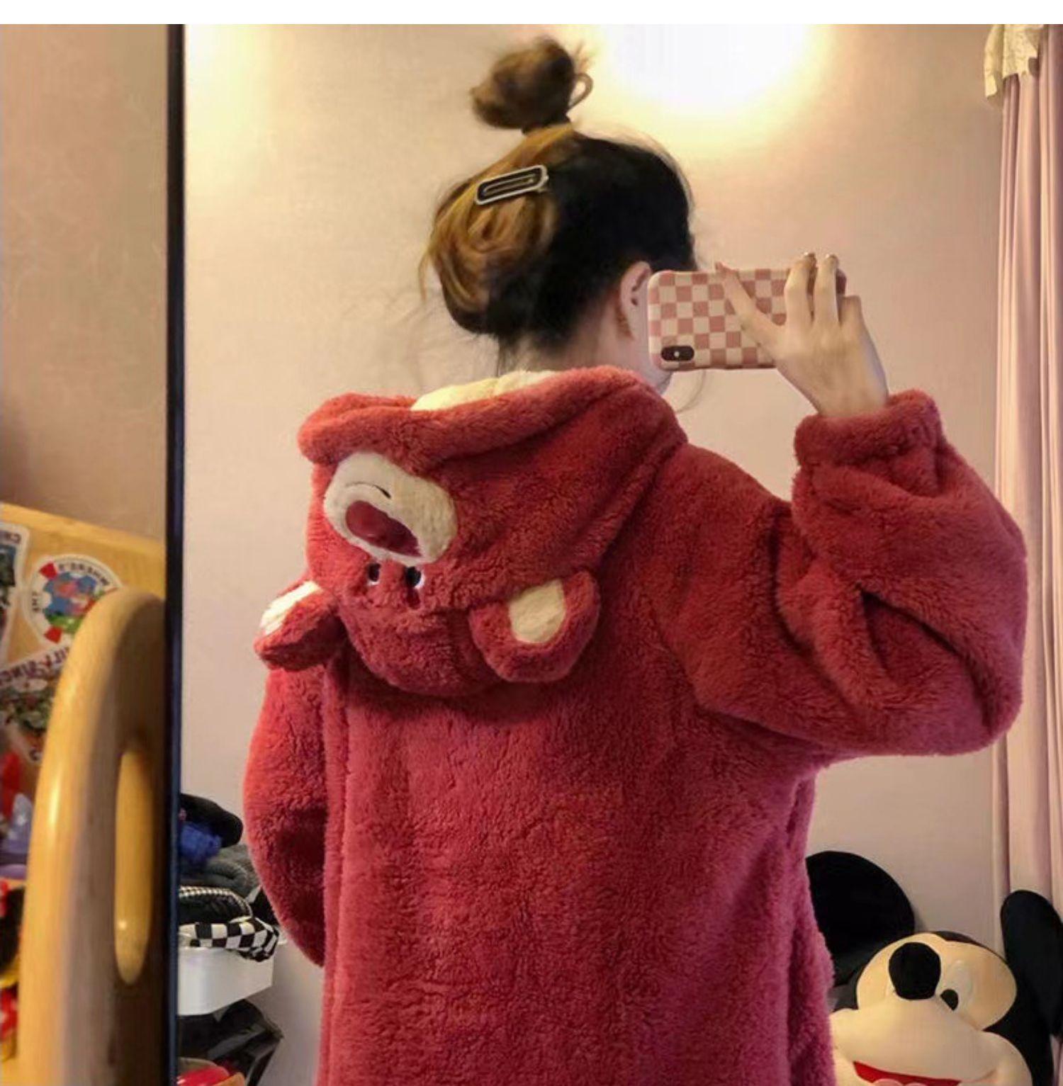 Camisón de Terciopelo Coral, Pijama Lindo de Oso Fresa de Dibujos Animados para Mujer, Traje de Invierno de Terciopelo Engrosado de Manga Larga que se Puede Usar Afuera