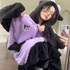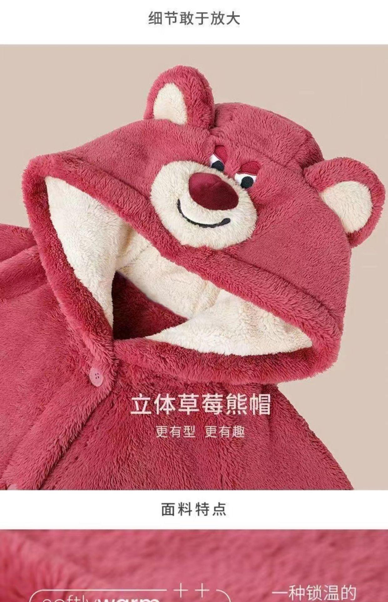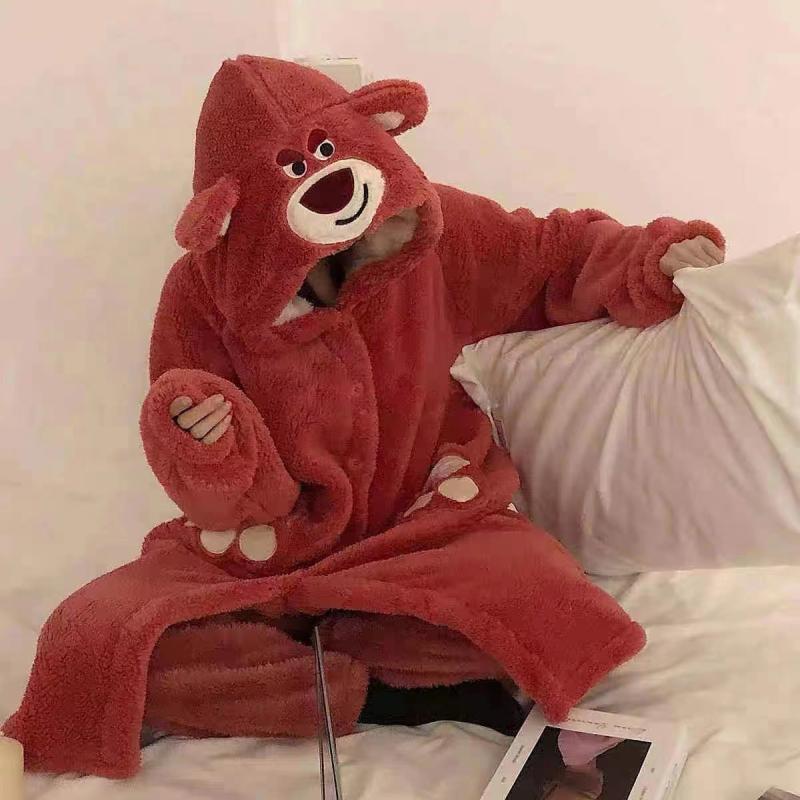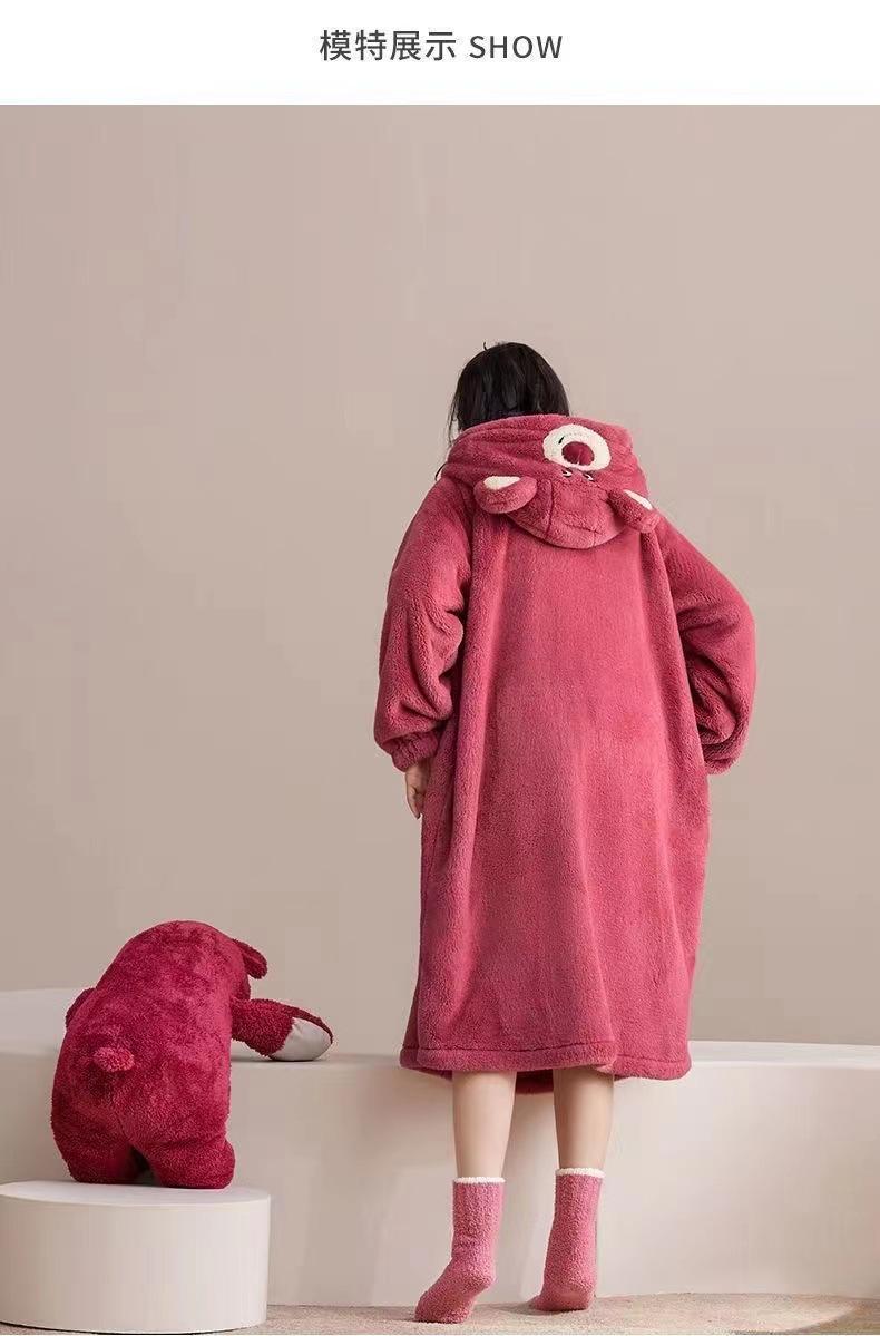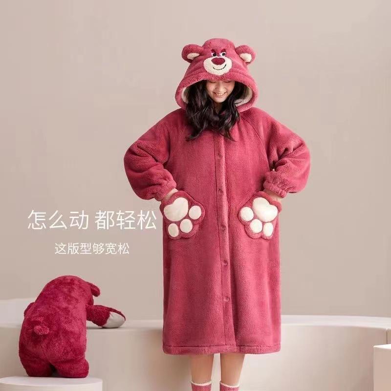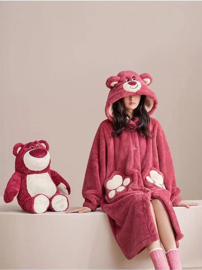 Camisón de Terciopelo Coral, Pijama Lindo de Oso Fresa de Dibujos Animados para Mujer, Traje de Invierno de Terciopelo Engrosado de Manga Larga que se Puede Usar Afuera