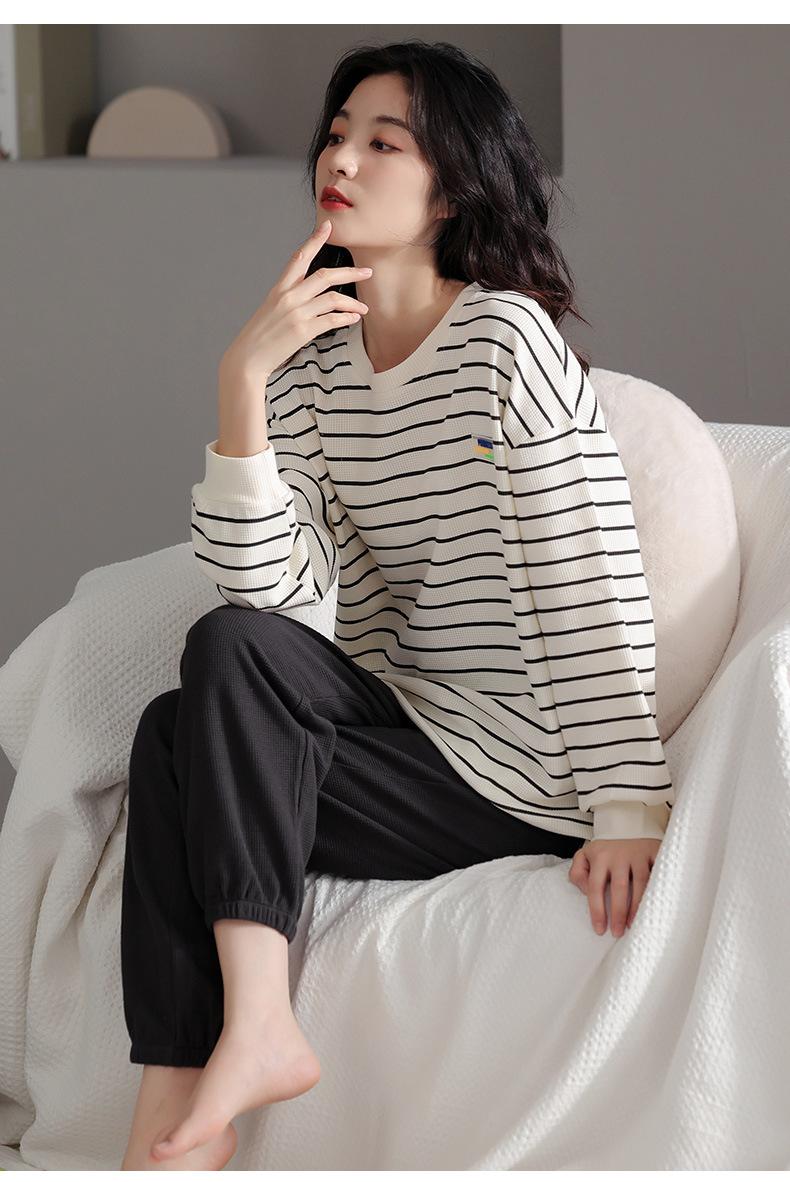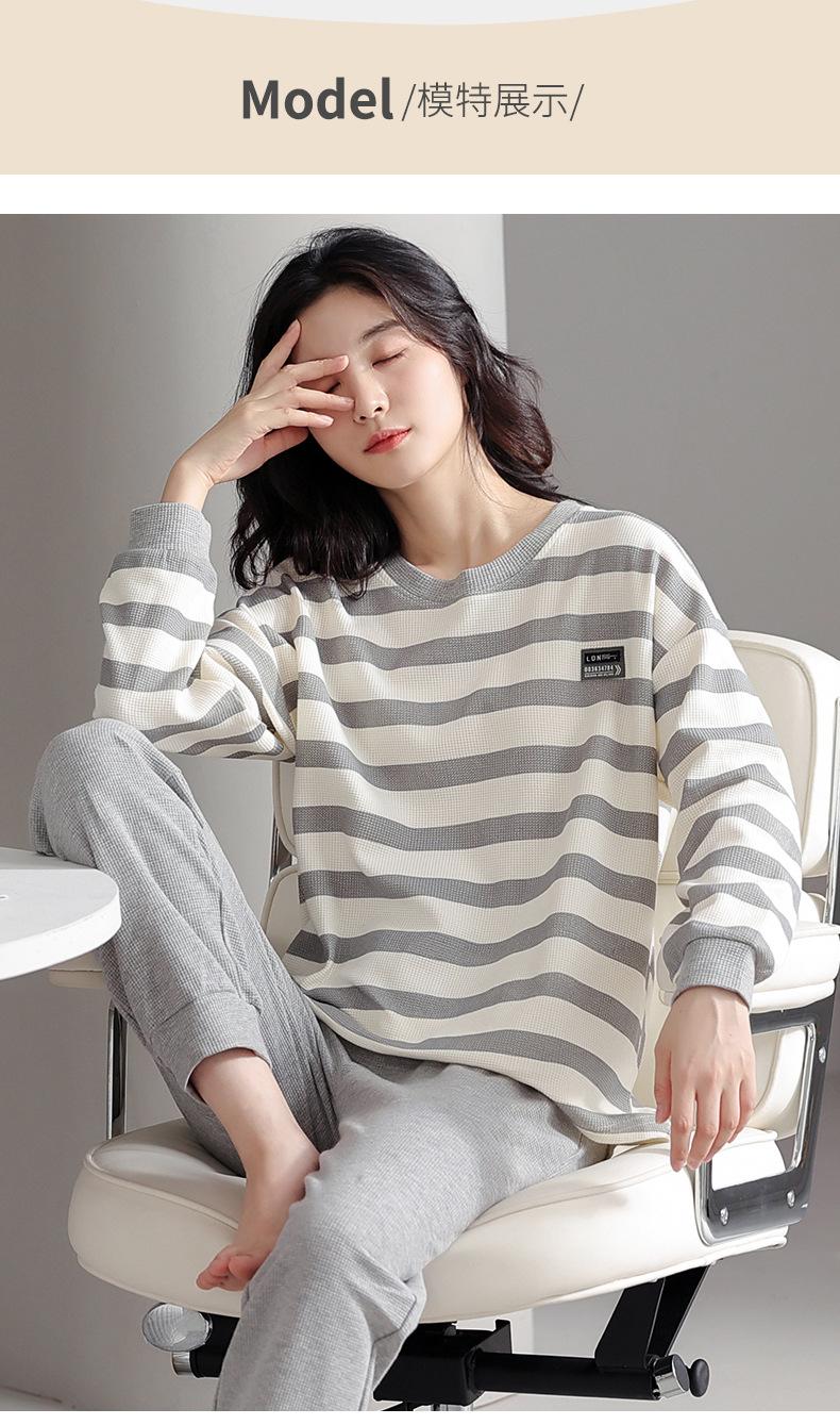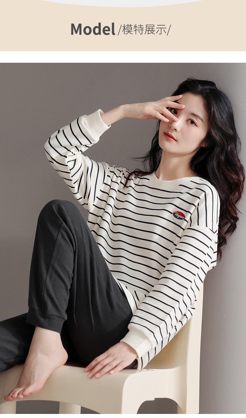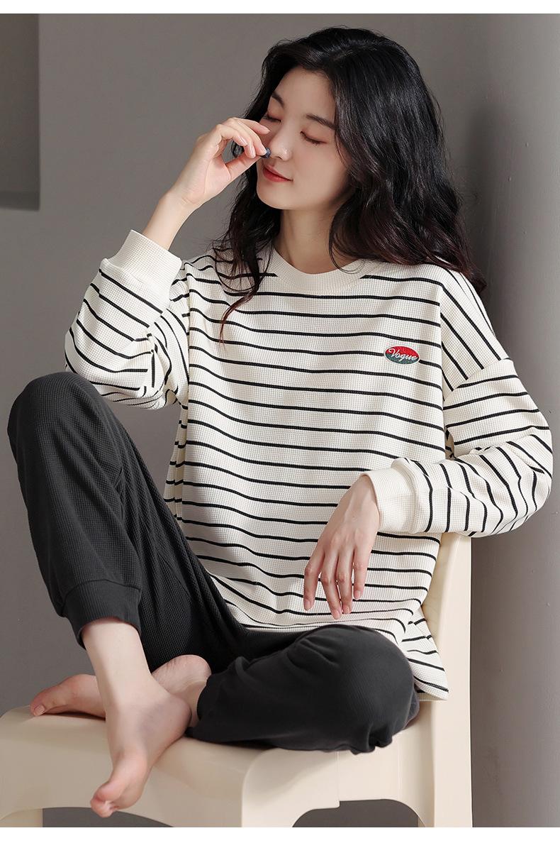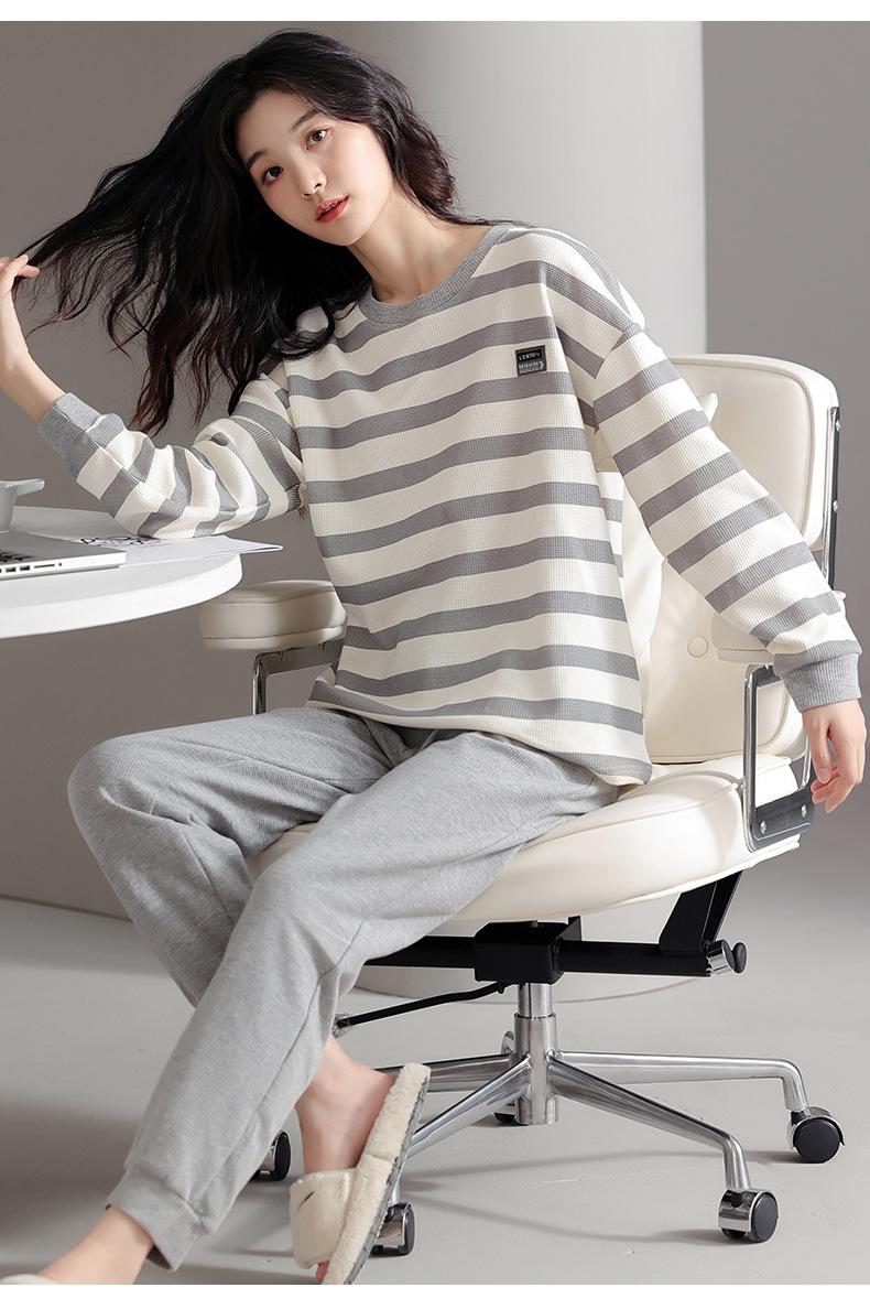 Pijamas de mujer de primavera y otoño de algodón puro de manga larga a rayas con cuello de gofre, ropa informal para el hogar, traje de primavera de talla grande