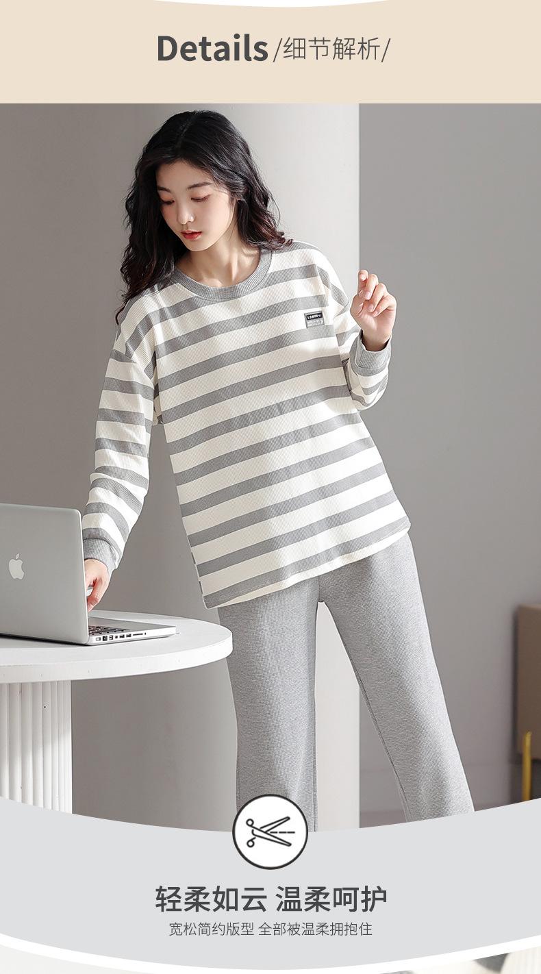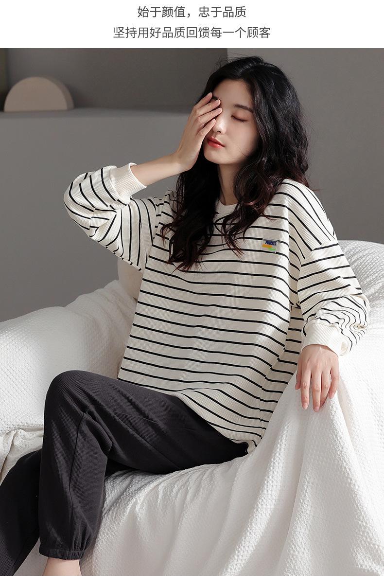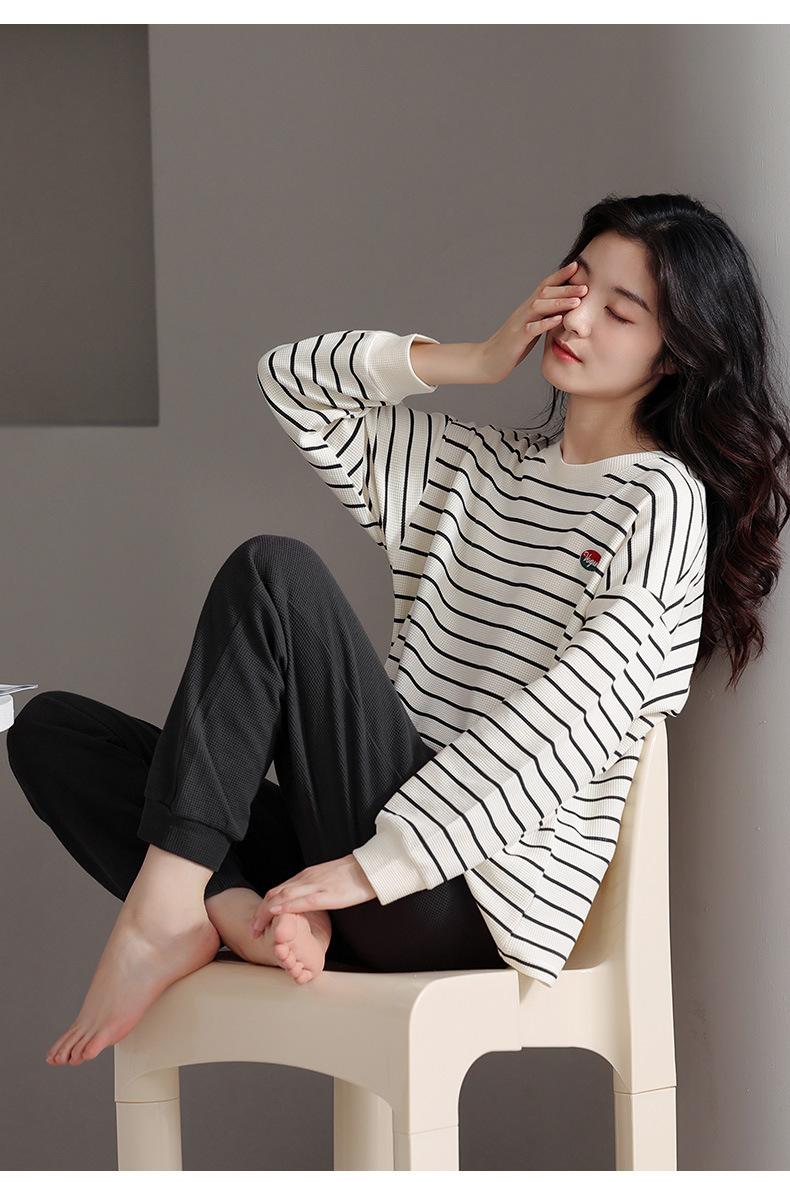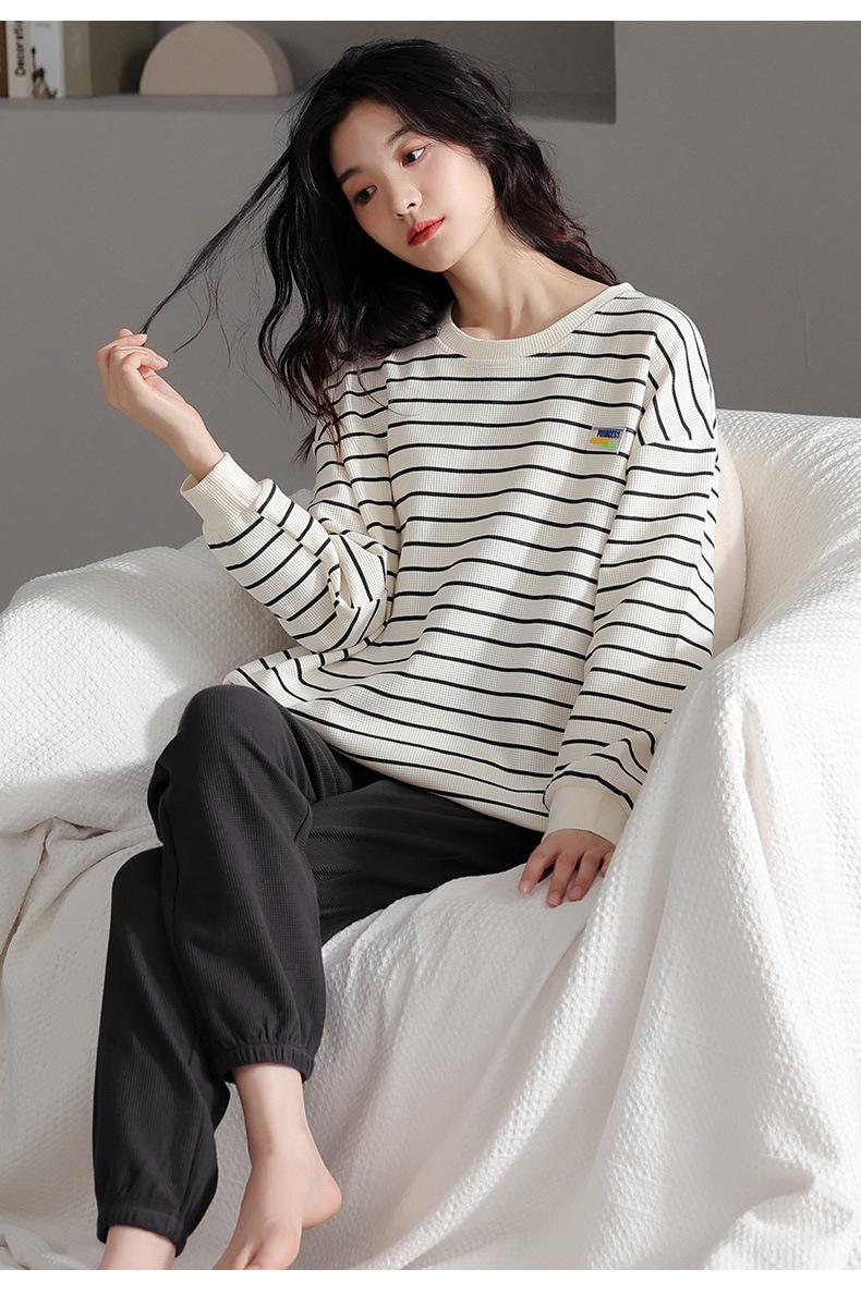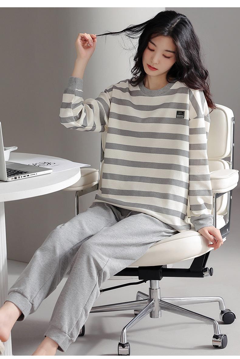 Pijamas de mujer de primavera y otoño de algodón puro de manga larga a rayas con cuello de gofre, ropa informal para el hogar, traje de primavera de talla grande